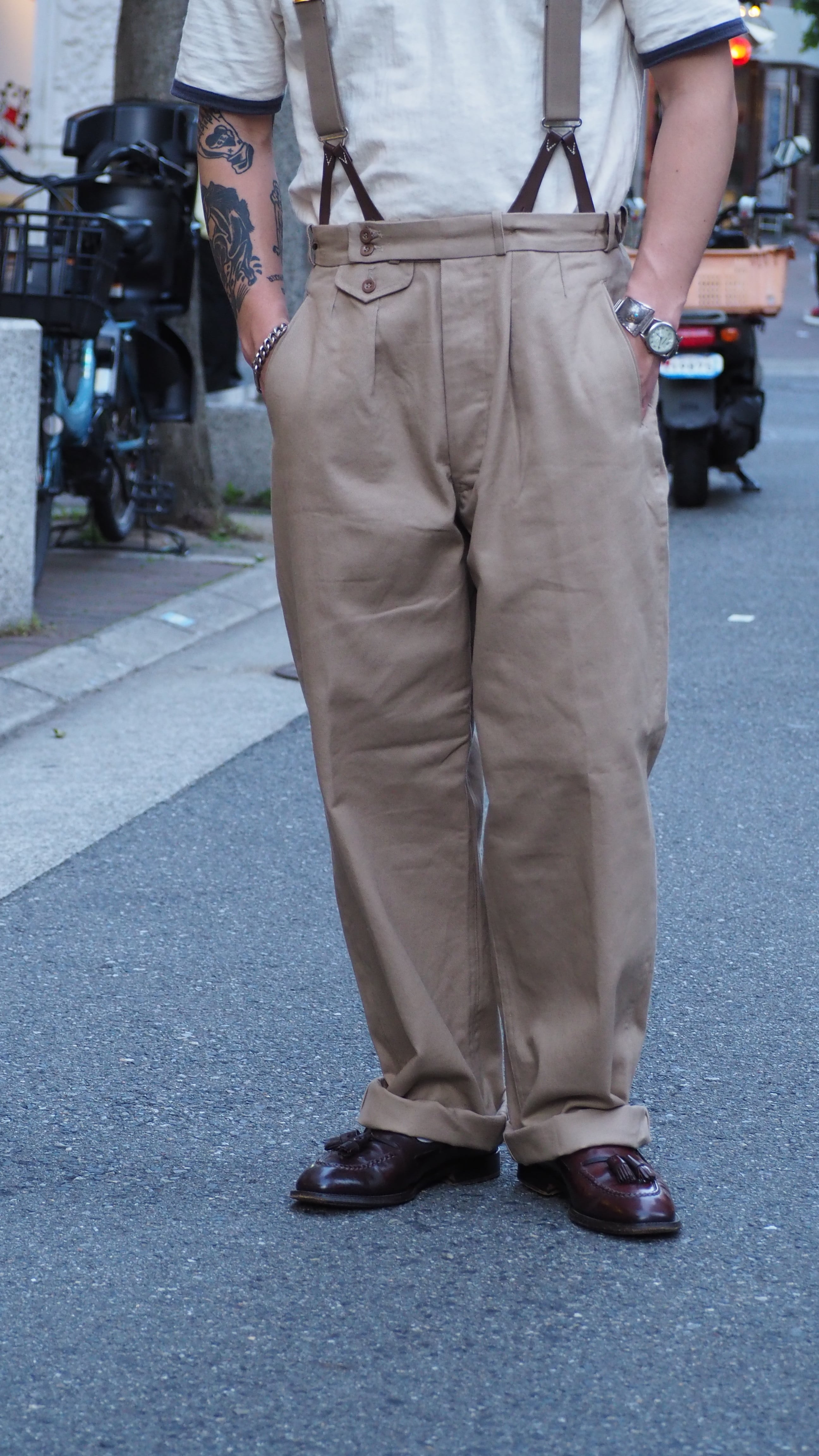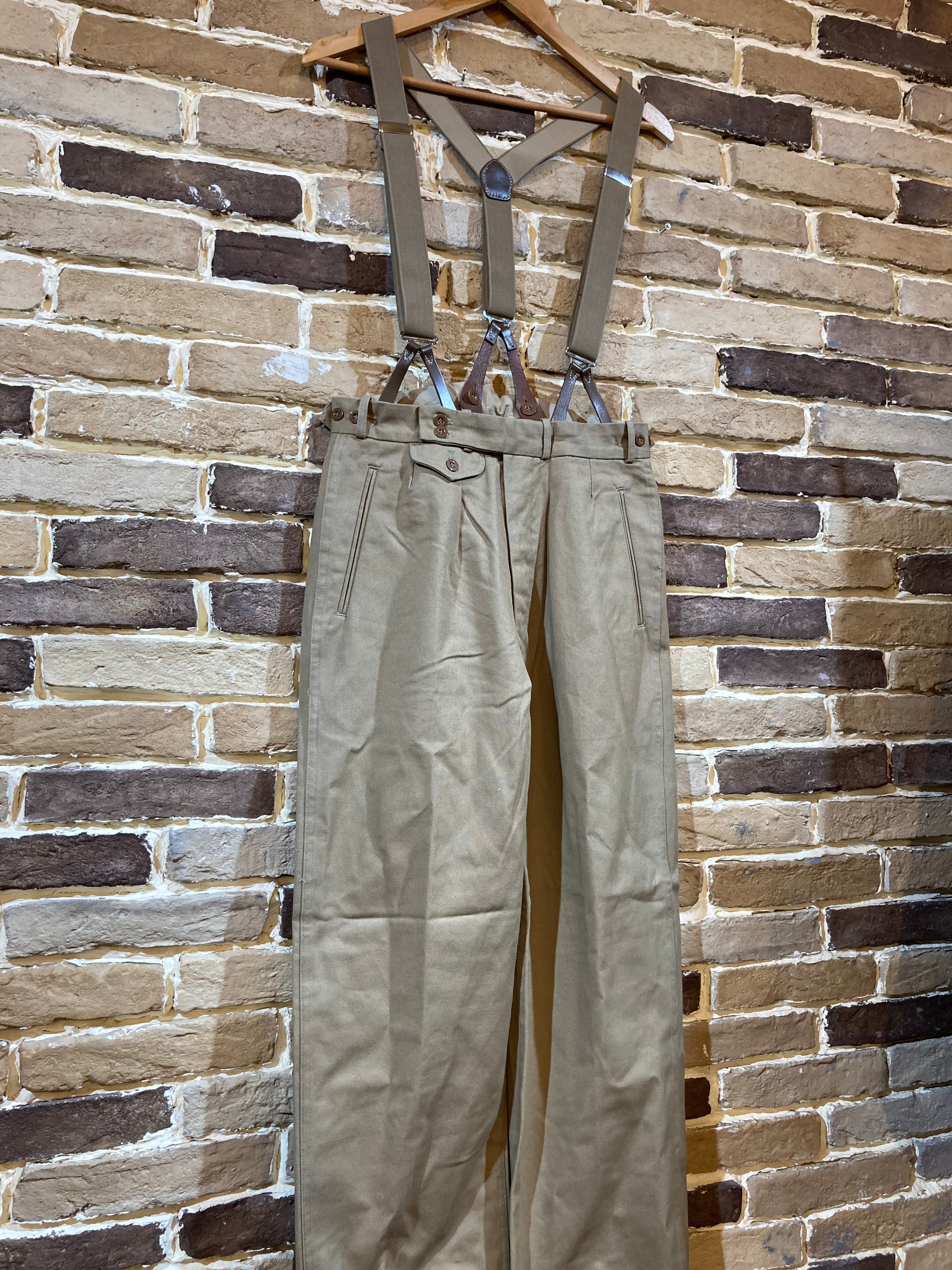 2段のベルトボタン、海中時計を入れるクモフタ付のウオッチポケットベルトループを兼ねたサスペンダーストラップ等がこのパンツの特徴となります。