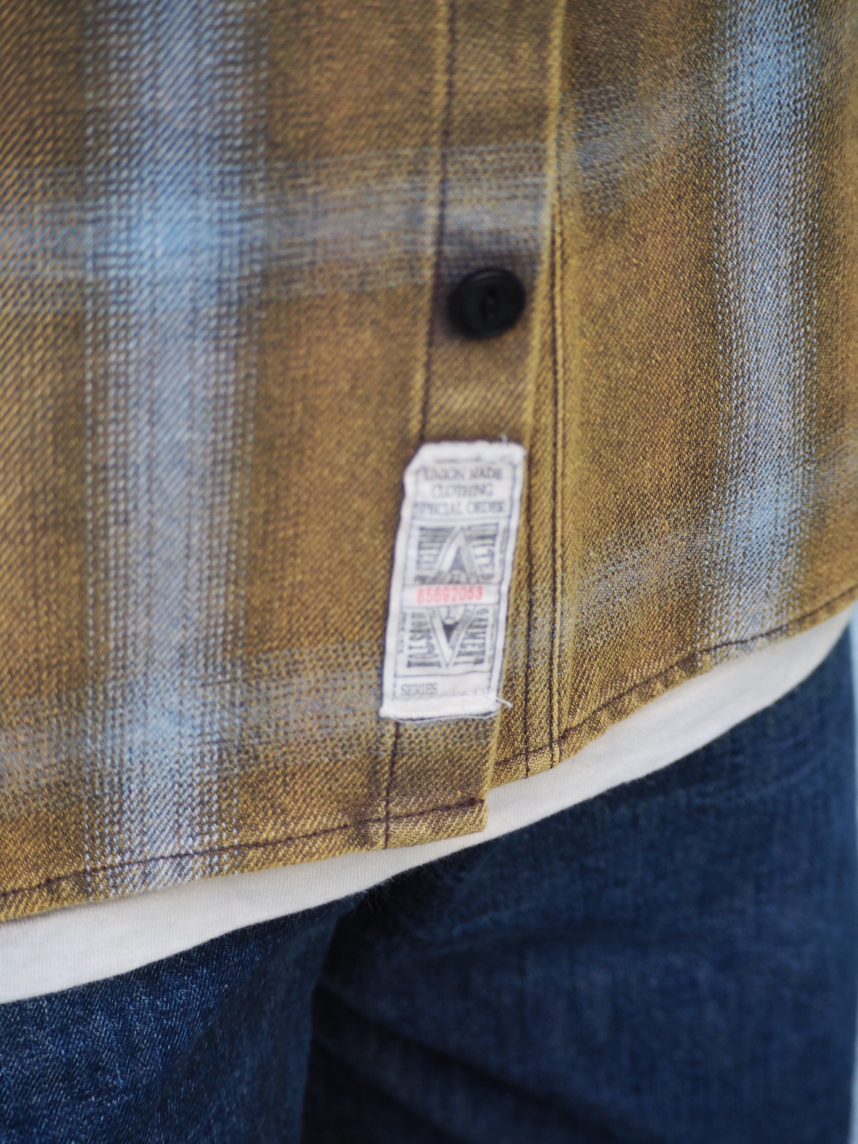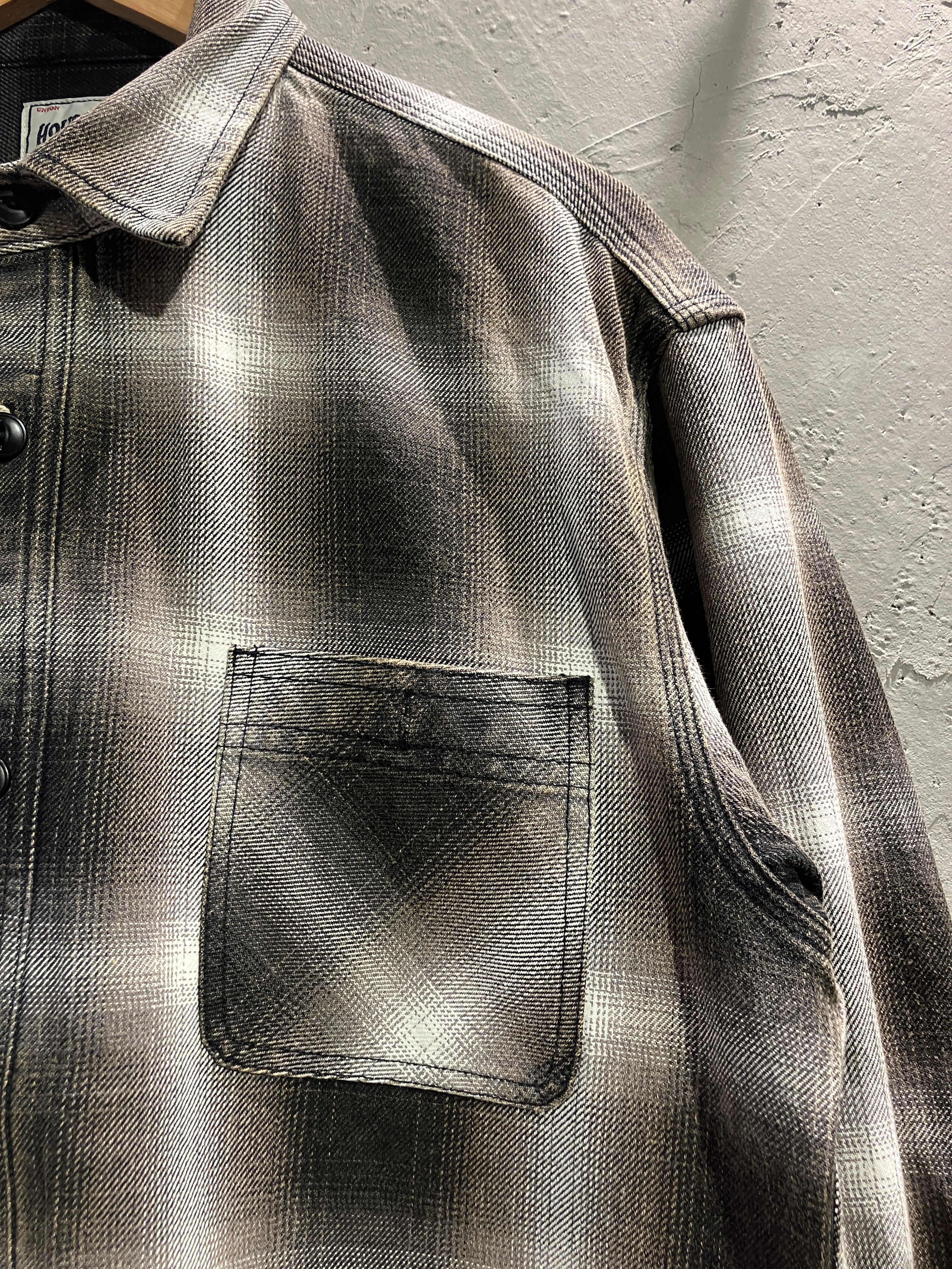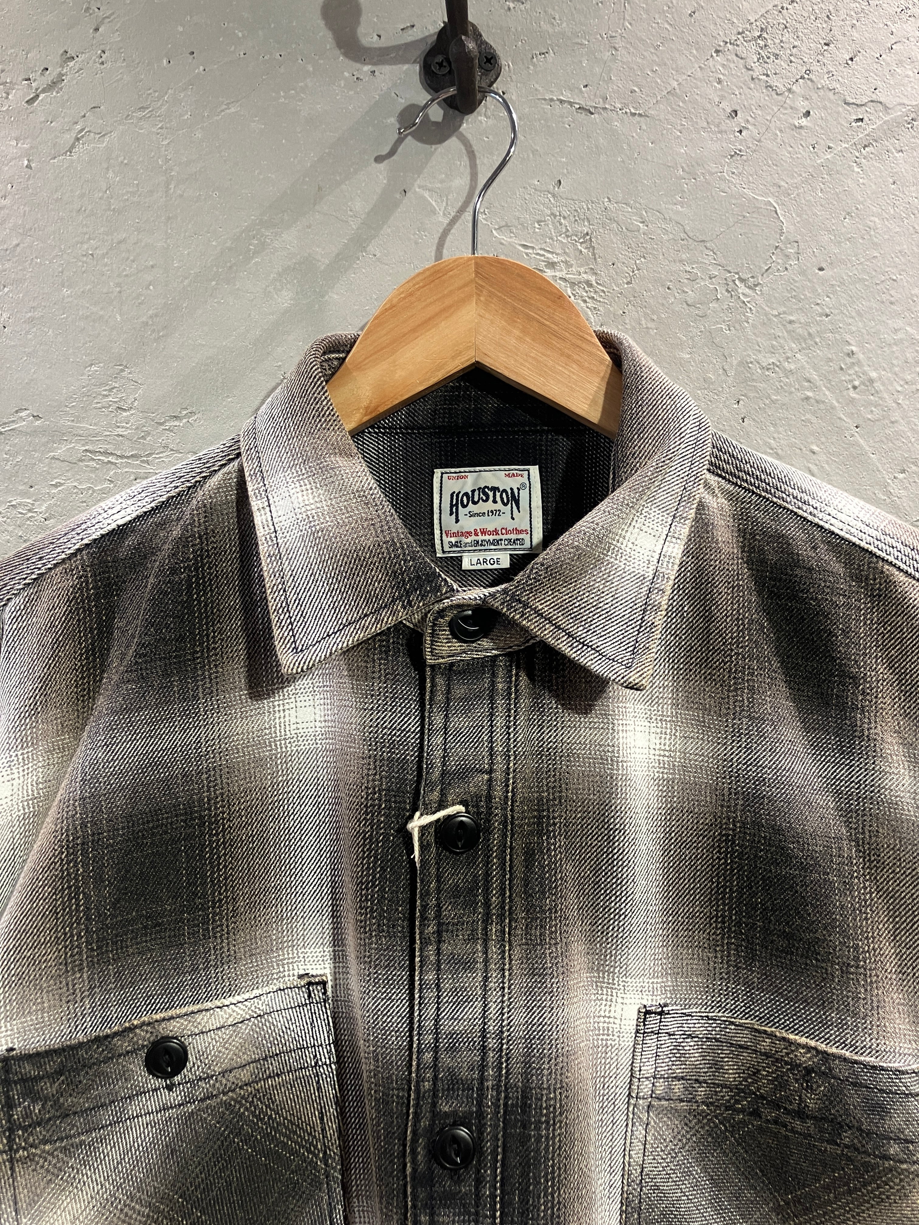 HOUSTON秋冬の定番アイテム【ビエラシャツシリーズ】。ヘヴィーオンスなビエラ生地を使用し、着込むほどに経年変化も楽しめる。トリプルステッチやユニオンチケットなどビンテージライクなディティールが満載。通常細い糸を使用して作成するオンブレチェック柄を、無理やり太い糸で織り上げて表現し、長年着用したかのようなヴィンテージ加工が施されている。