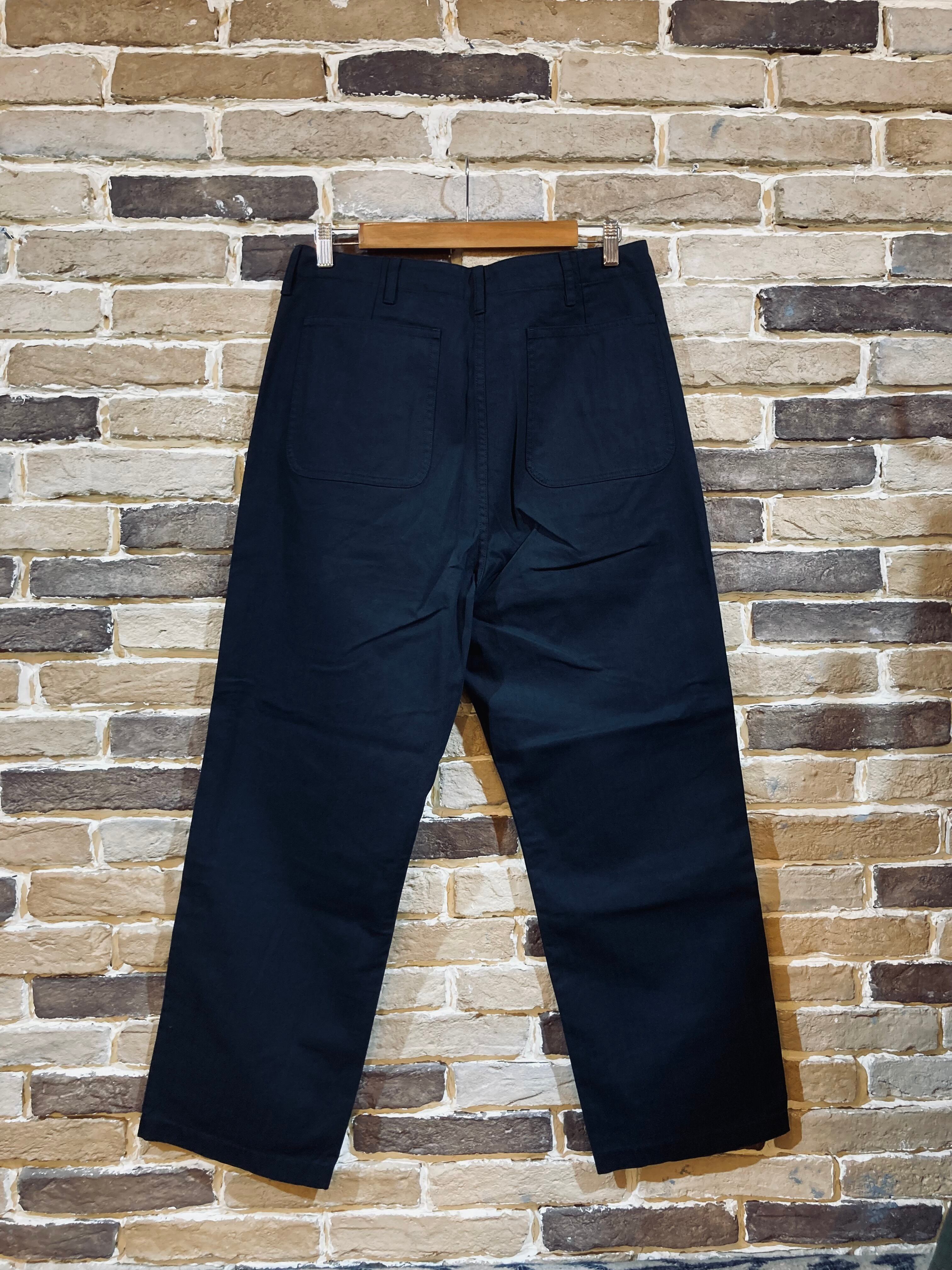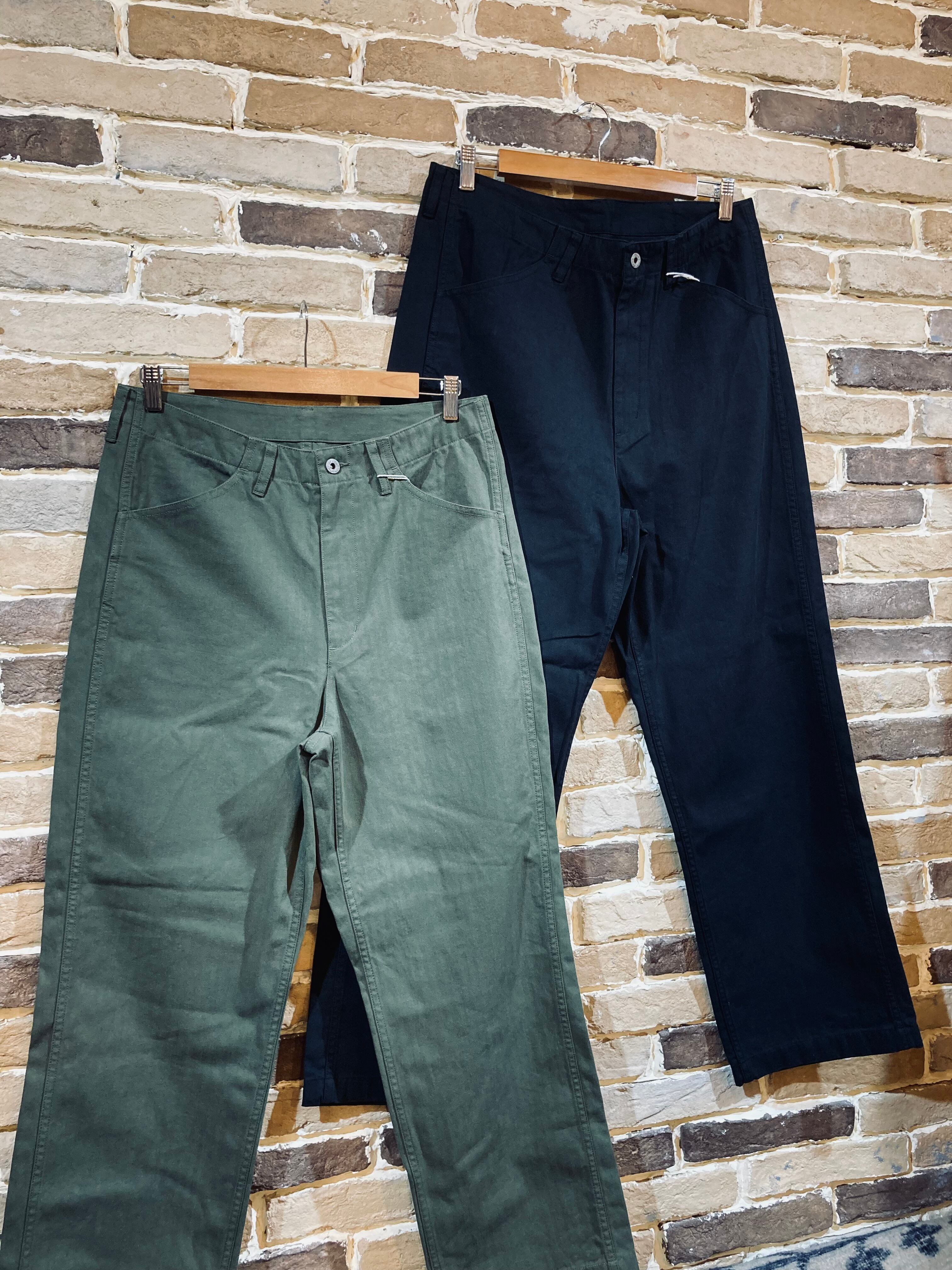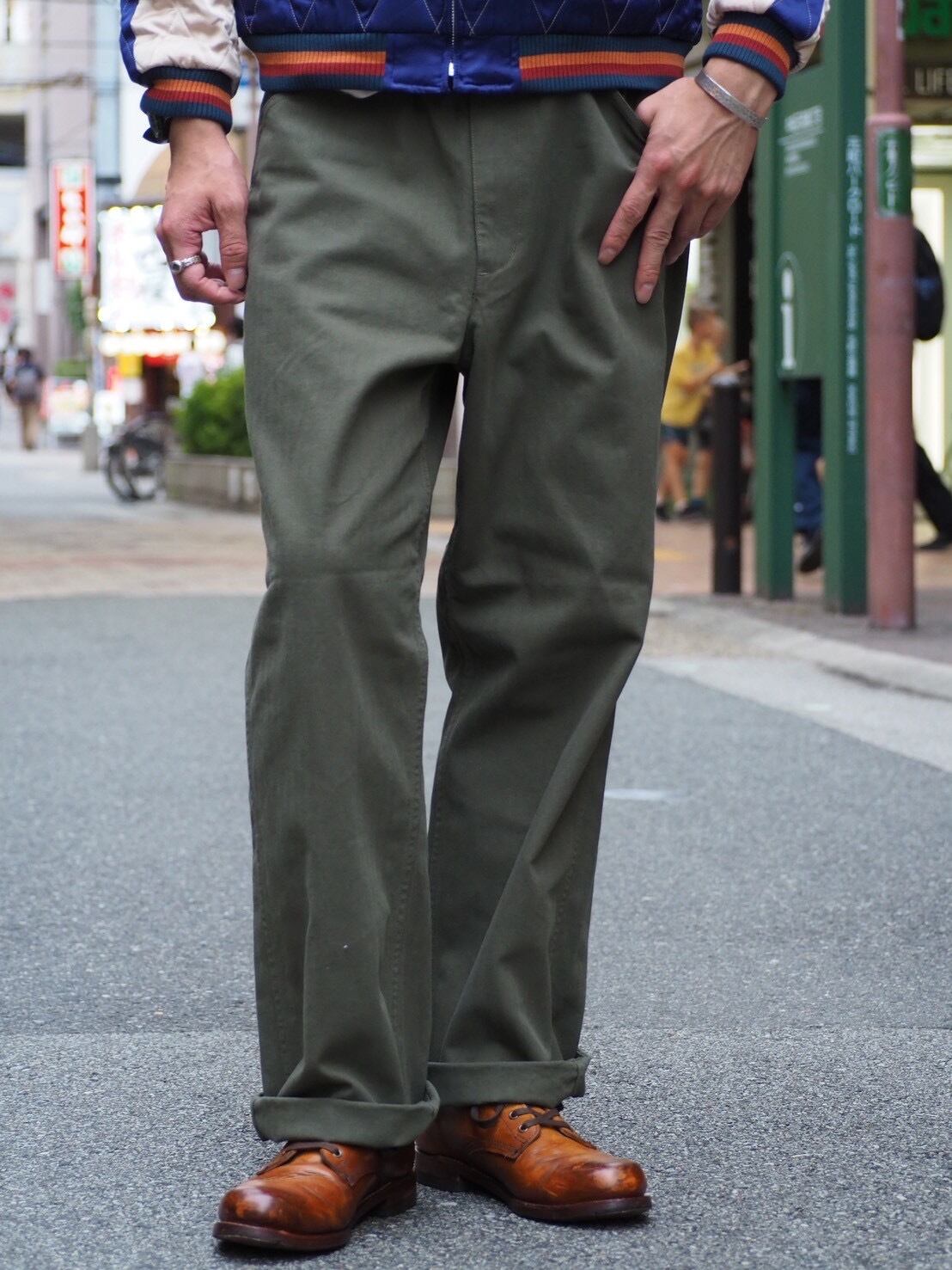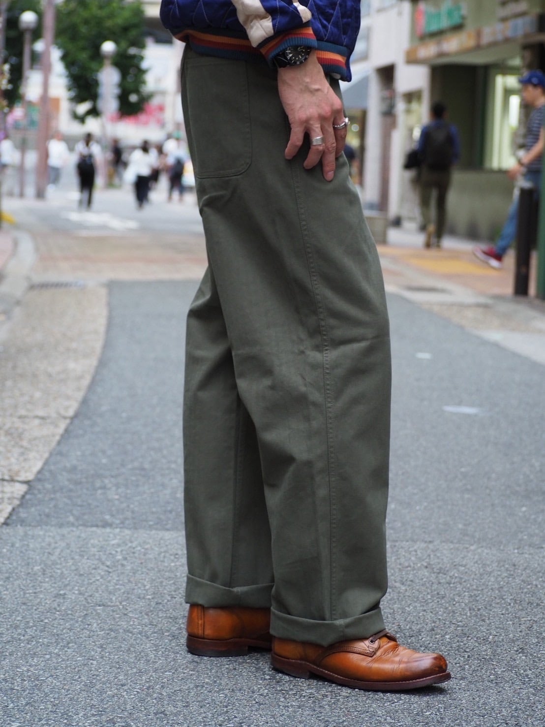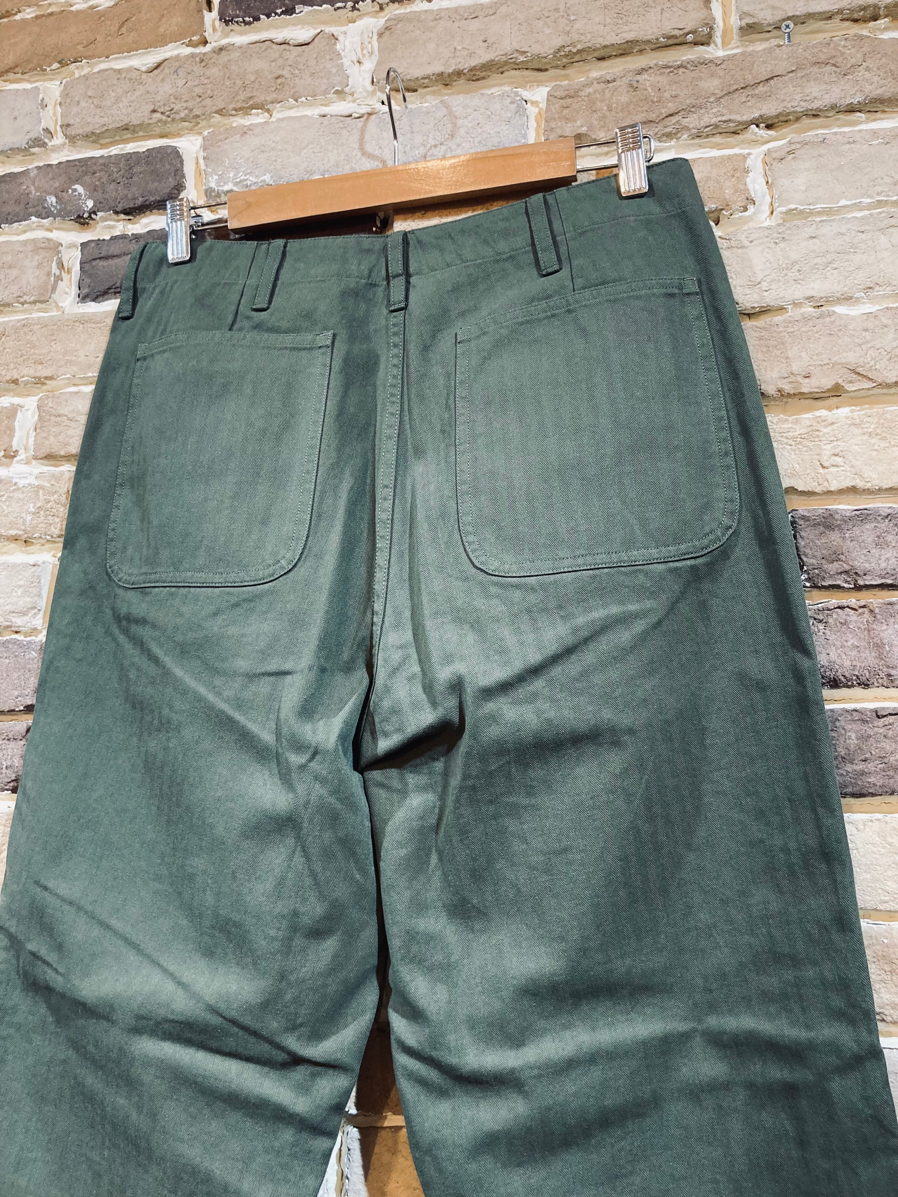 1940年代のアメリカ軍ユーティリティパンツをベースにデザインした、ミリタリーテイストのトラウザーズです。 上品な光沢と表情のあるコットン100%のヘリンボーンツイル生地を採用し、無骨さの中に洗練された印象を与えます。