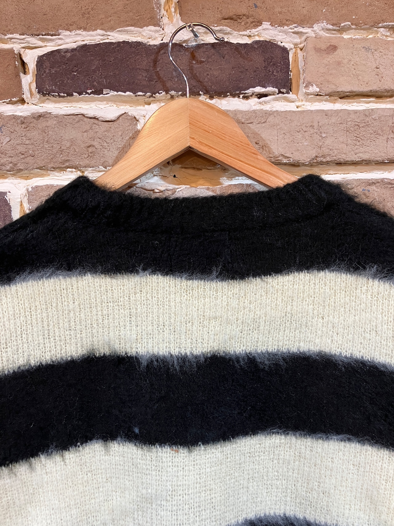 ダブルジャガードで織られた、ボーダー柄のモヘアタッチのクルーネックセーター。