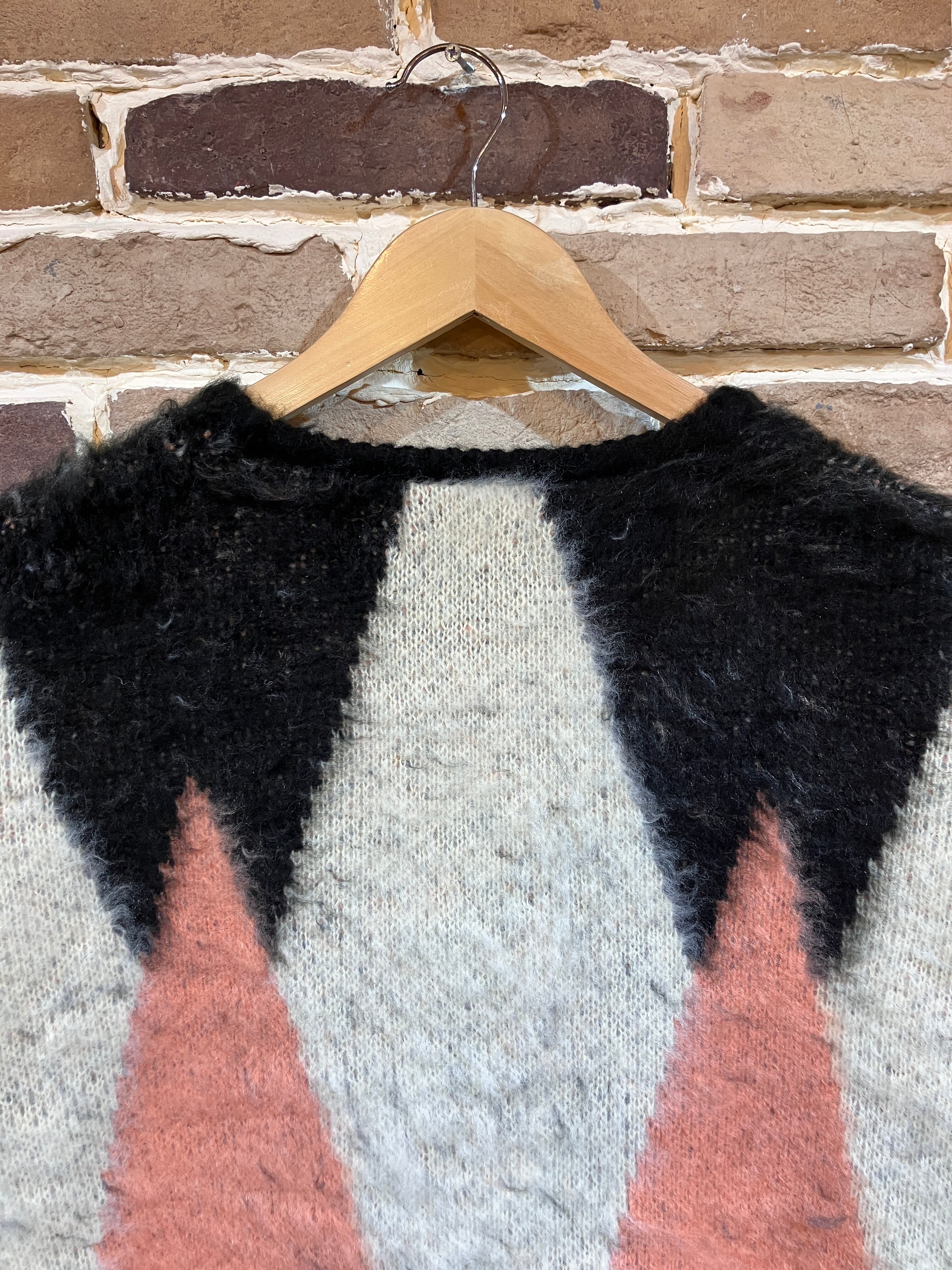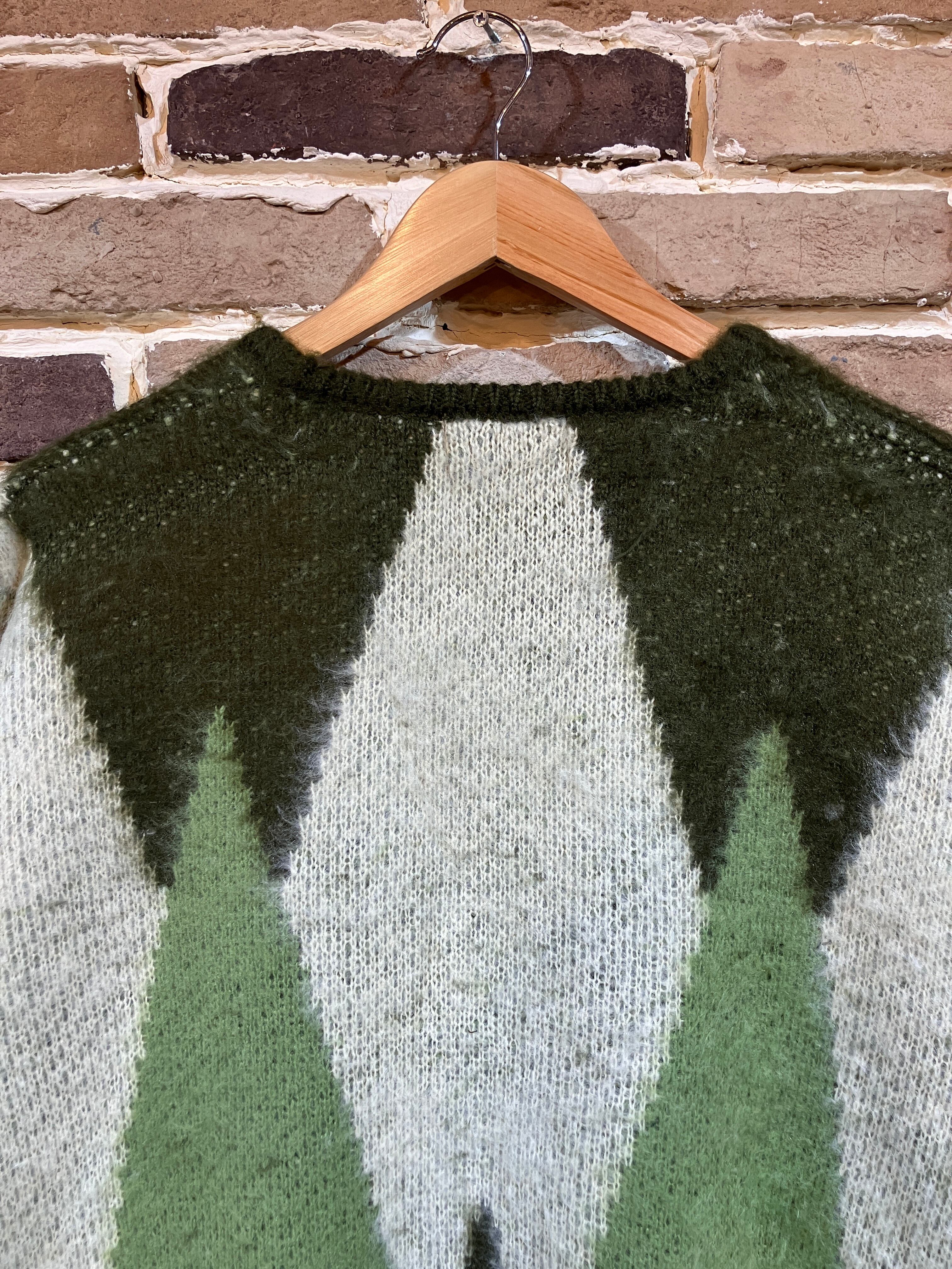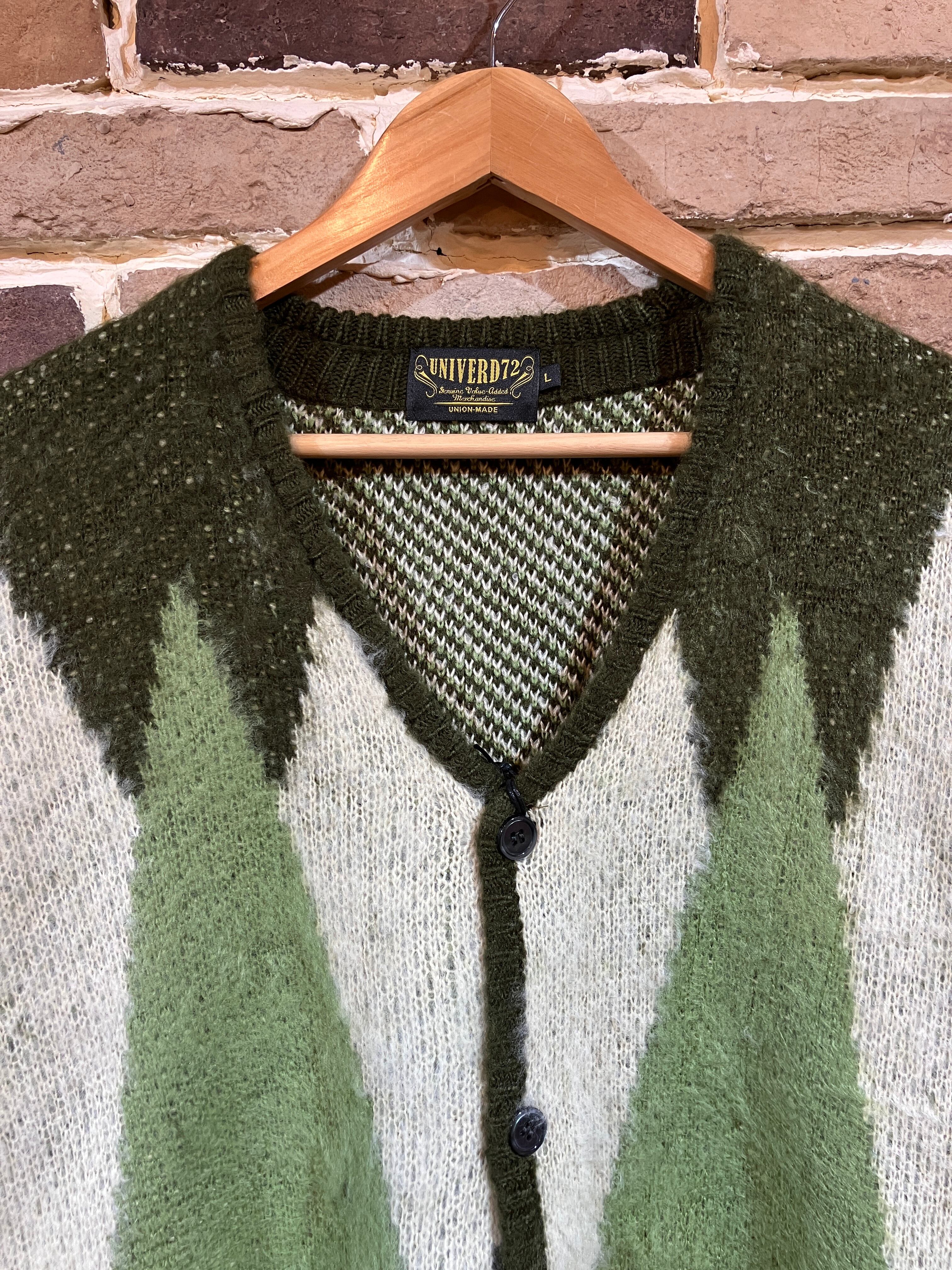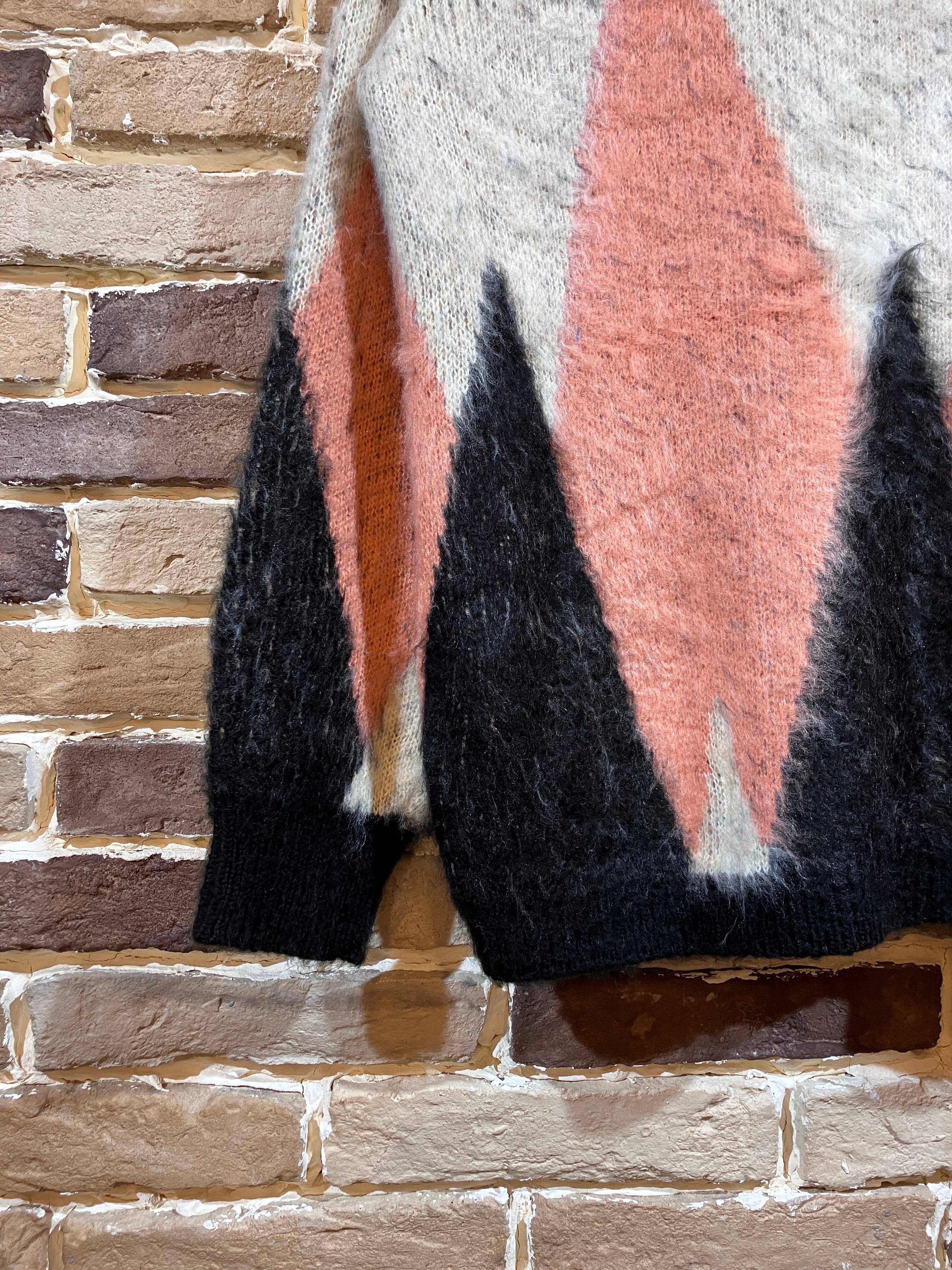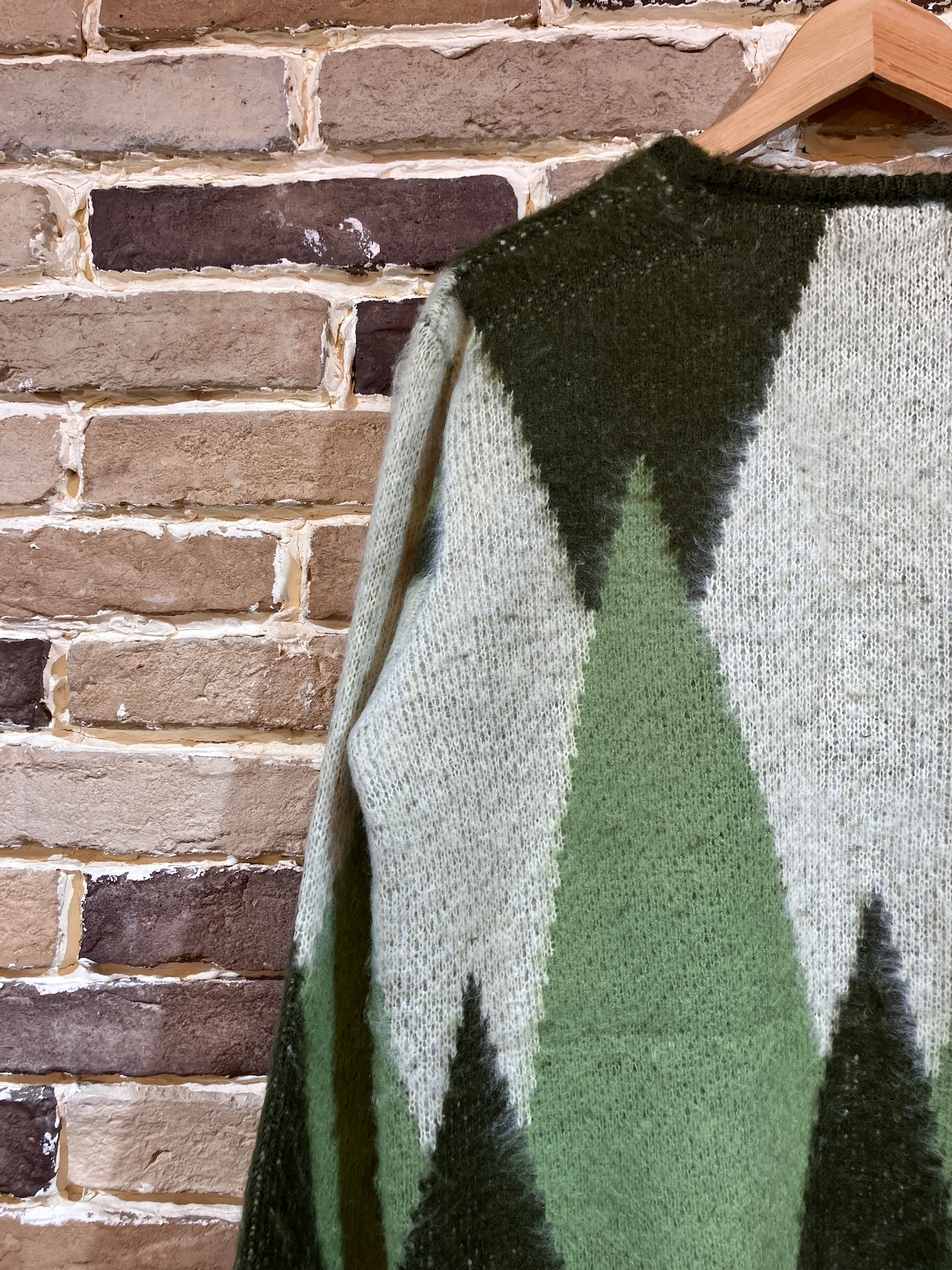 ダブルジャガードでおられた、秋冬らしい季節感も感じられる色使いのダイヤ柄カーディガン。