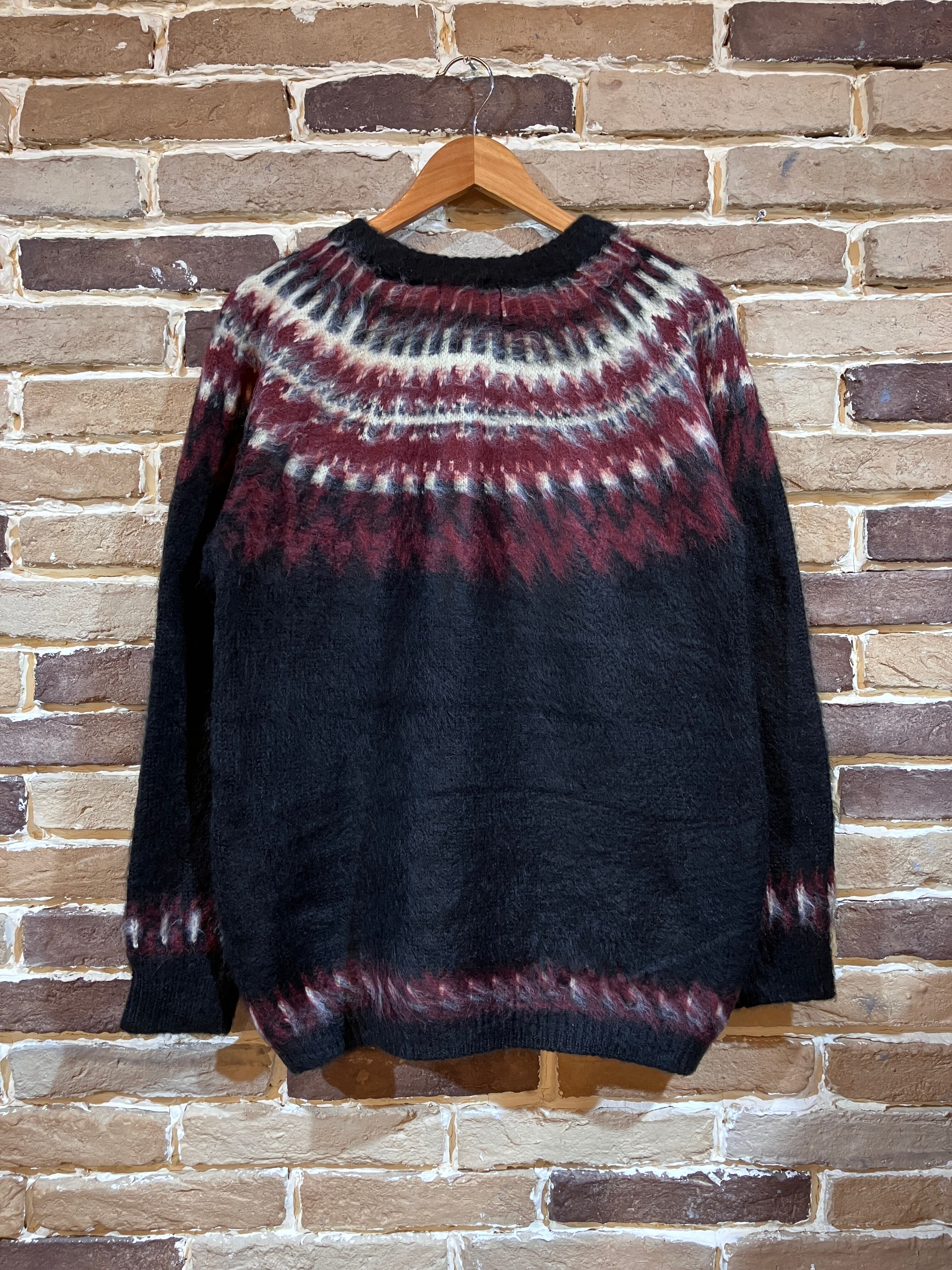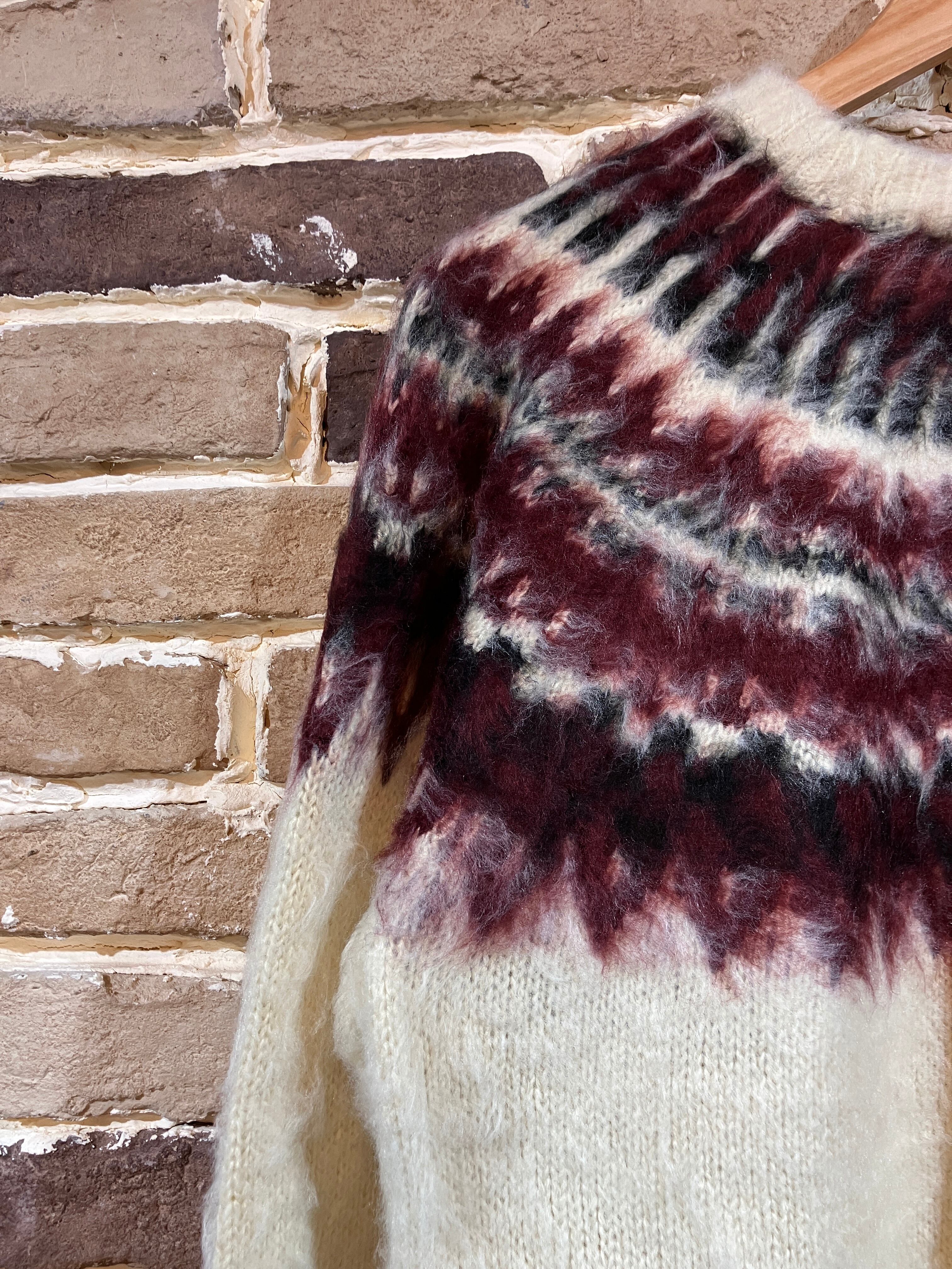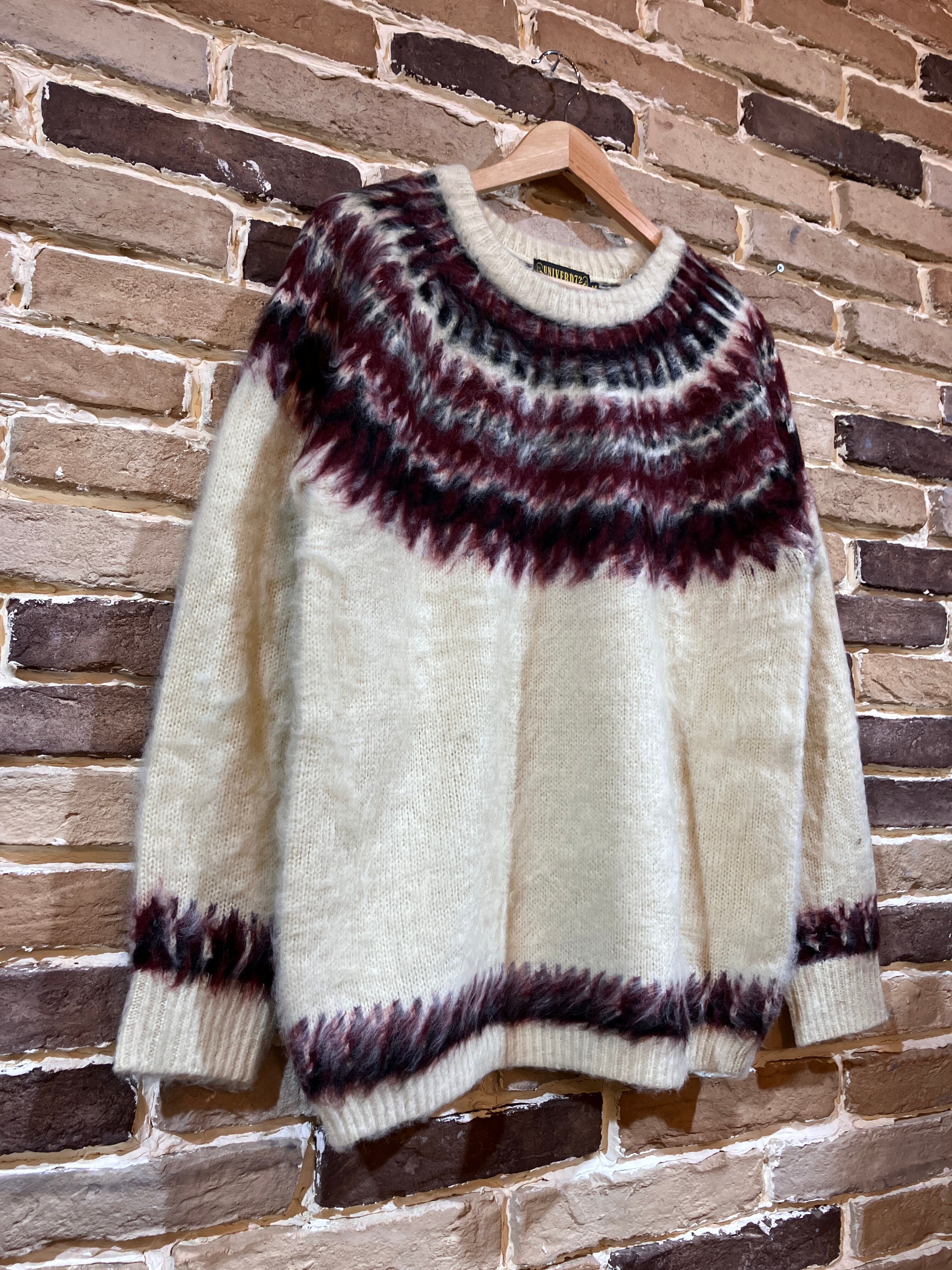 ダブルジャガードで織られた、秋冬らしい季節感も感じられる色使いのノルディック柄のモヘアタッチクルーネックセーター。