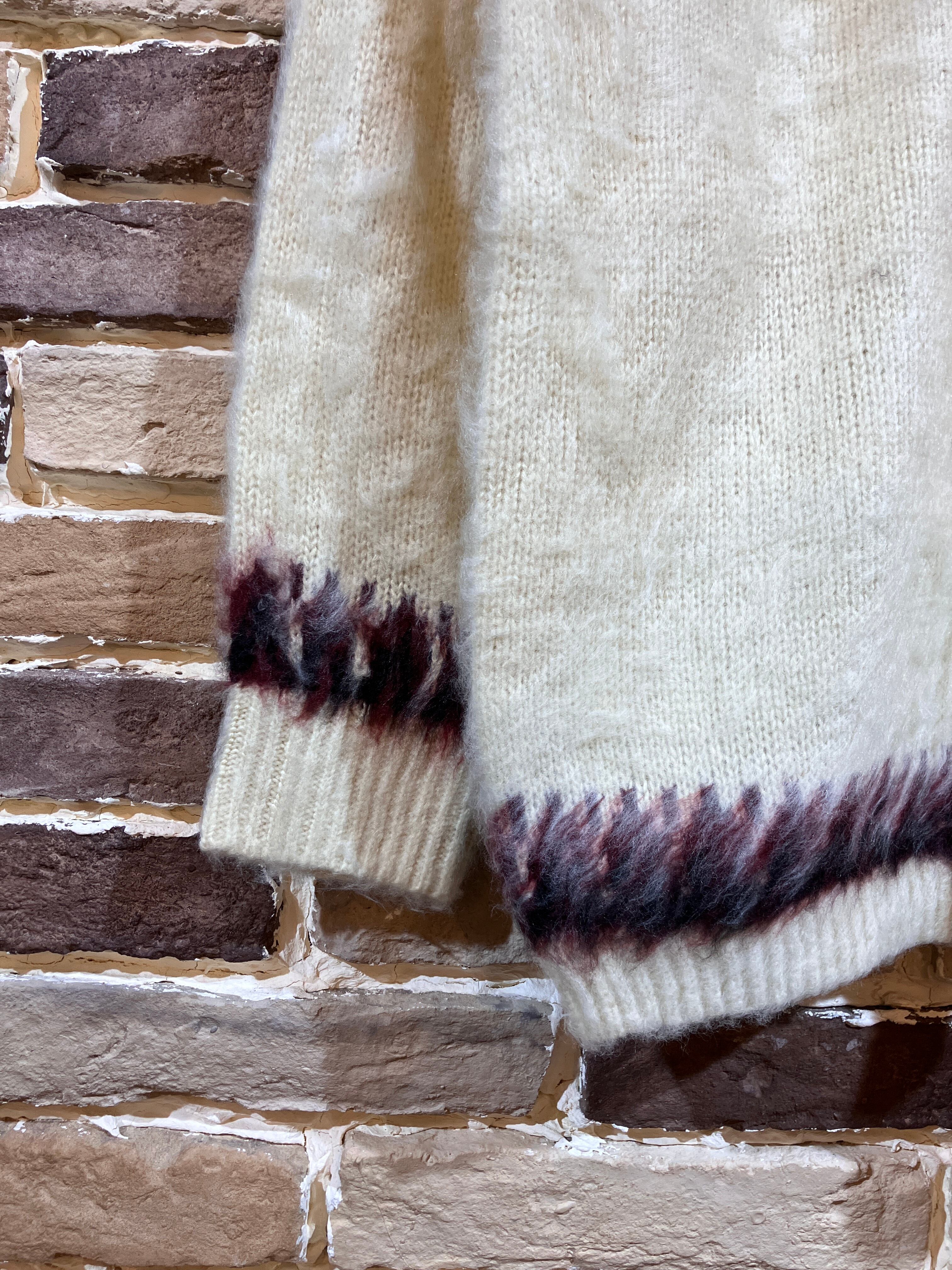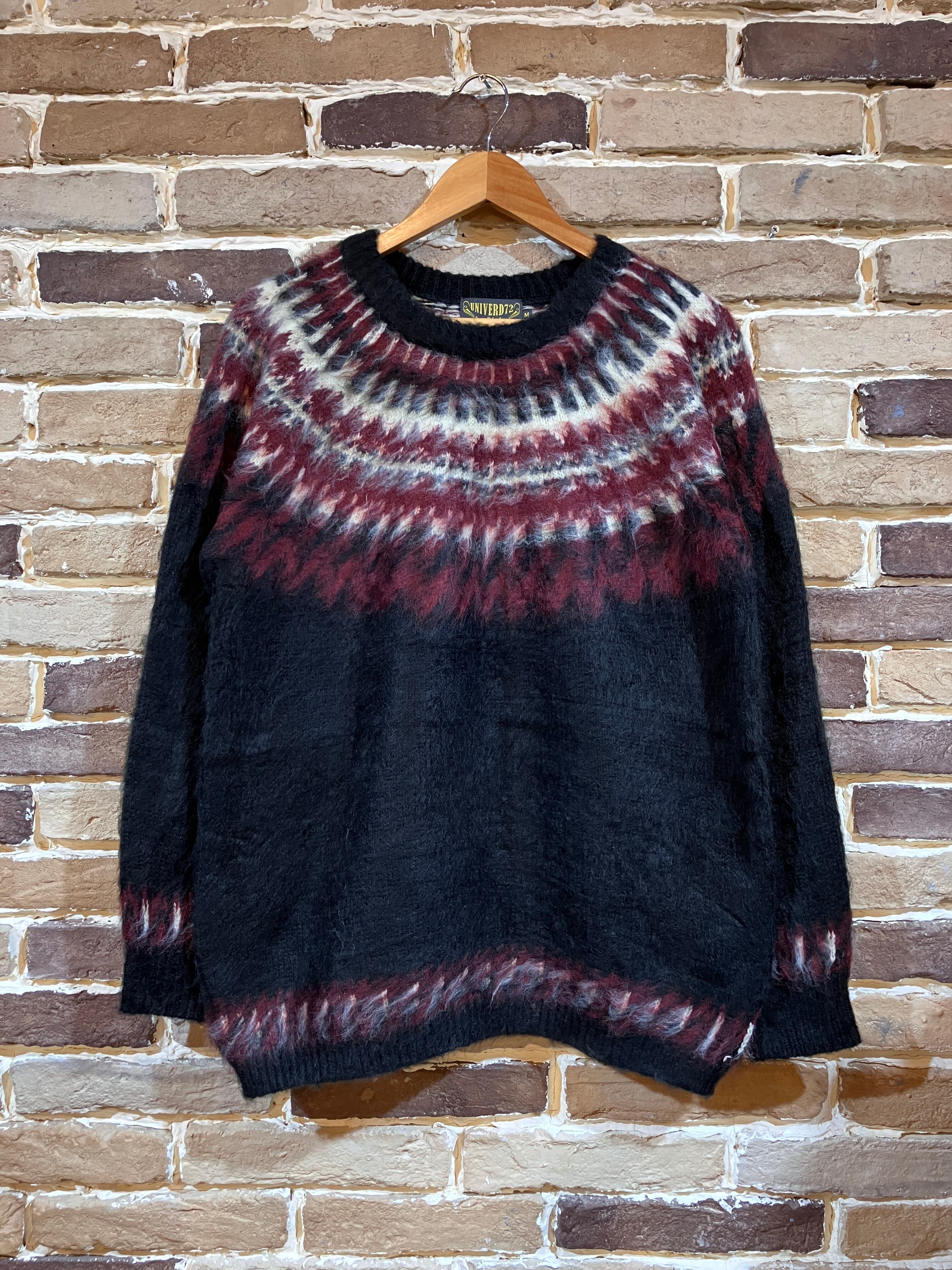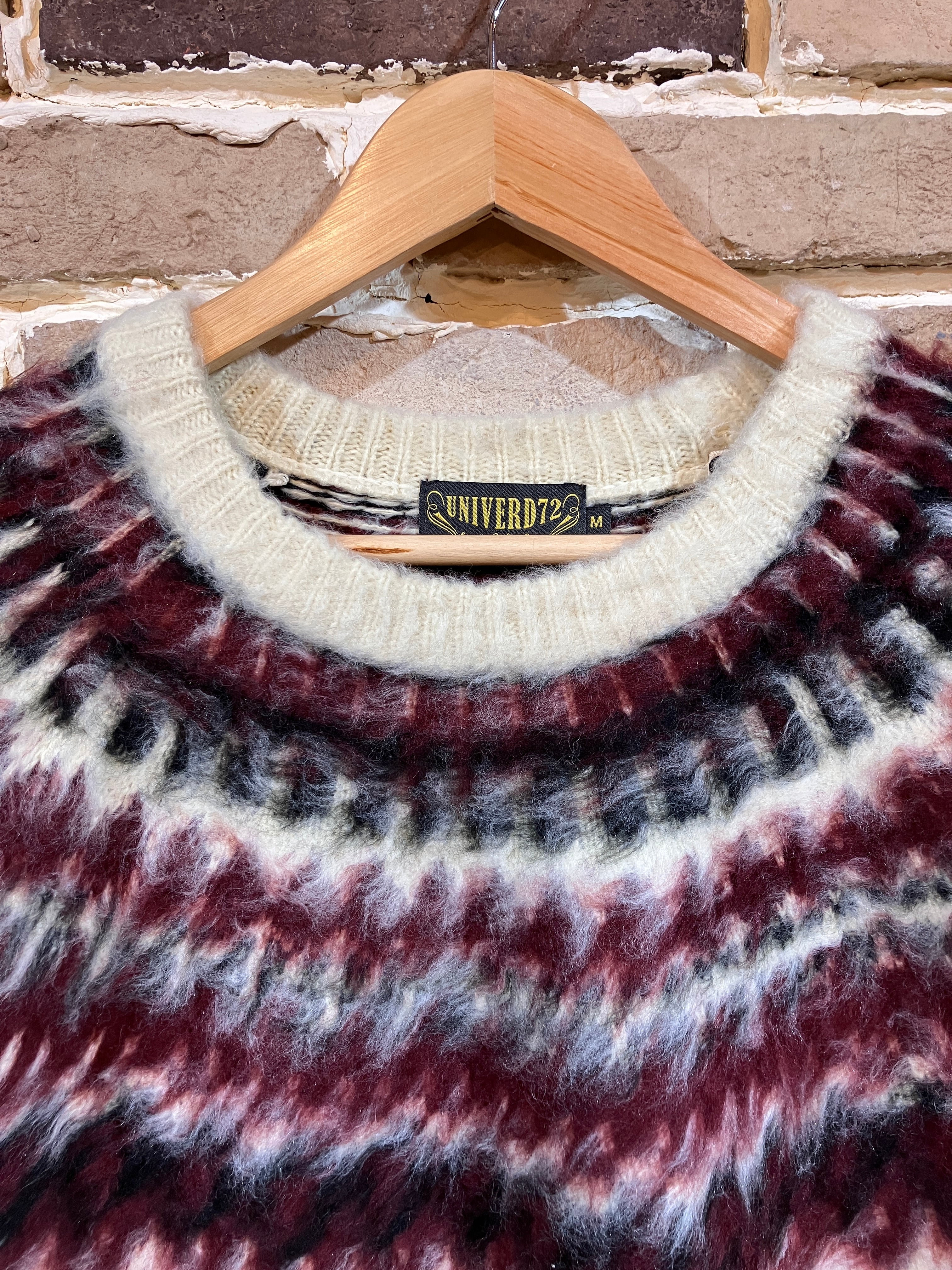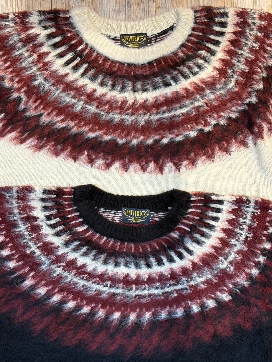 ダブルジャガードで織られた、秋冬らしい季節感も感じられる色使いのノルディック柄のモヘアタッチクルーネックセーター。