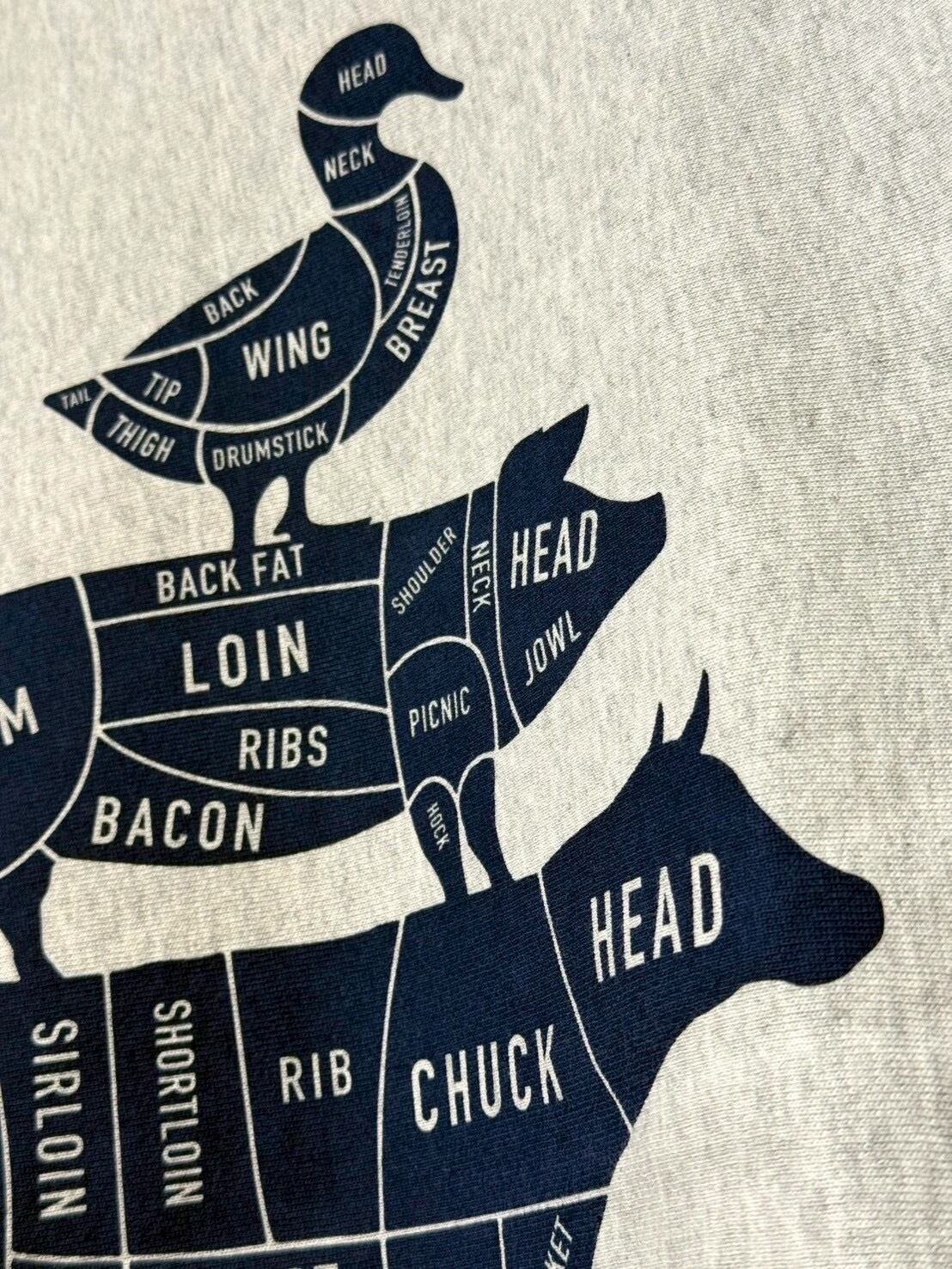 フロントには、ワンポイントの包丁ロゴ、バックには大きくアヒル、豚、牛の部位表記がプリントされた面白みのあるアイテムです!