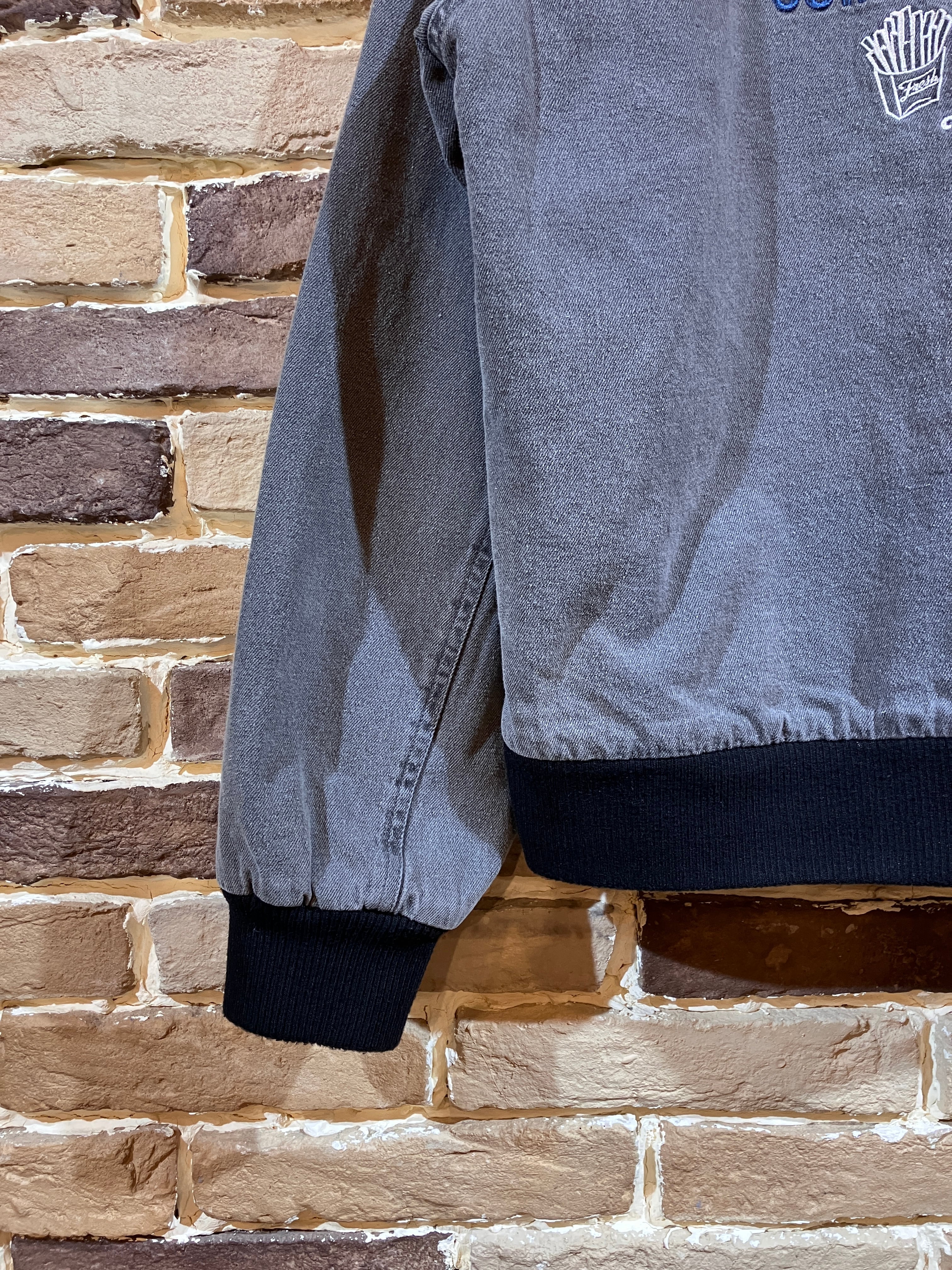 古着アイテムのような形のデニムジャケットに、アメリカのフードショップ風のデザインを刺繍。