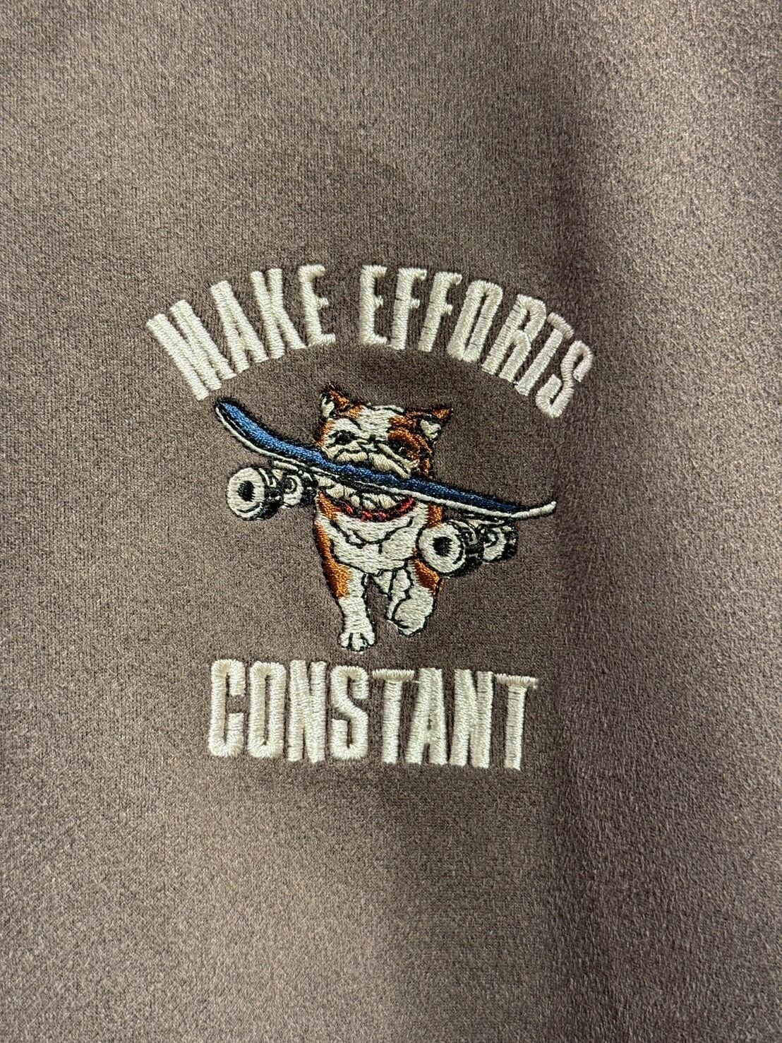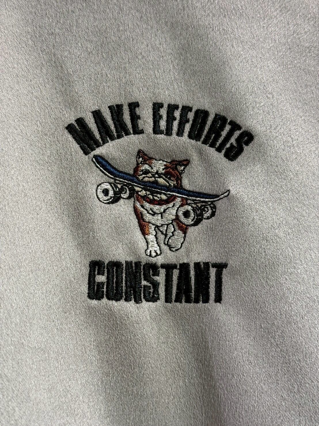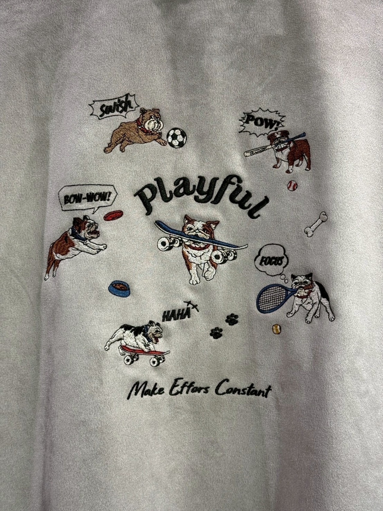 ブルドッグが色々なスポーツで遊んでいる場面が刺繍で施されています。