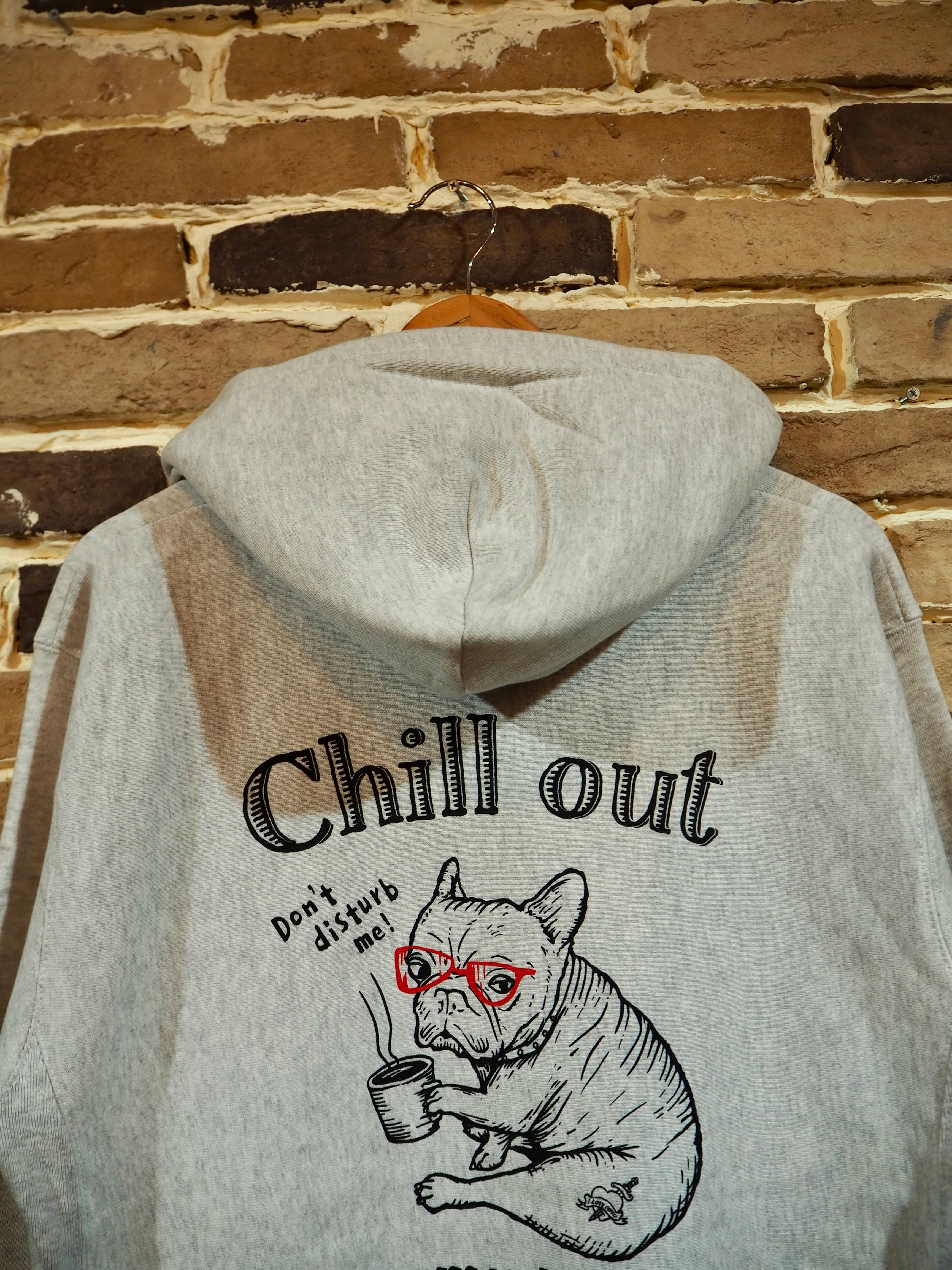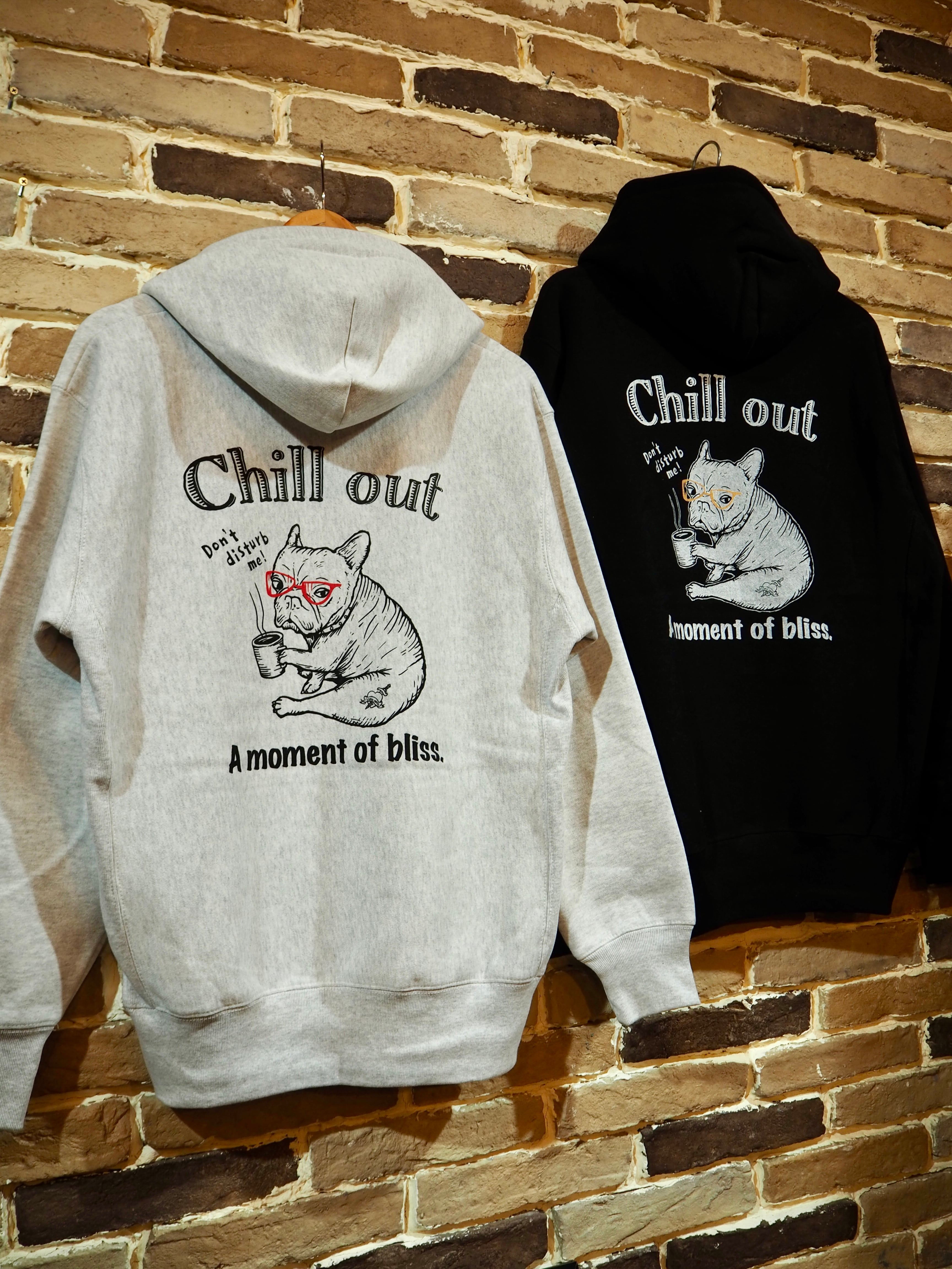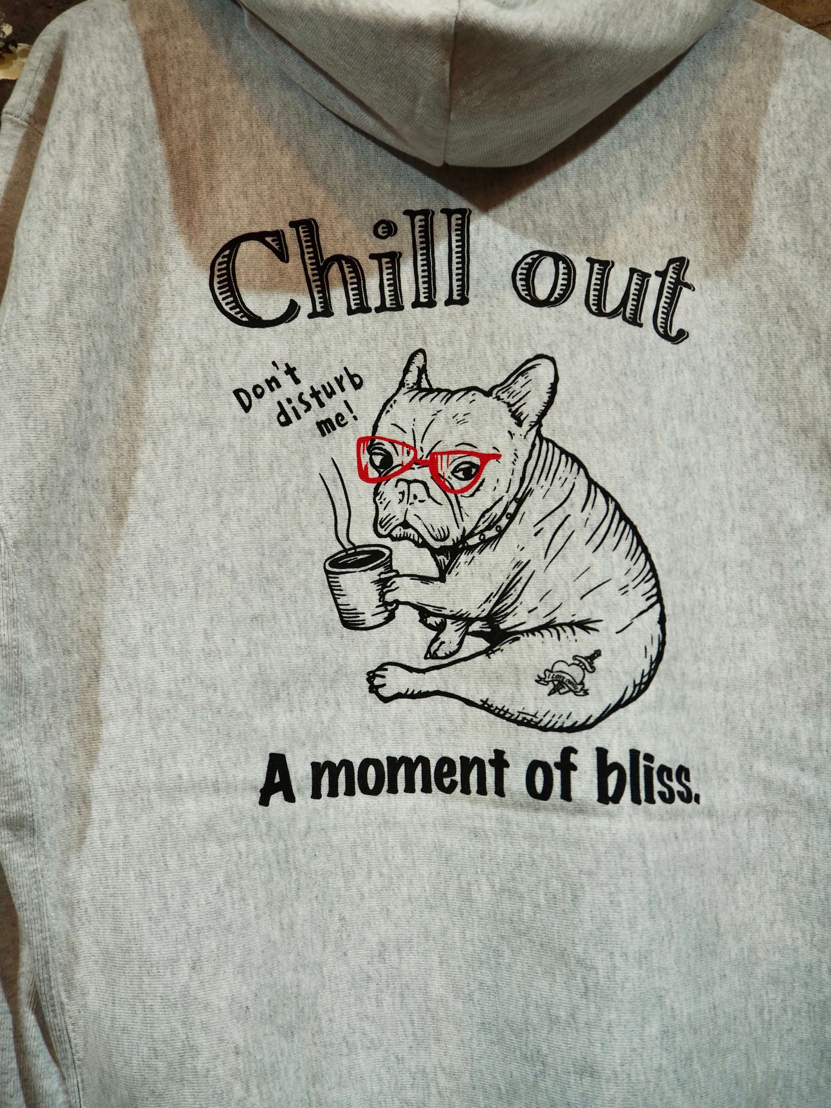 チルアウトをテーマにしたオリジナルアートワーク〝CHILL OUT〟。コーヒーを持った子犬のフレブルがチルアウトしている時に呼びかけられ、怒っている様子を描いた可愛らしいアートワーク。