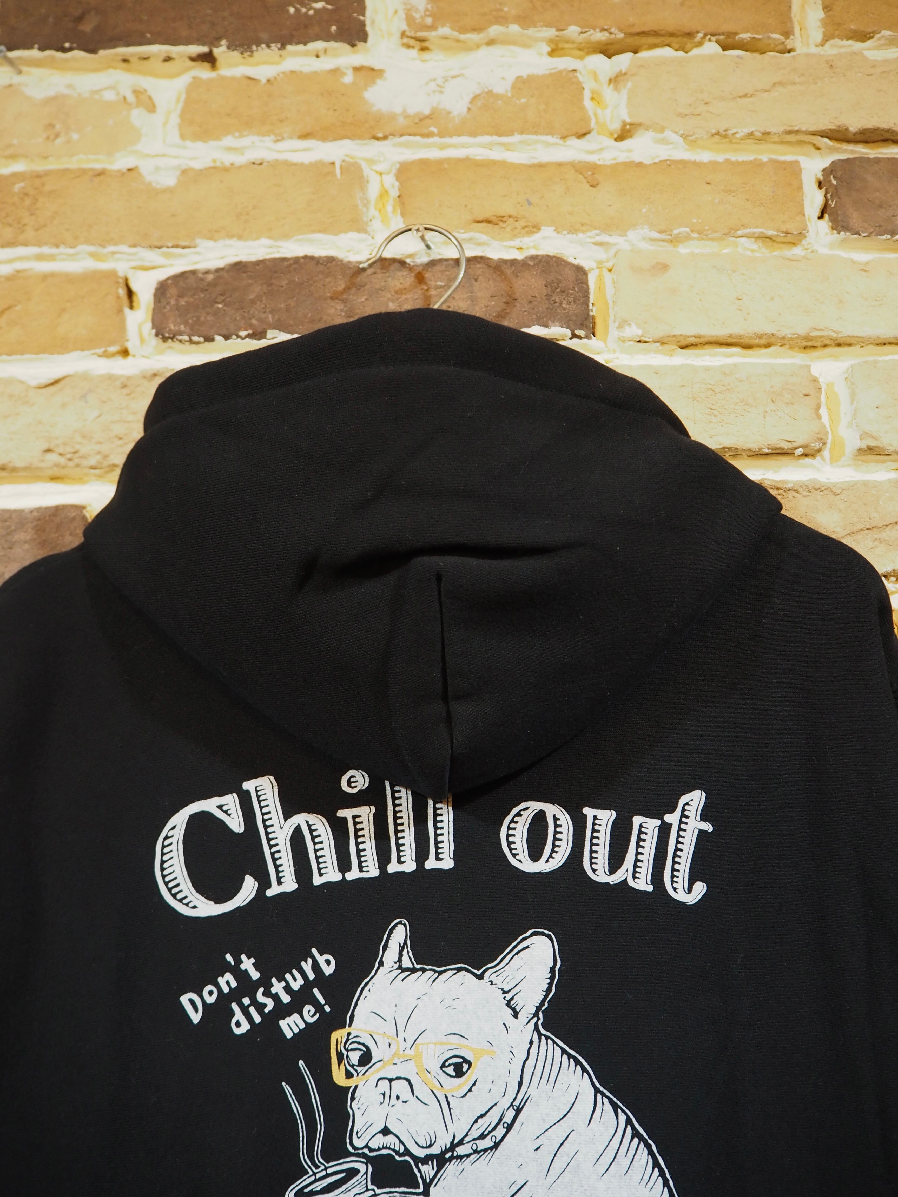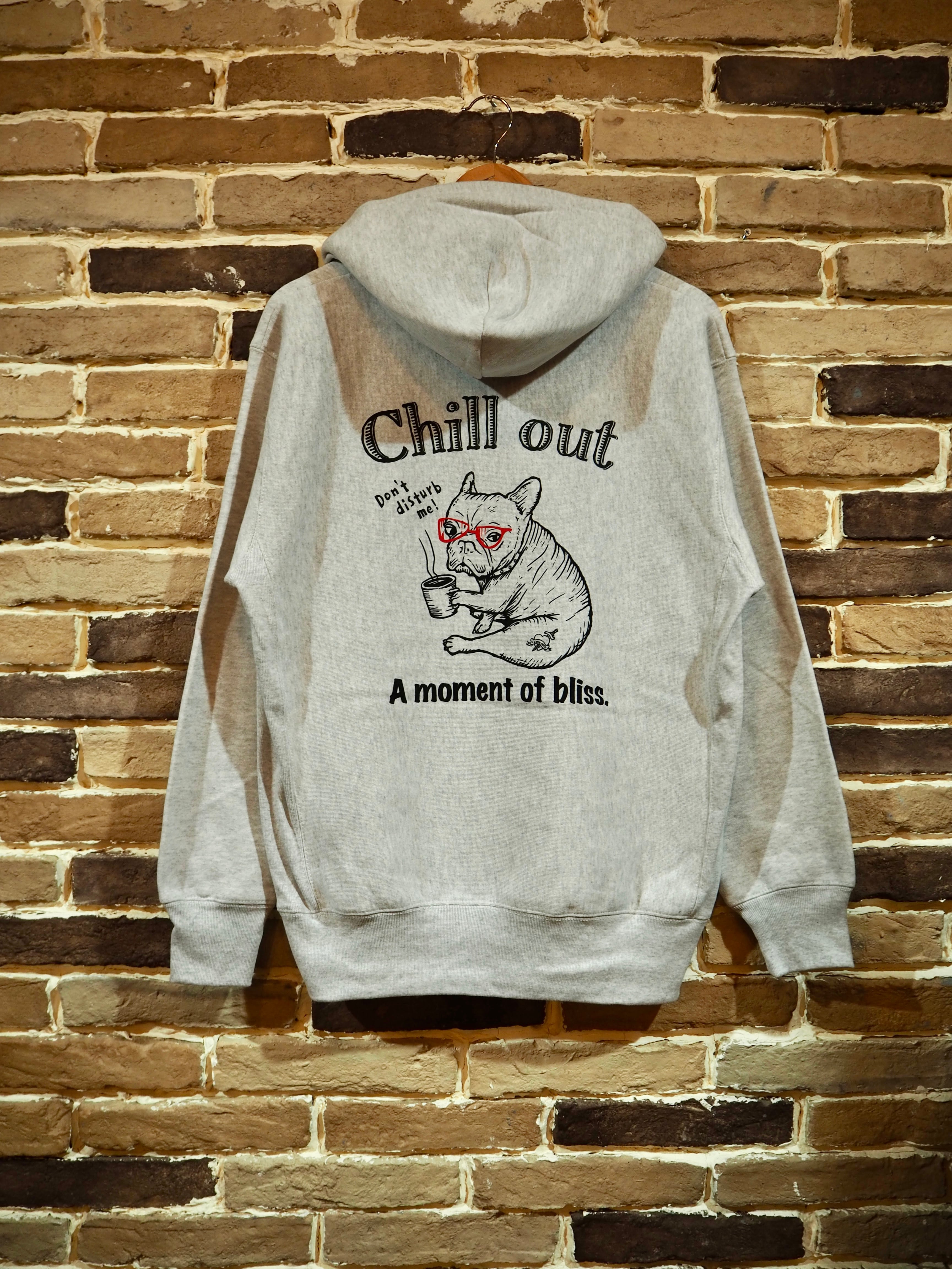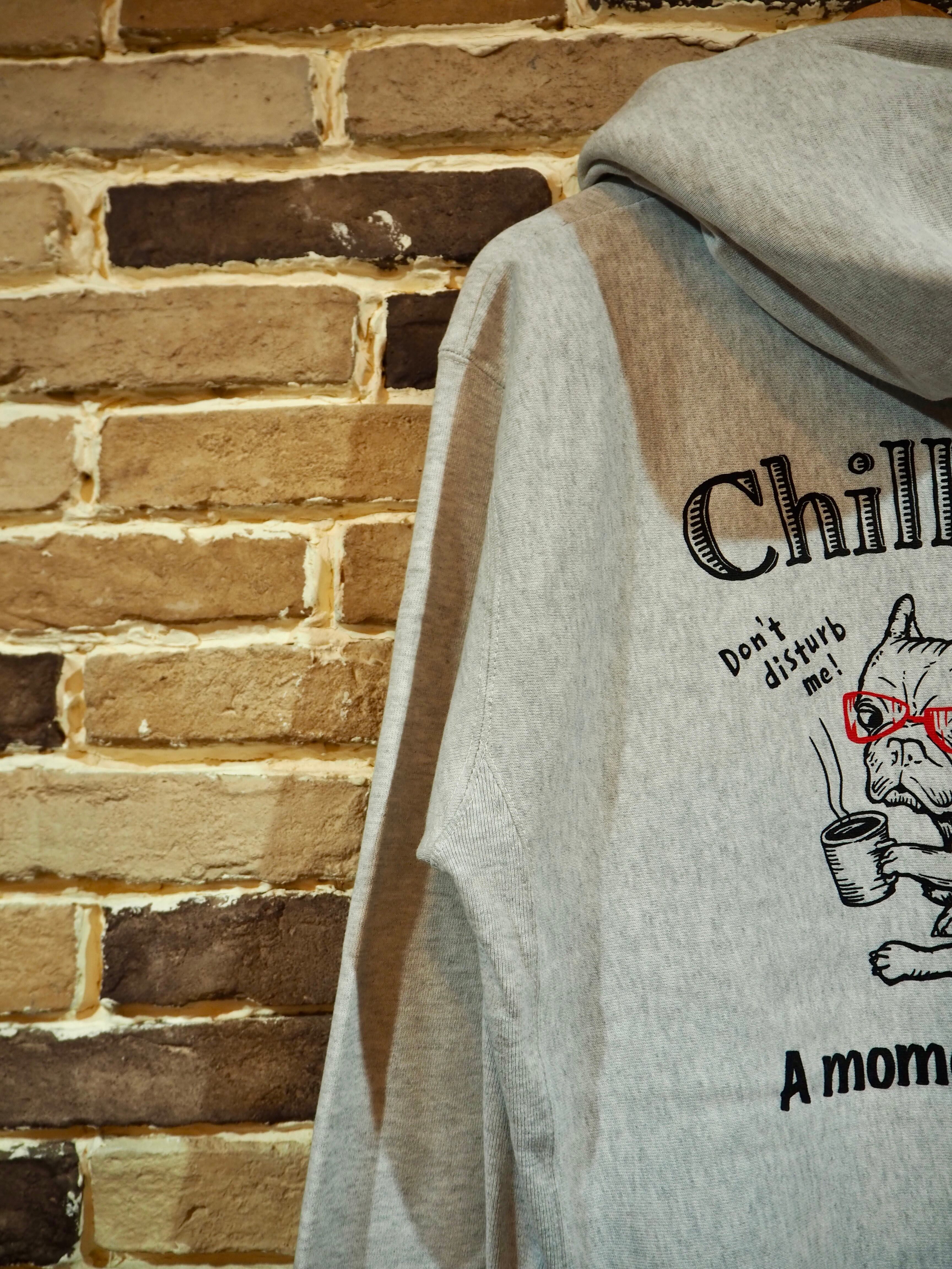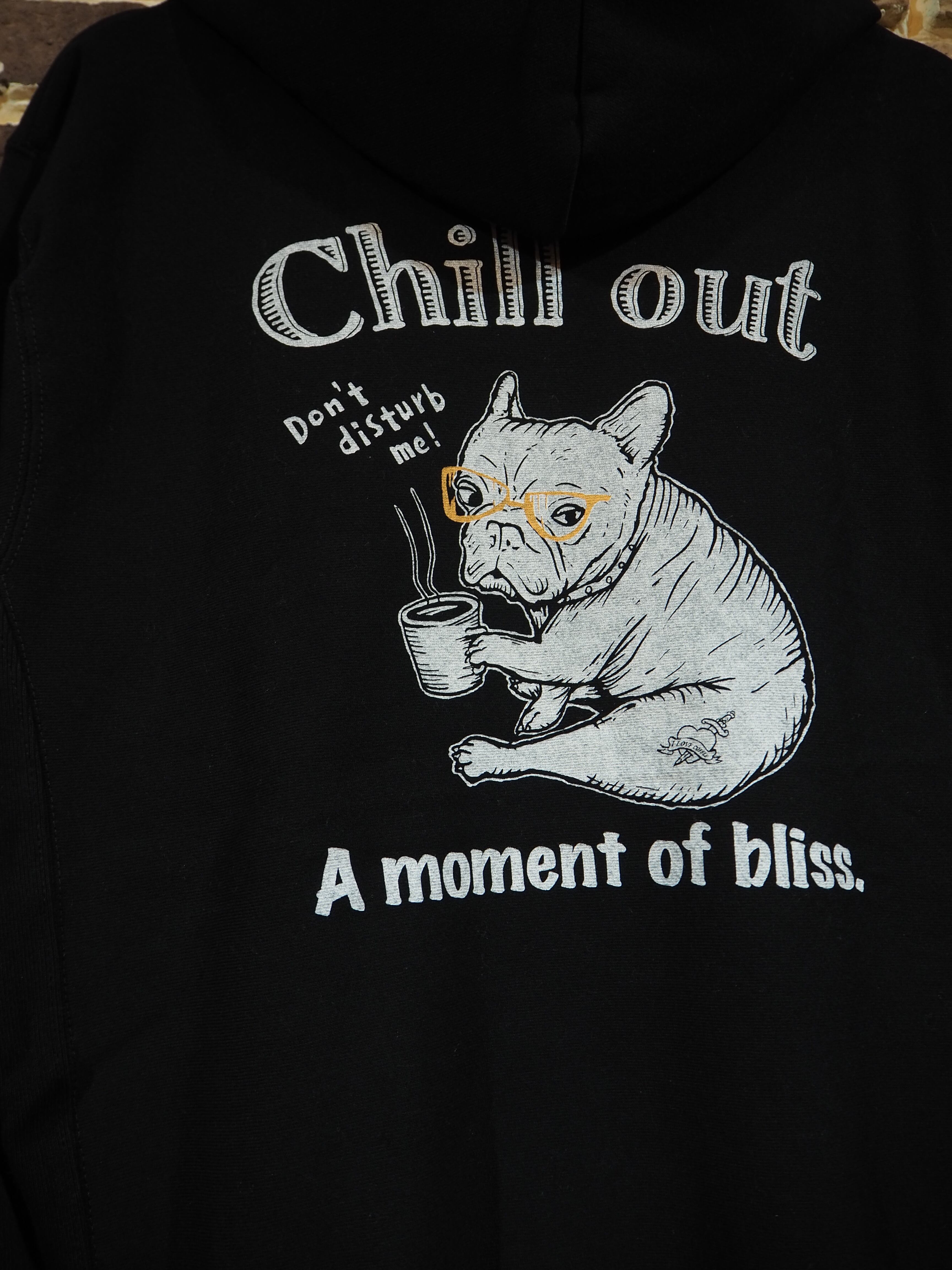 チルアウトをテーマにしたオリジナルアートワーク〝CHILL OUT〟。コーヒーを持った子犬のフレブルがチルアウトしている時に呼びかけられ、怒っている様子を描いた可愛らしいアートワーク。