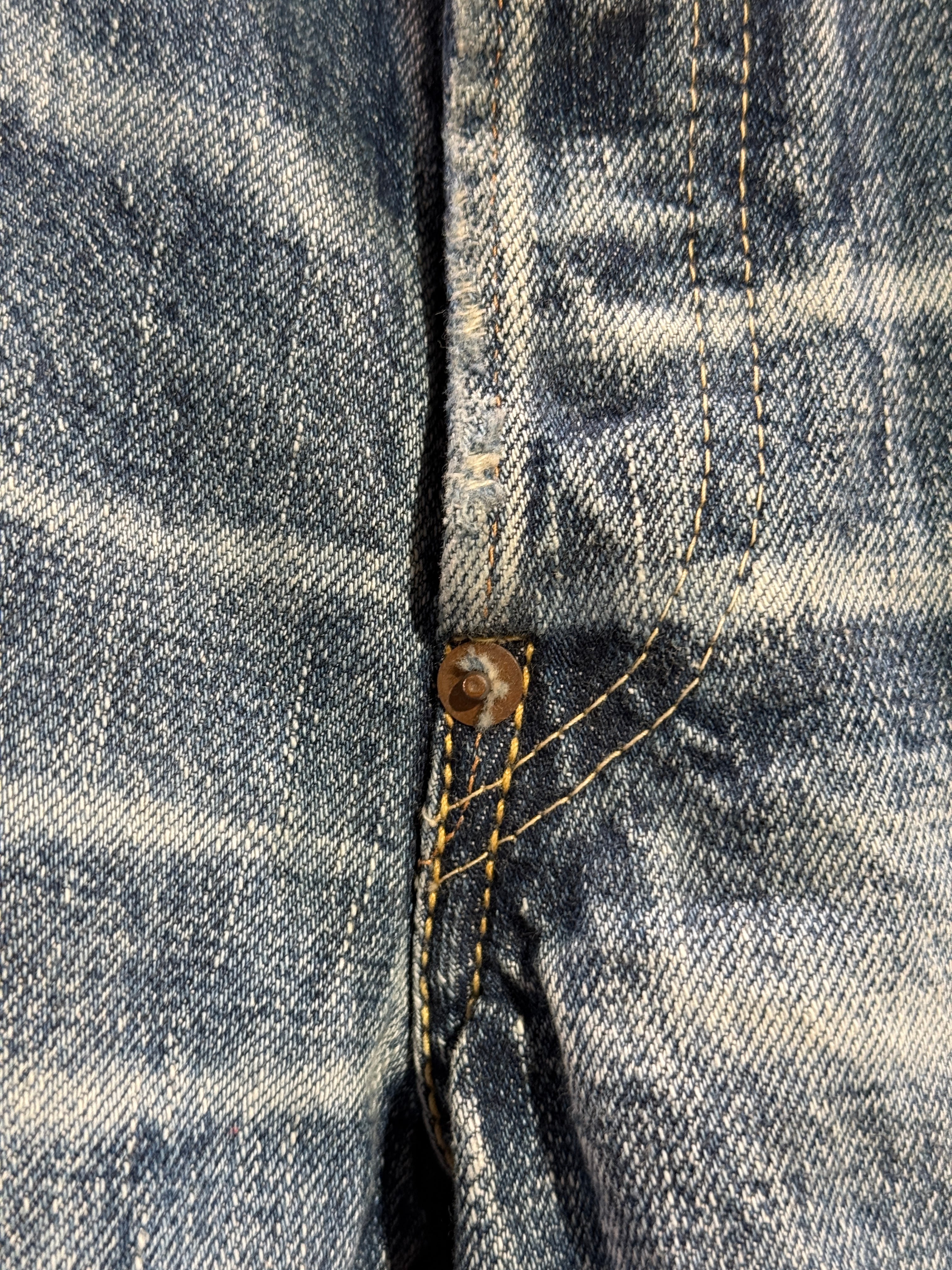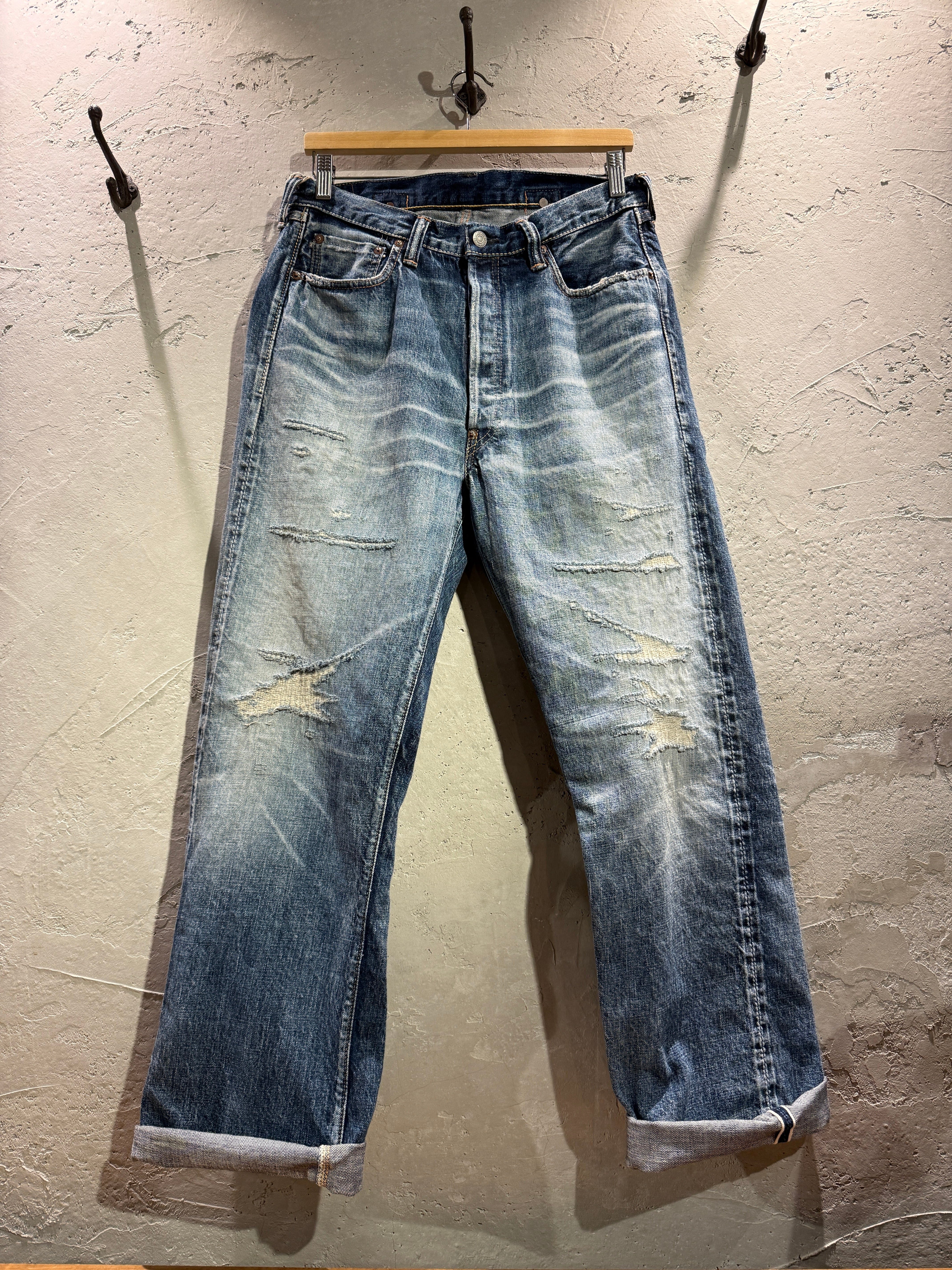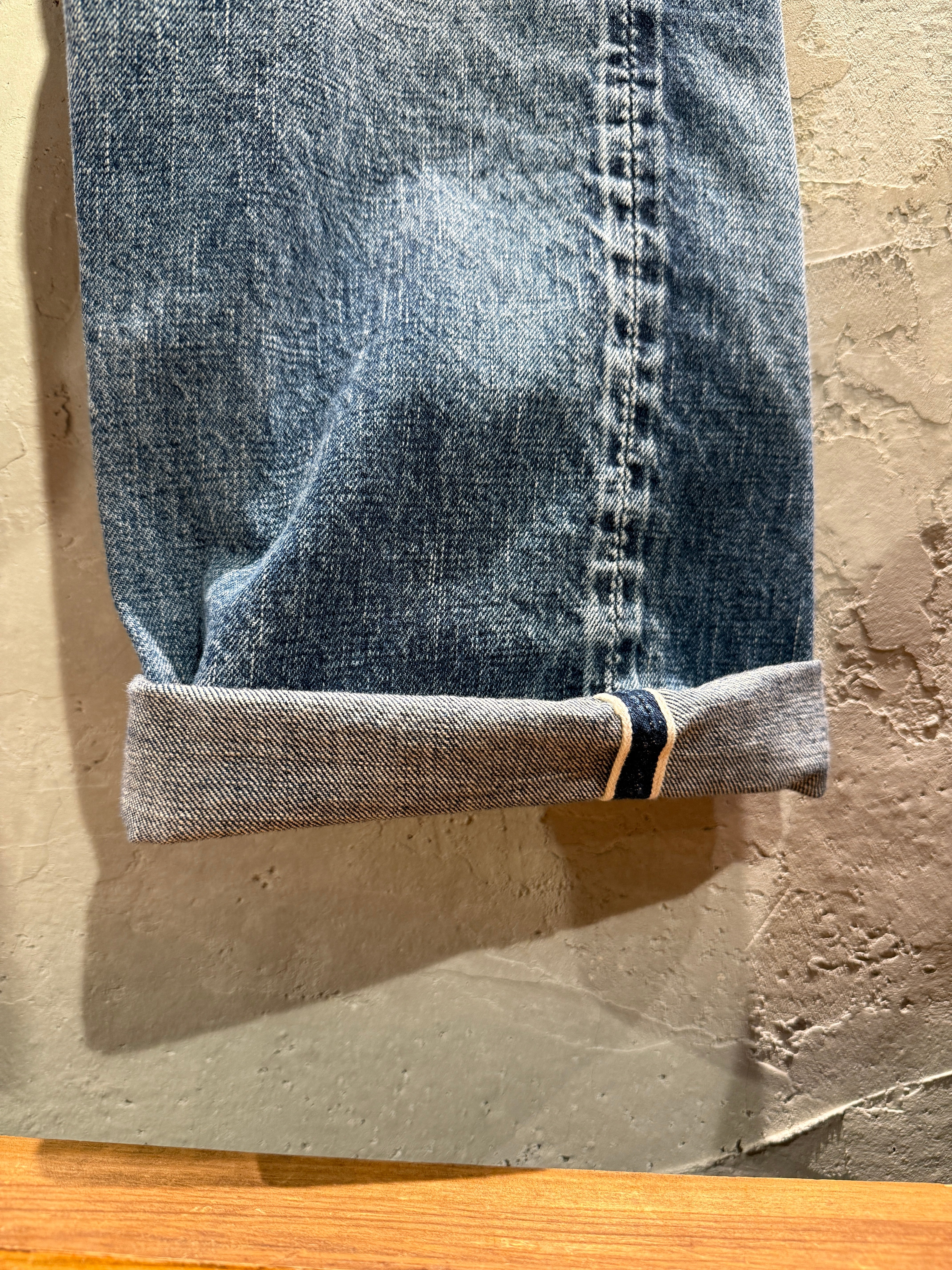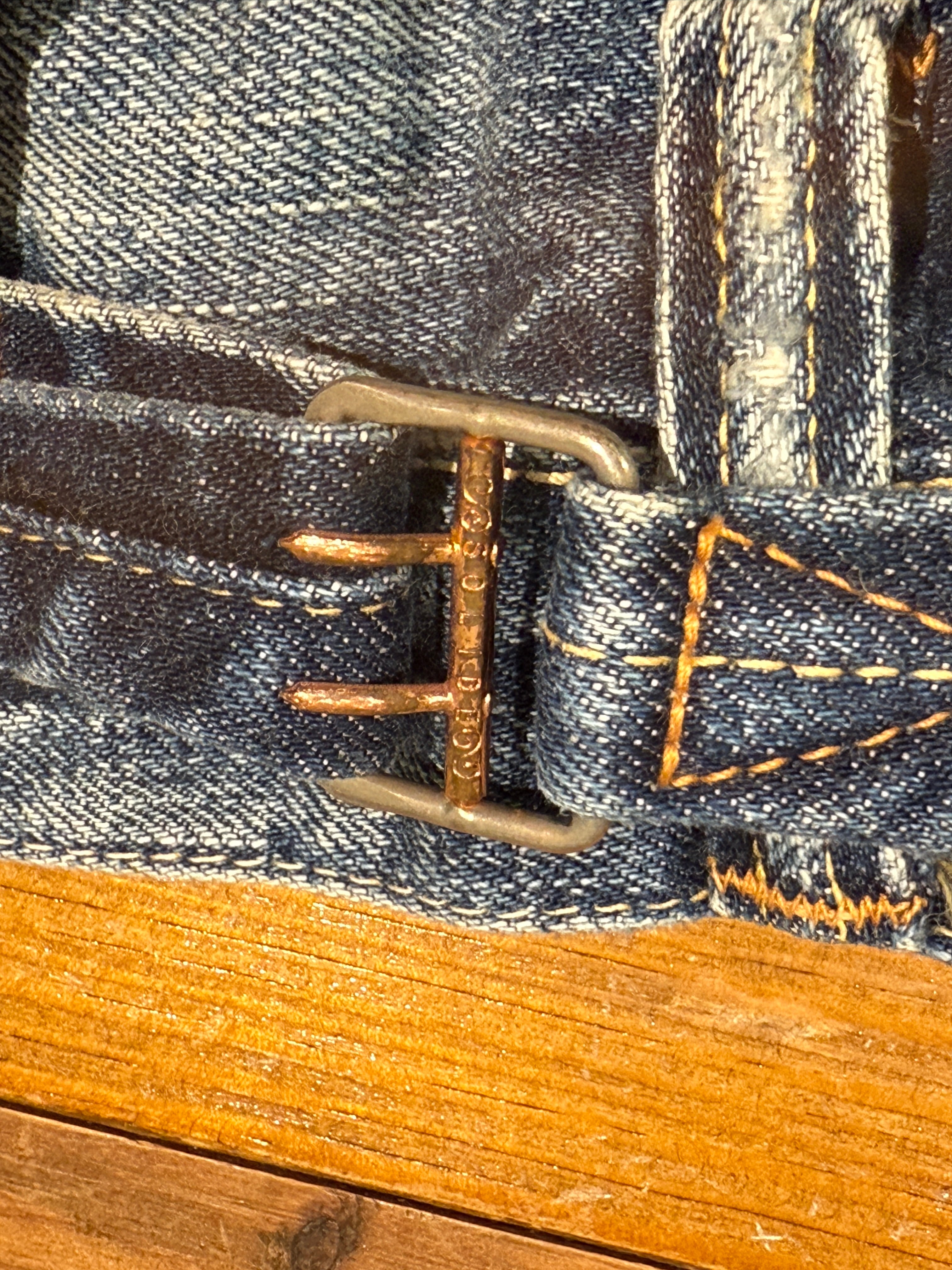 ジーンズの歴史的にサスペンダーで吊る時代から、ベルトを使用する人が大半を占めるようになったことからサスペンダーボタンが廃止されたことと、自動車の普及によりヒップポケットのむき出しリベットによってシートに傷がつくといった理由から、隠しリベットが採用された時期のモデル。