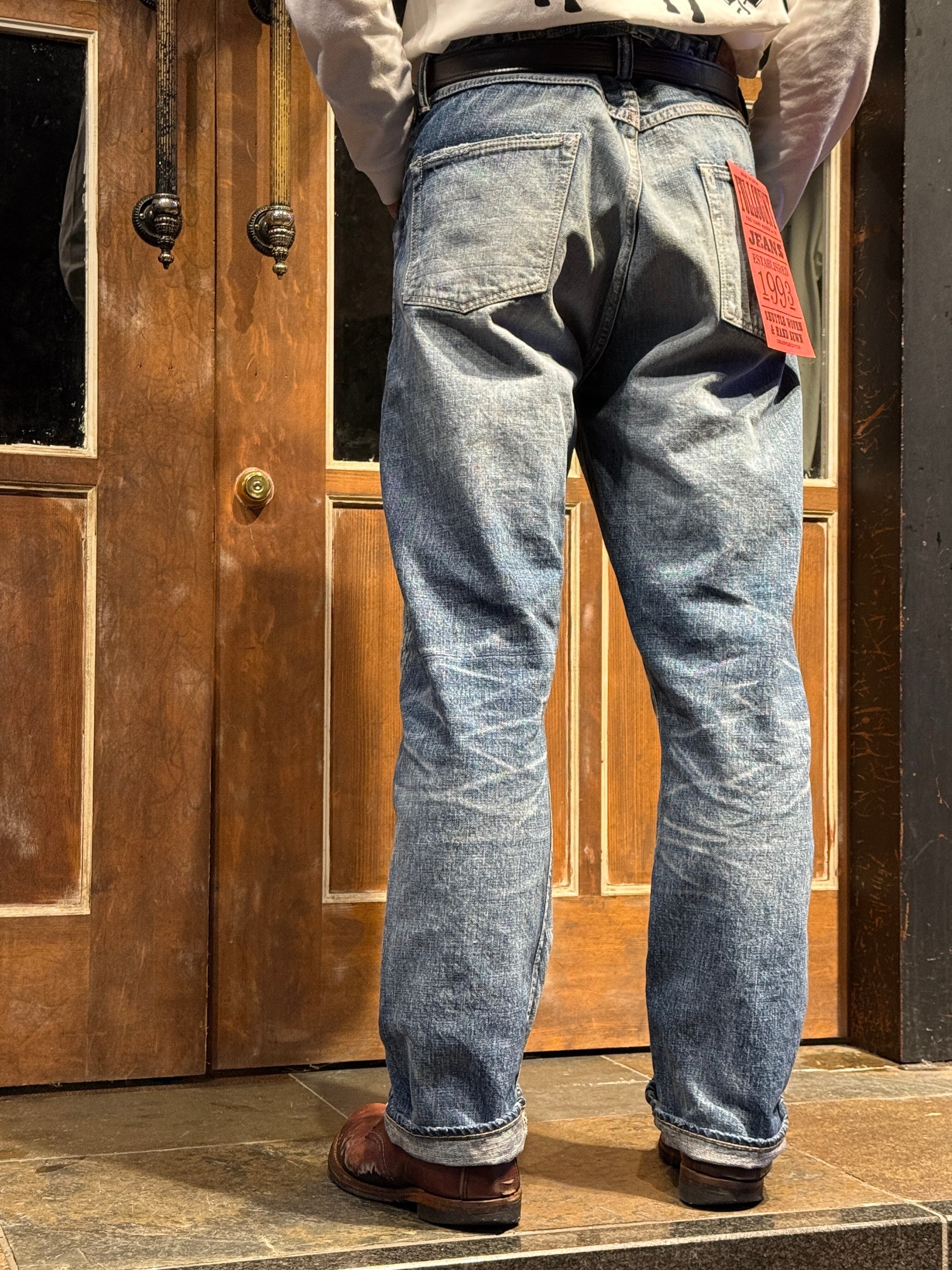 針つきの尾錠がついたバックストラップ、ヨーク高の巻き縫い、バックセンターベルトループの裏カン止めなどマニア好みのディテールも必見。このモデルのために作成した新色イエローステッチはデニム退色と共に変化をもたらす染色。