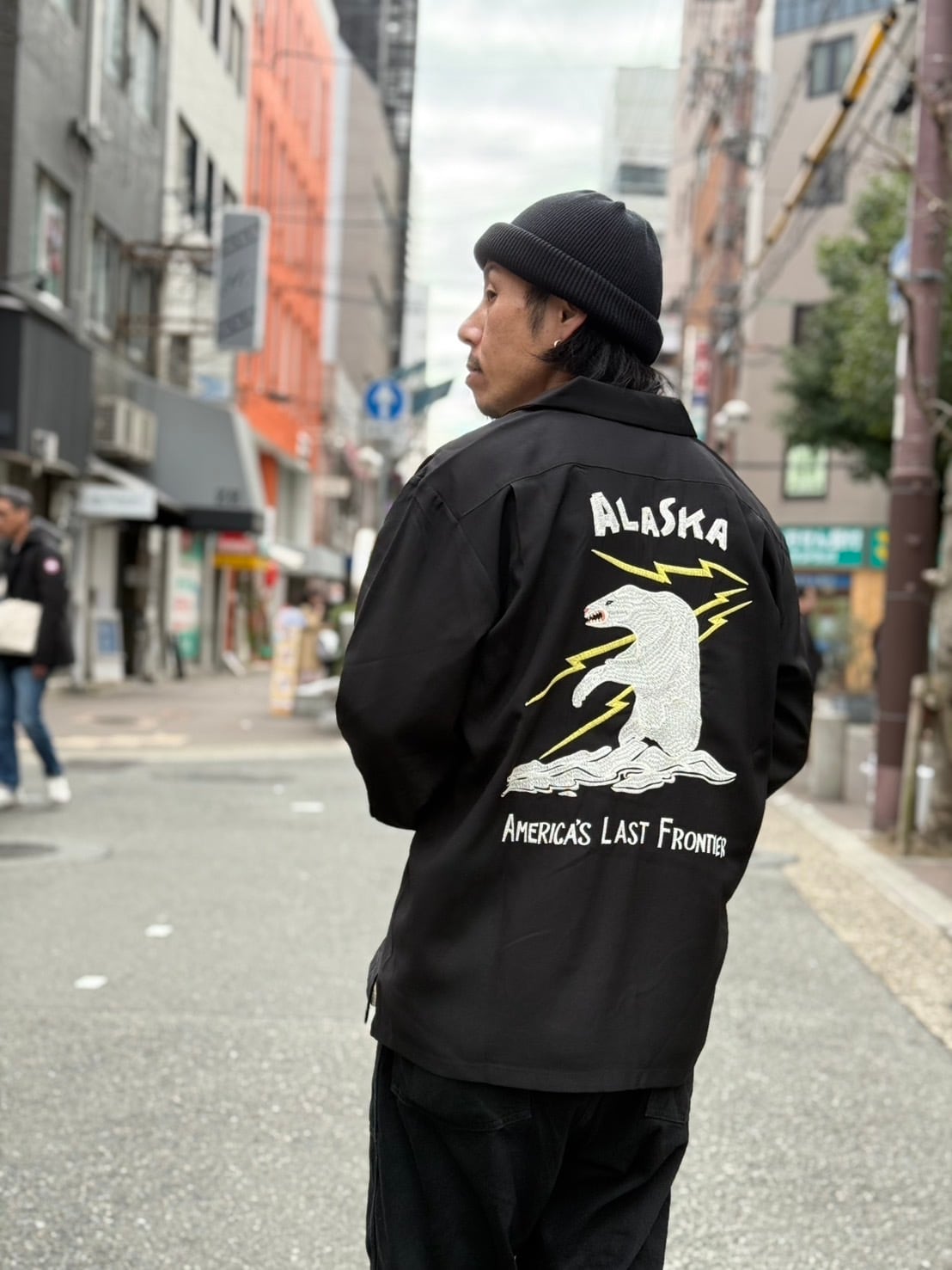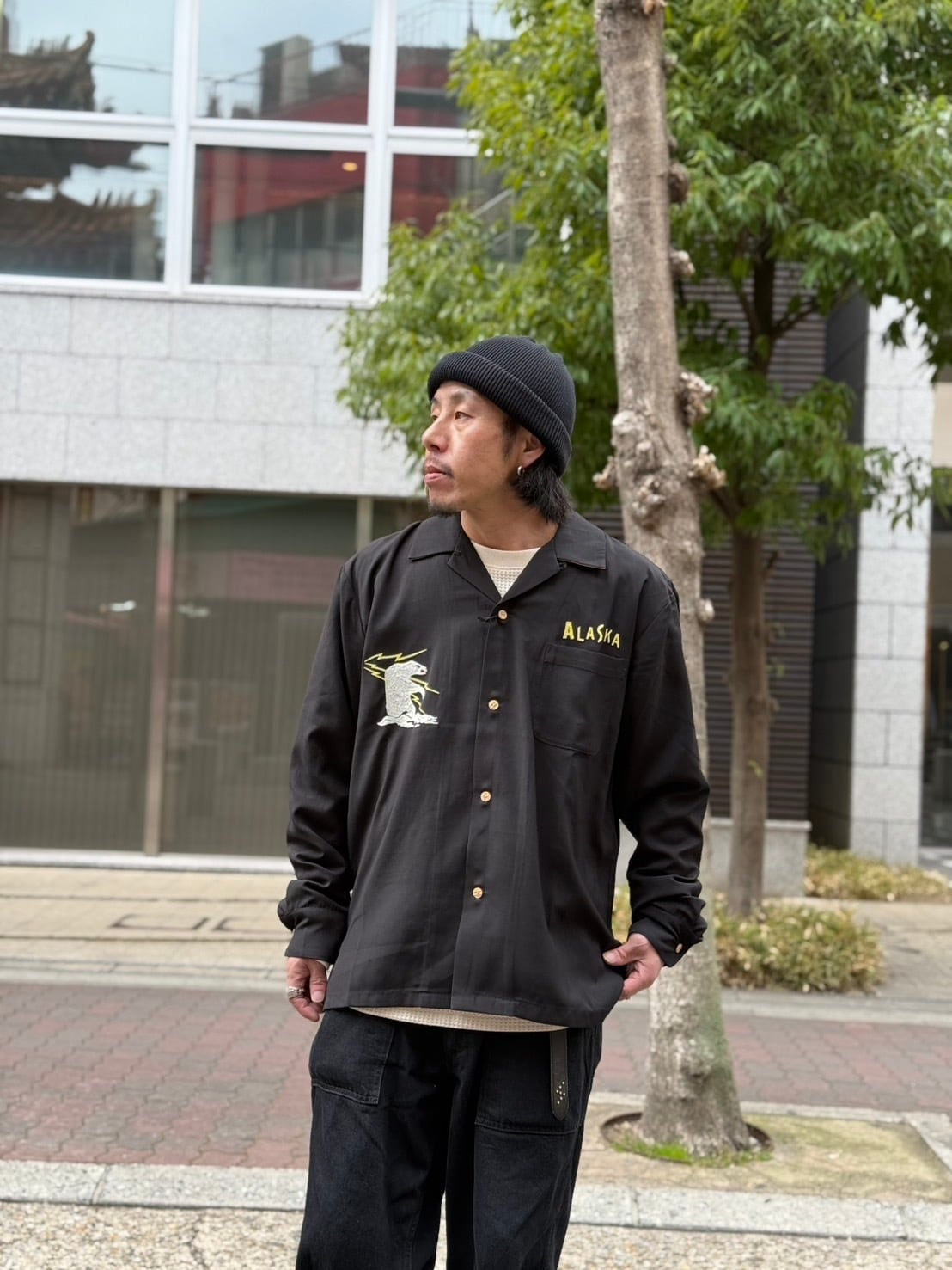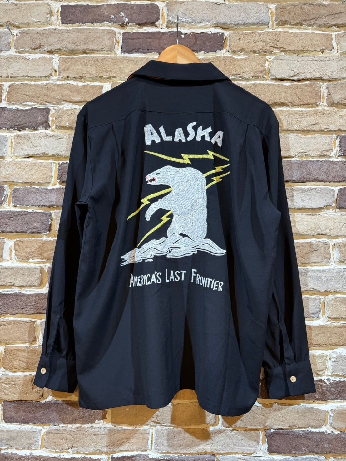 肌触りの良いシャイニーな生地を裏使いすることで、快適に着用可能。刺繍は人気の高いアラスカ柄を採用。