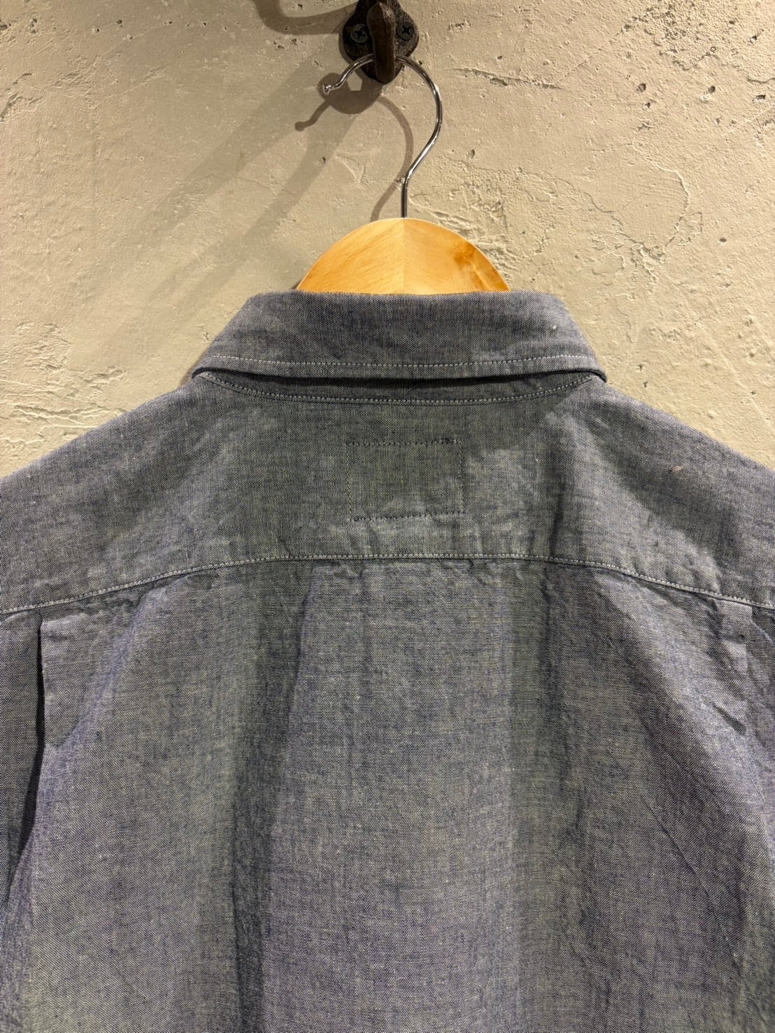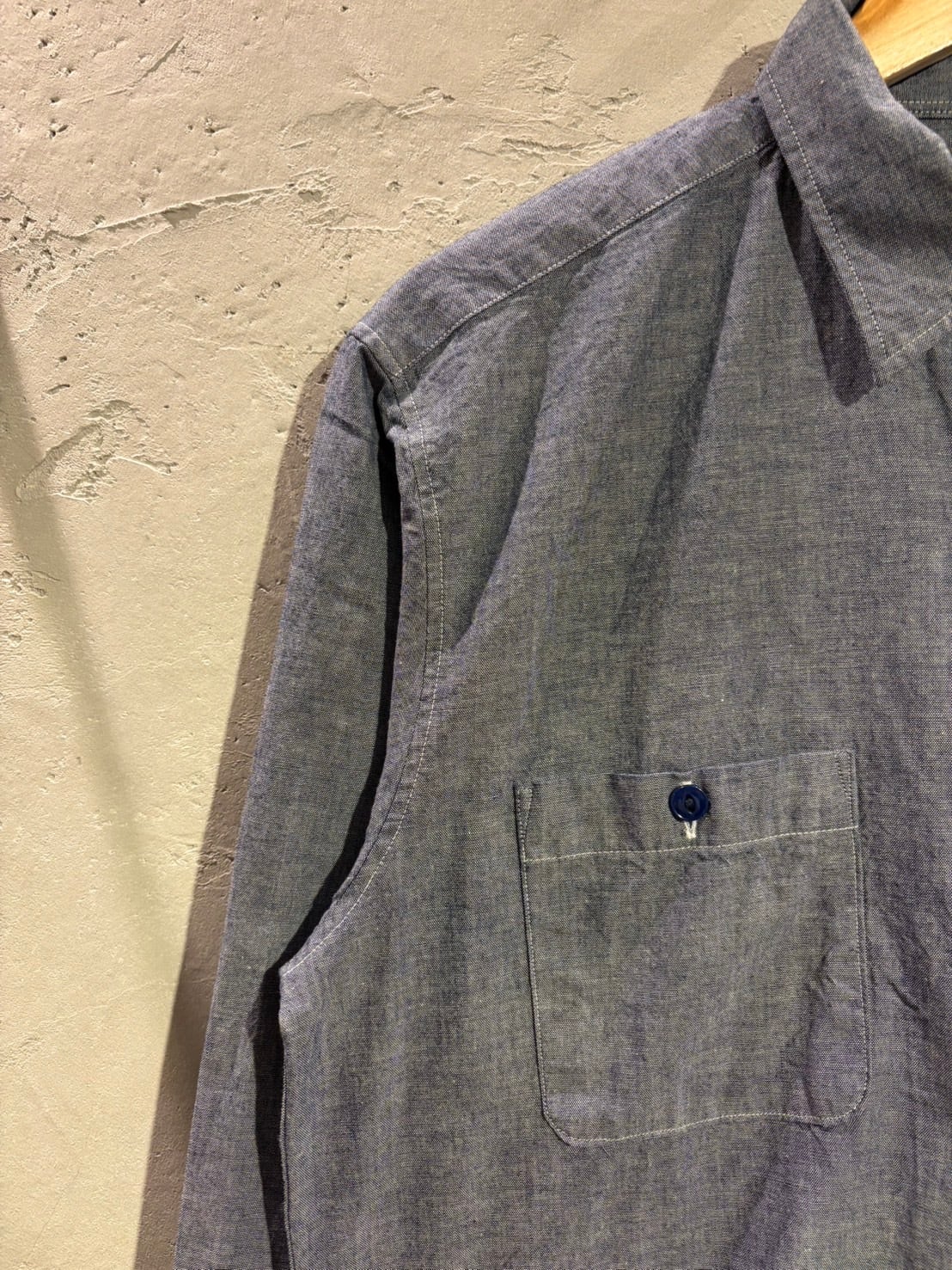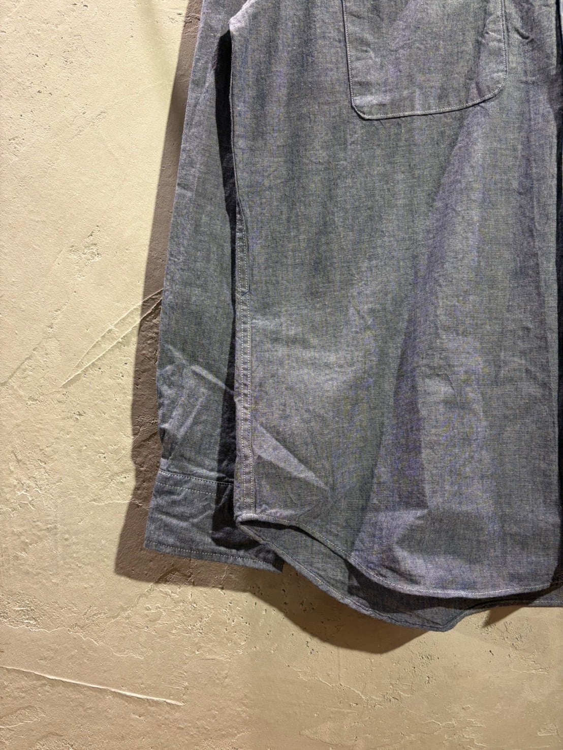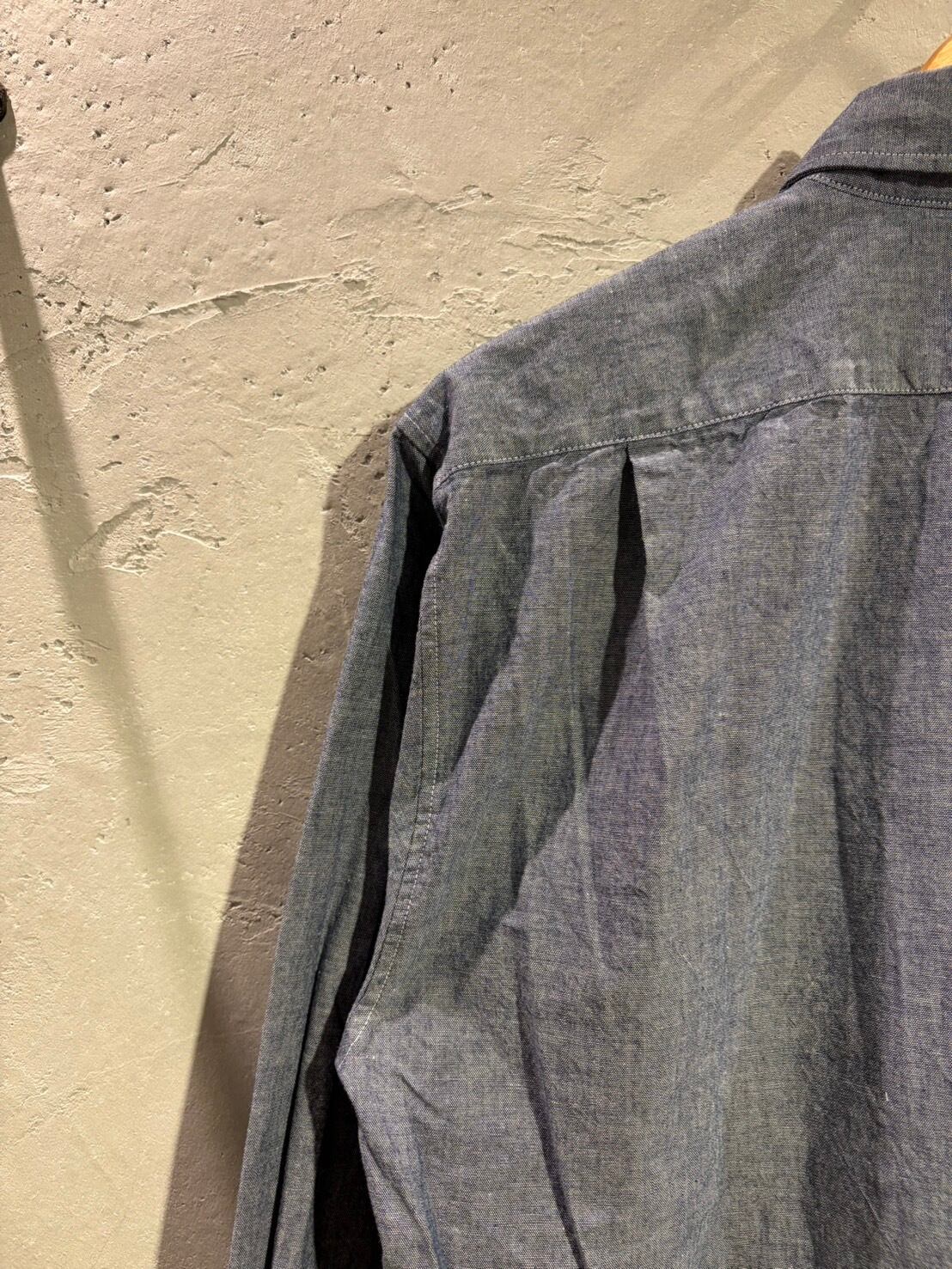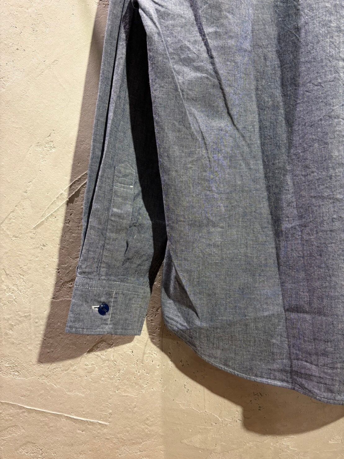 程よくハリ感、ザラつき感のある平織りシャンブレー素材のワークシャツ。