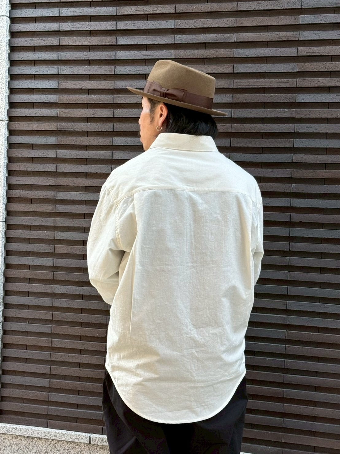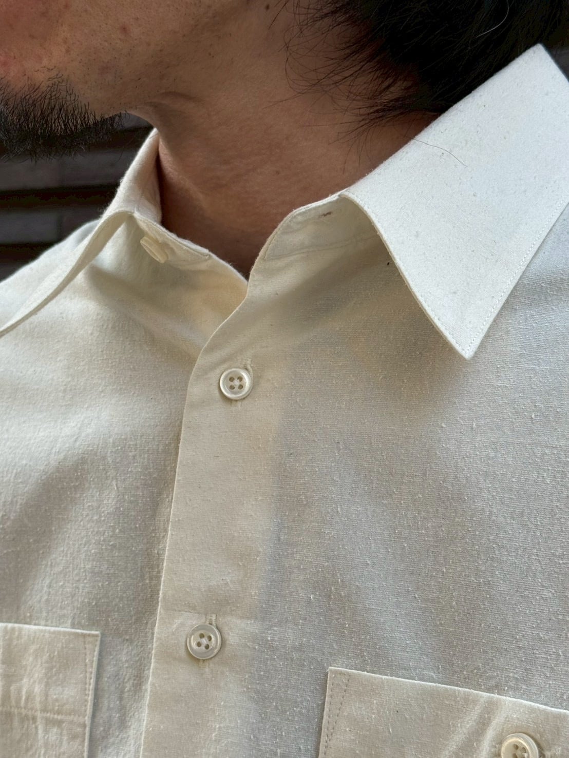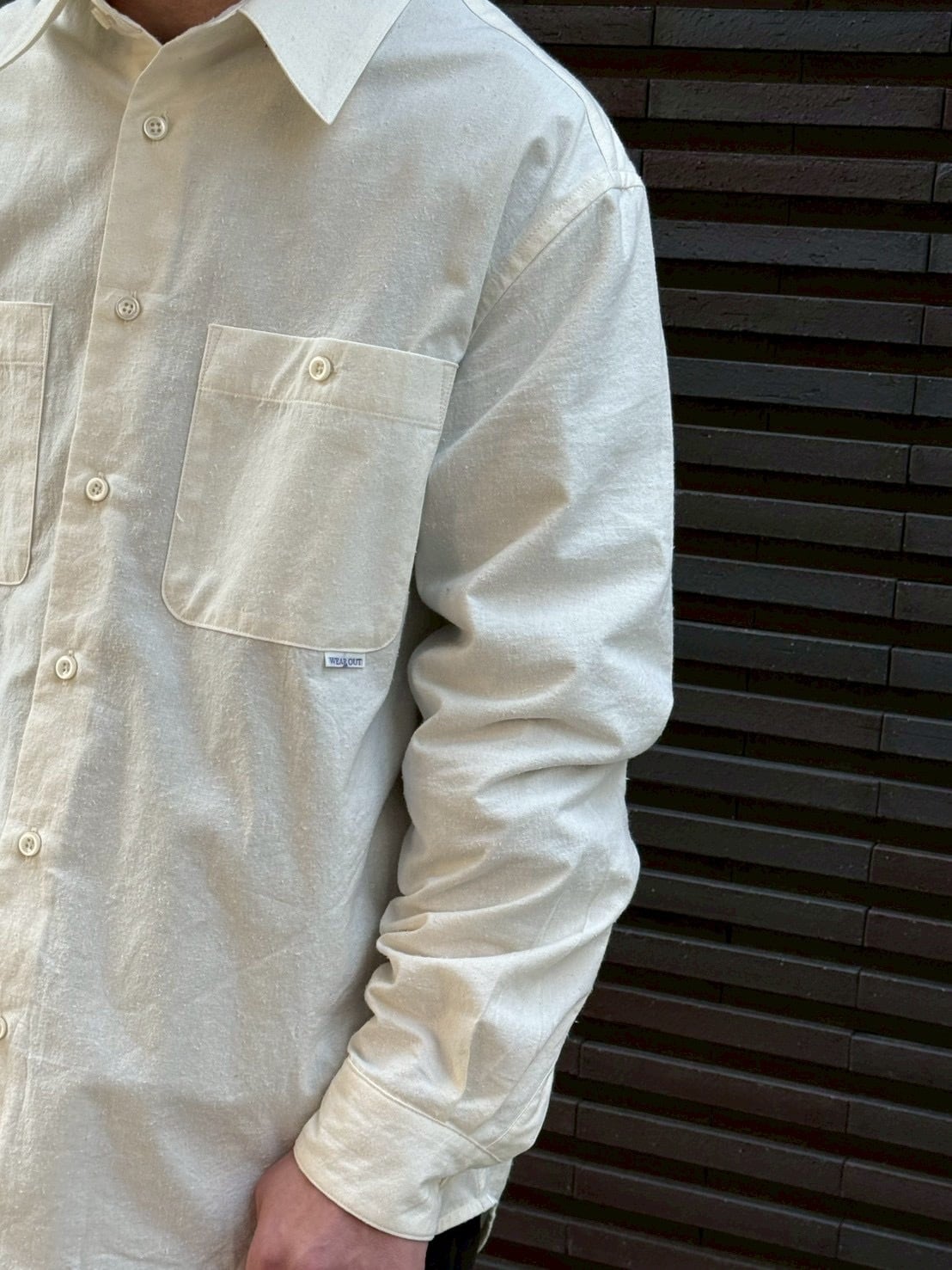 品のあるクラシックなドレスシャツに、フラップのない両胸ボケットを加えることでワークの要素をミックス。