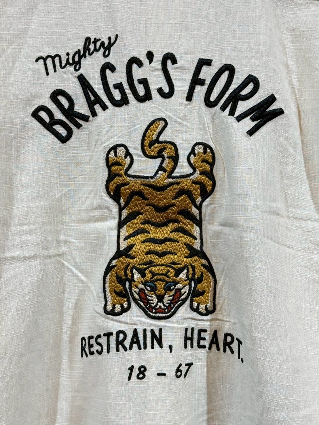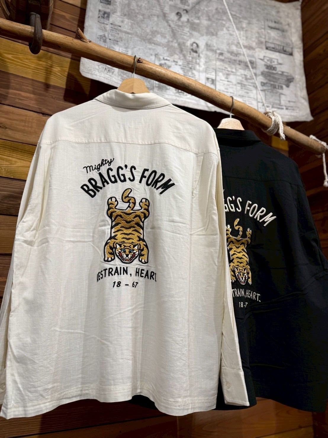 人気のチベタンラグモチーフの虎を刺繍で施した麻ライク(のような)シャツ。