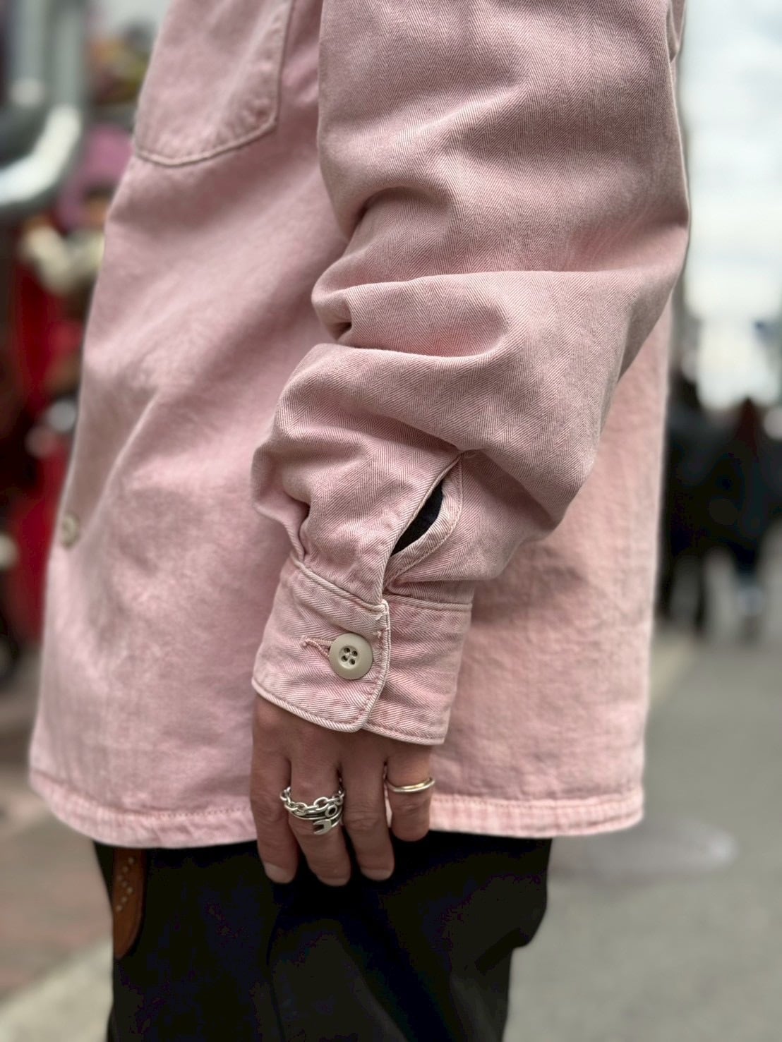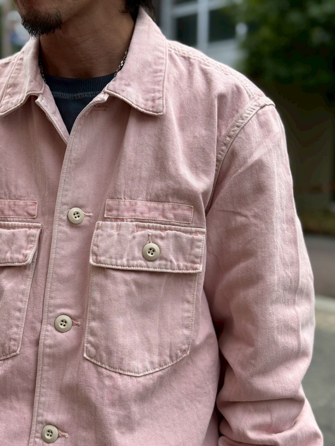 最大の特徴は、ヘリンボーンツイル生地。ミリタリー由来の素材感を活かしながら、最初から洗いをかけることで、着始めから身体に馴染む仕上がりに。