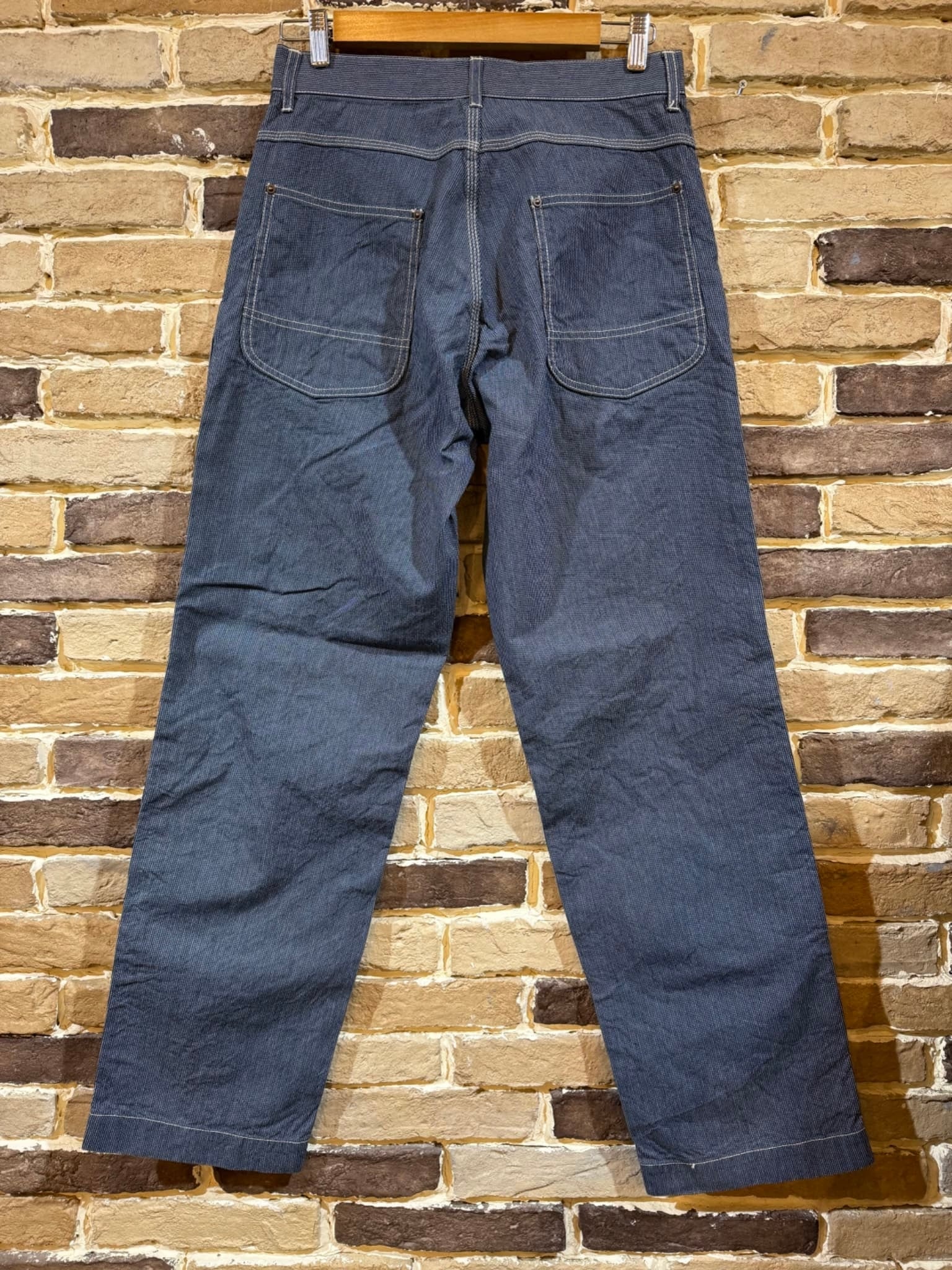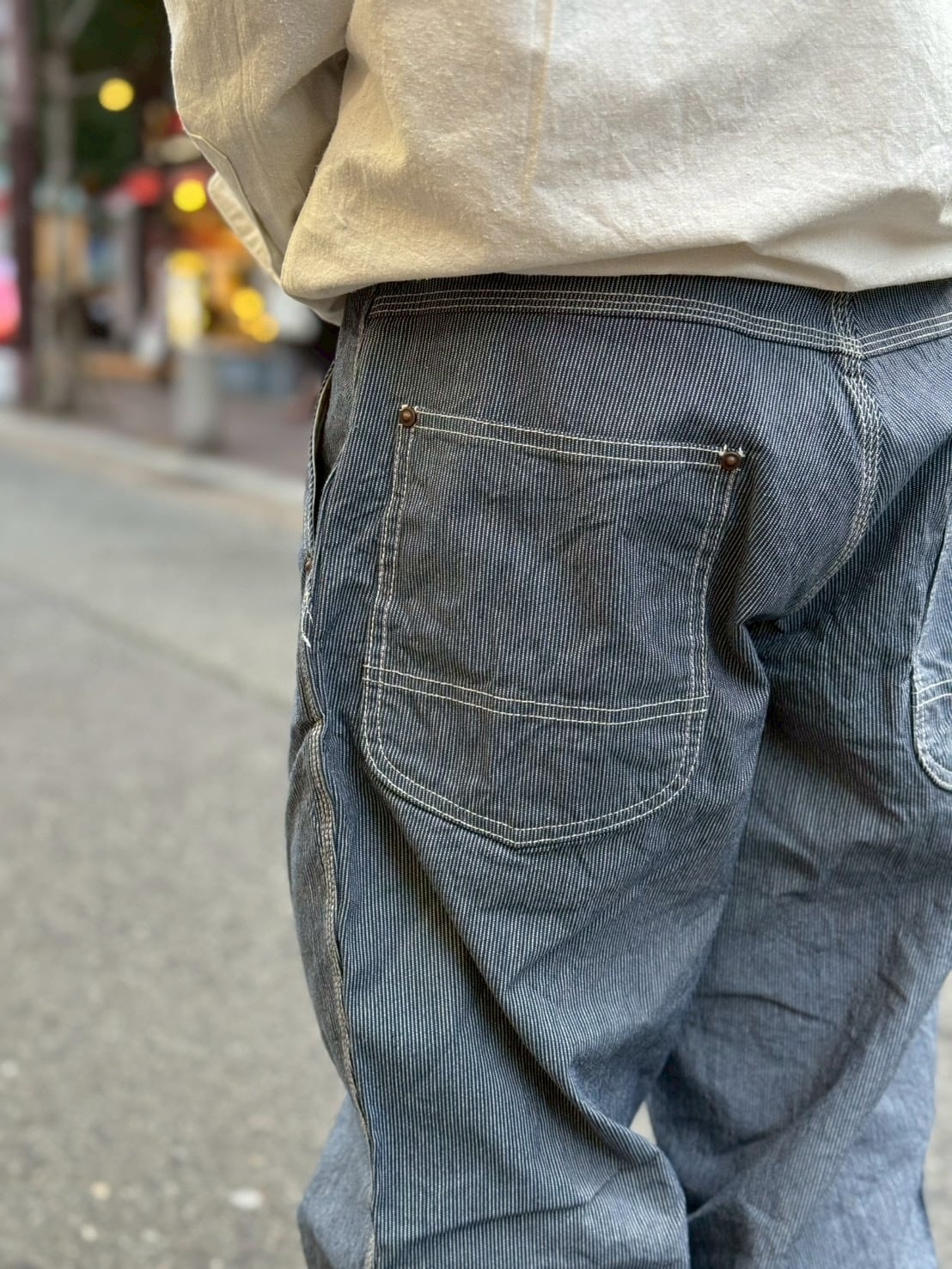 大人な雰囲気を纏ったヒッコリーワークパンツ。9オンスの生地は、しなやかさとタフネスを兼ね備え、季節を問わず活躍します。夏場の着用も快適で、トリプルステッチ、巻き縫い、リベットなど細部まで丁寧に仕上げられた一本。長く愛用できる信頼のワークウェアをお探しの方に最適です。