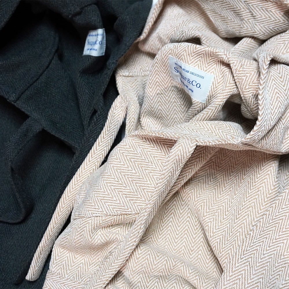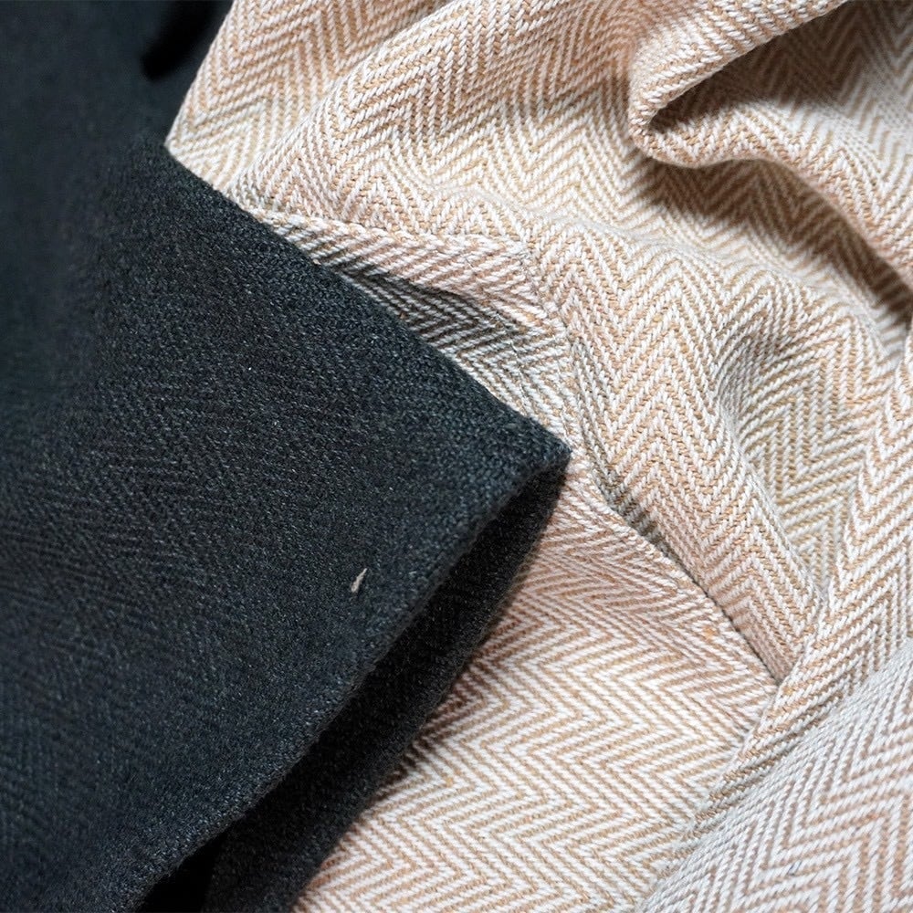 オリジナルの質感と空気感を残しつつ、着心地を重視したコットン/ポリエステルのオリジナルヘリンボーン編みファブリックで仕上げました。しっかりとした質感ながら柔らかく、着込むほどに風合いが増していきます。