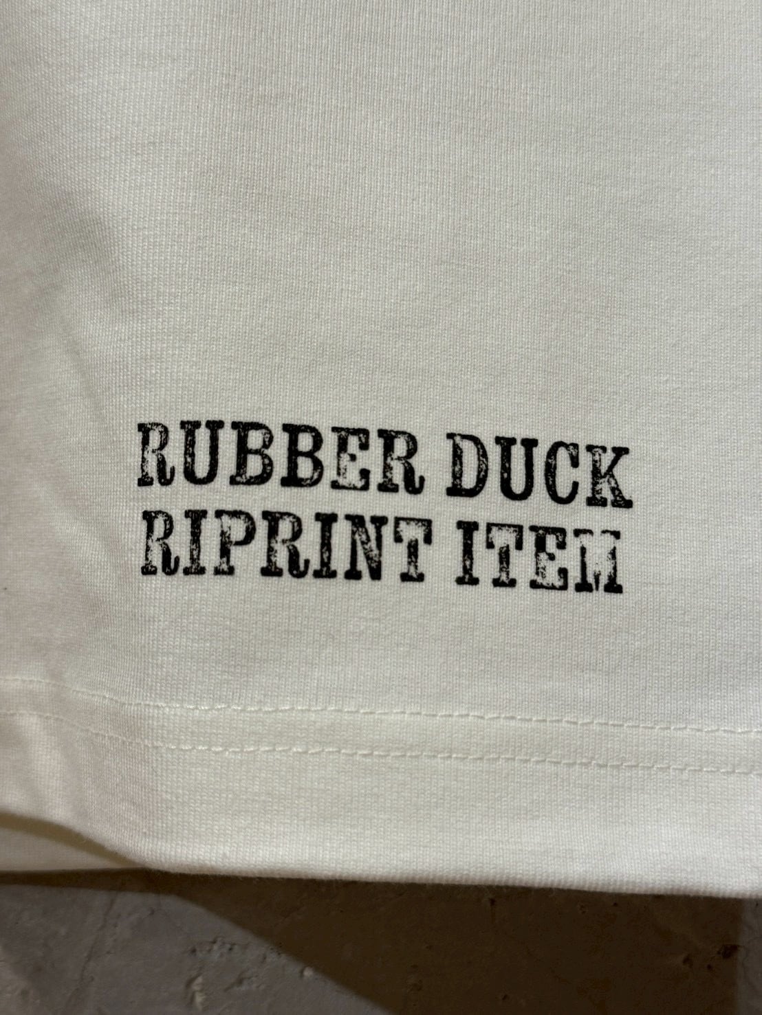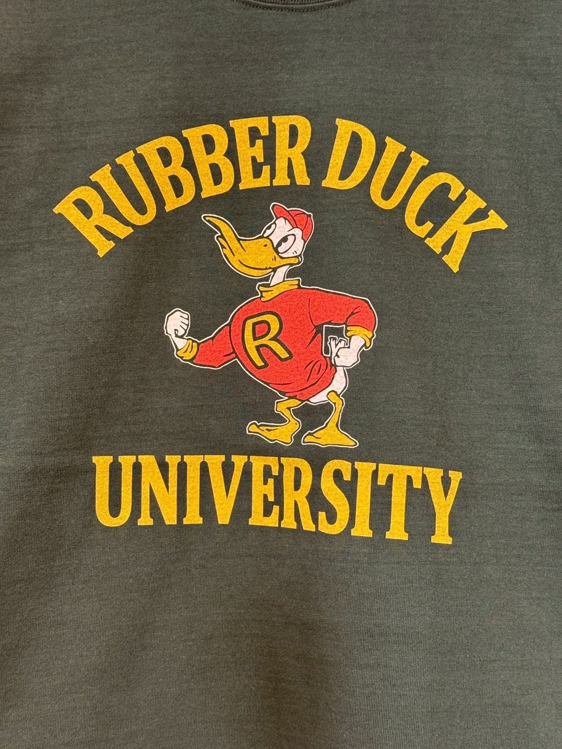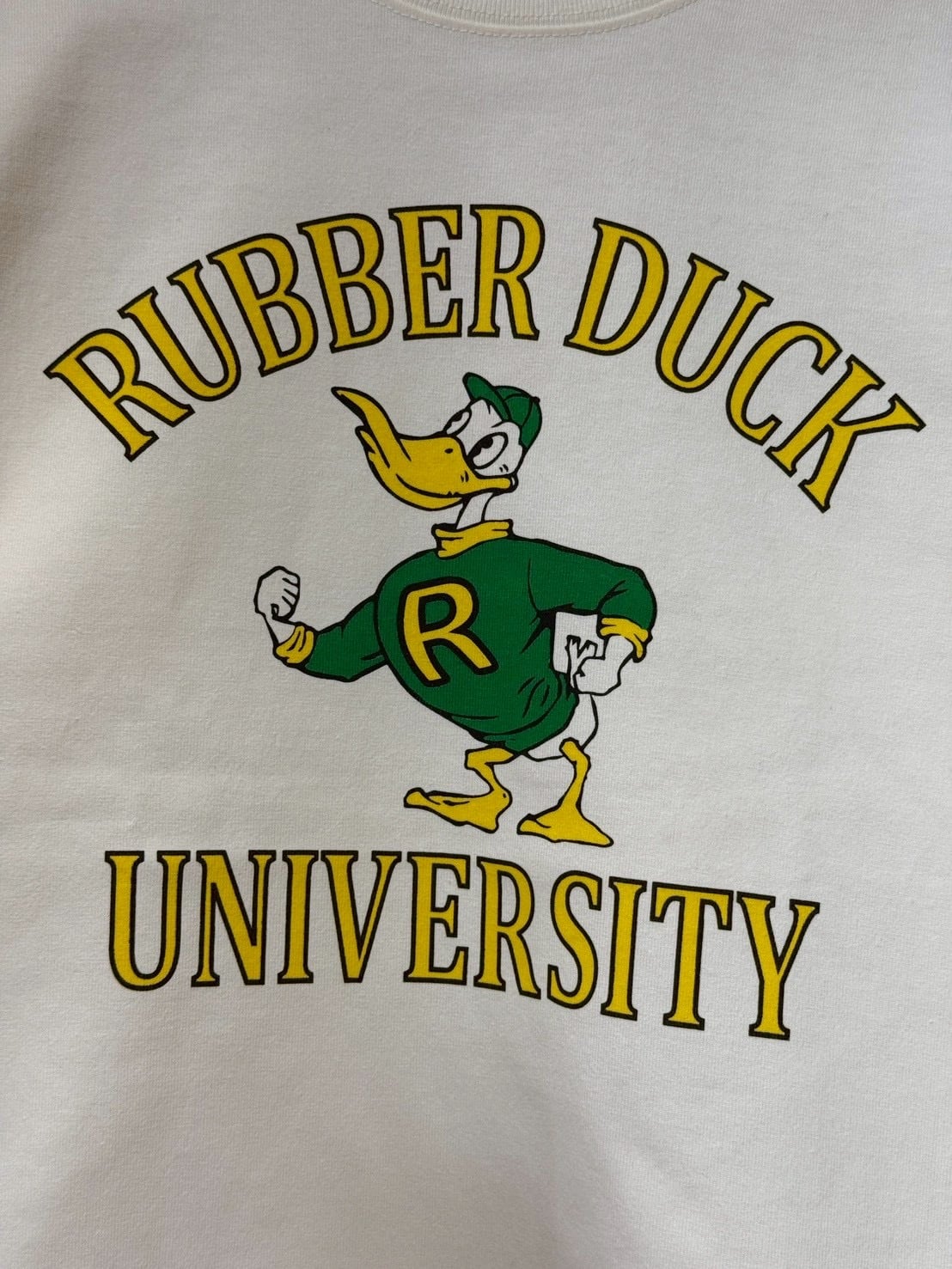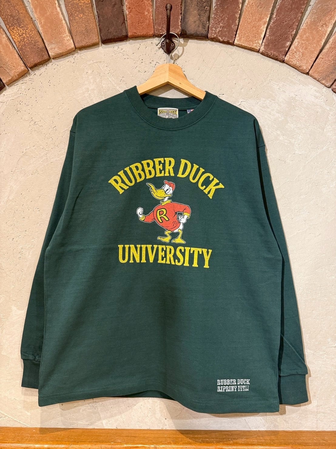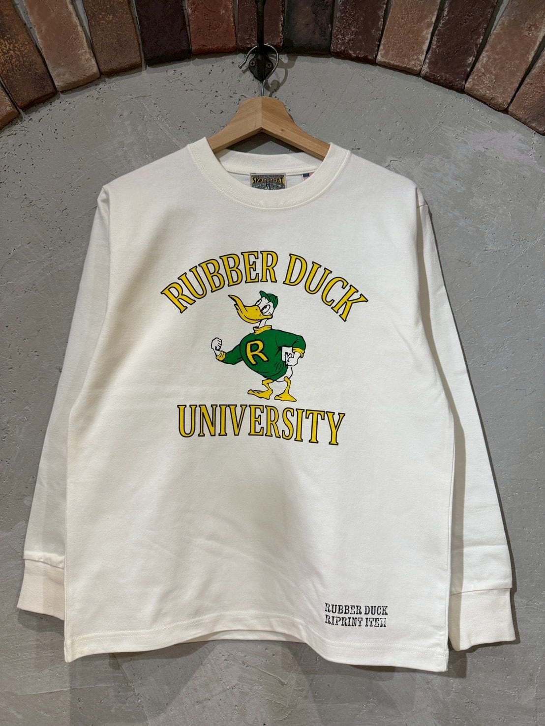 "RUBBER DUCK,オリジナルのカレッジプリントを施した長袖ティーシャツ。