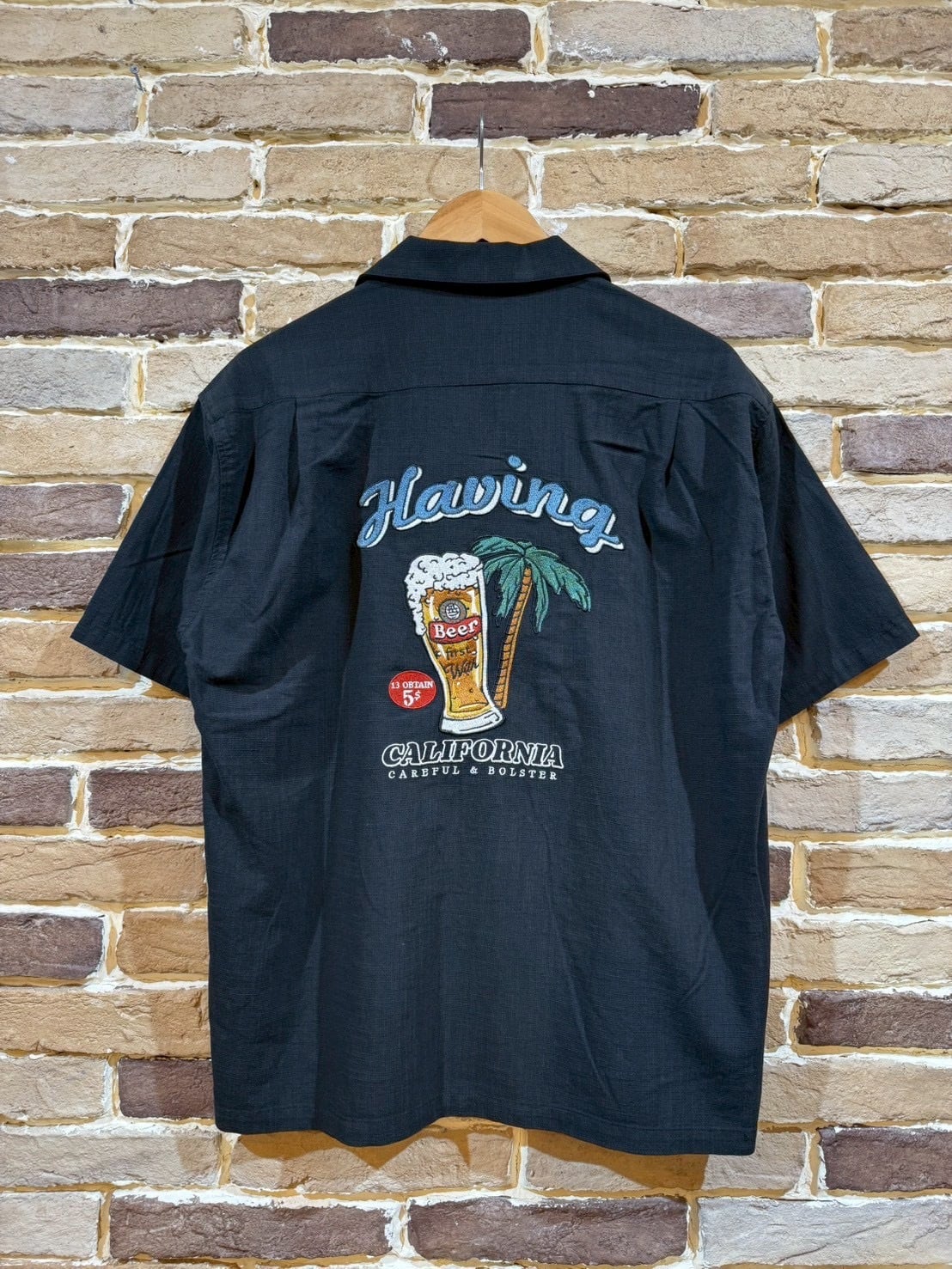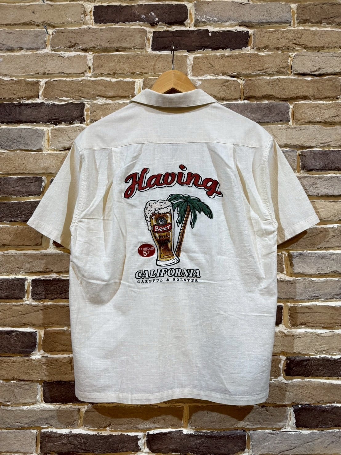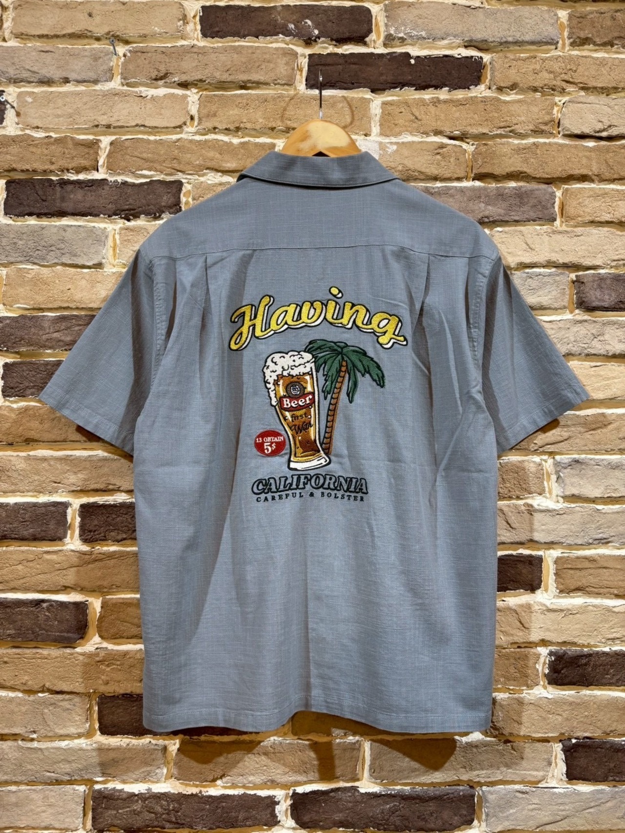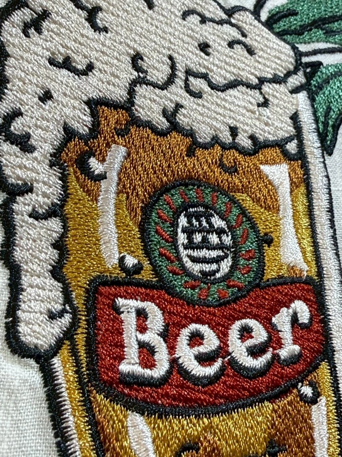ビールを刺繍で施した麻ライク(のような)シャツ。フロントもワンポイント刺繡が施されています。