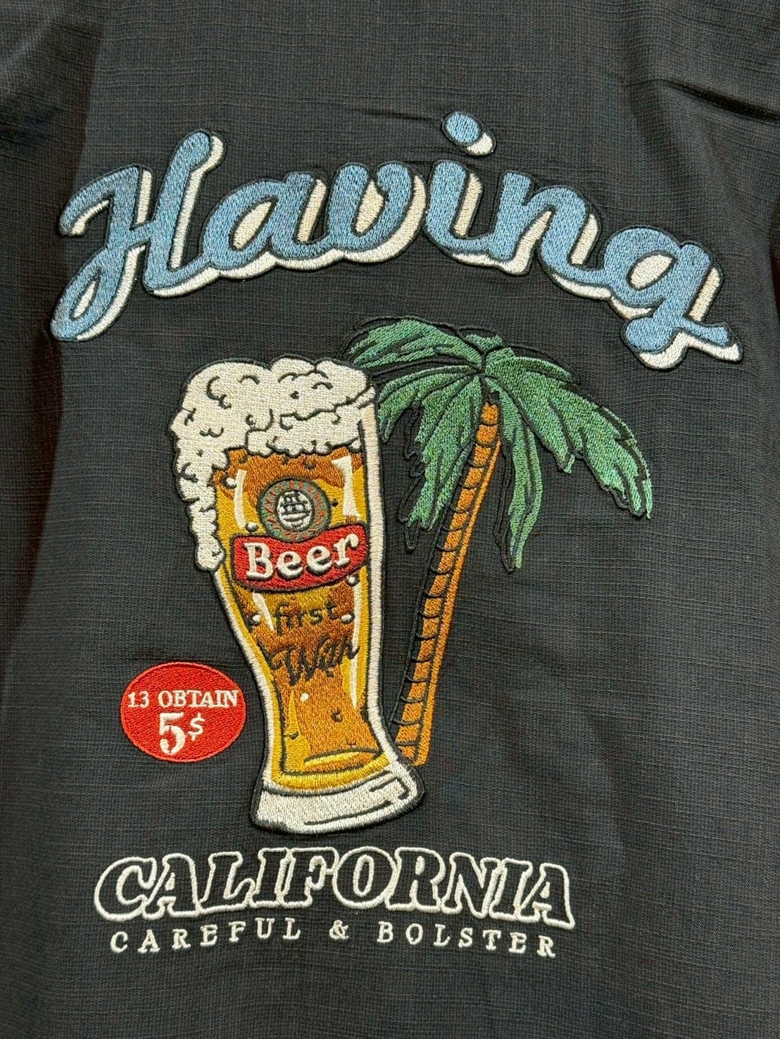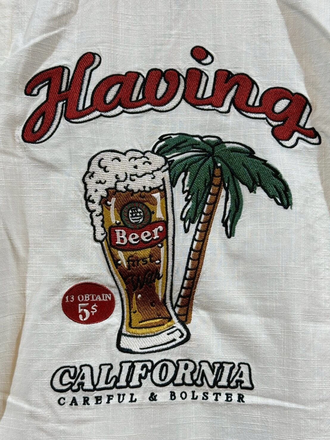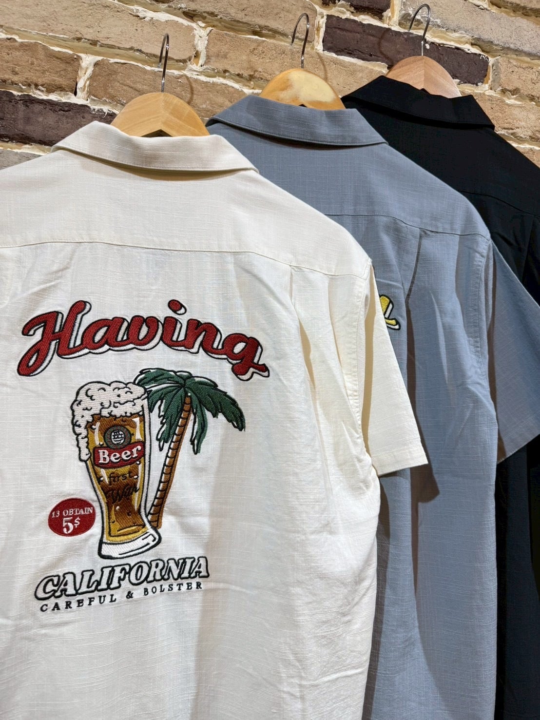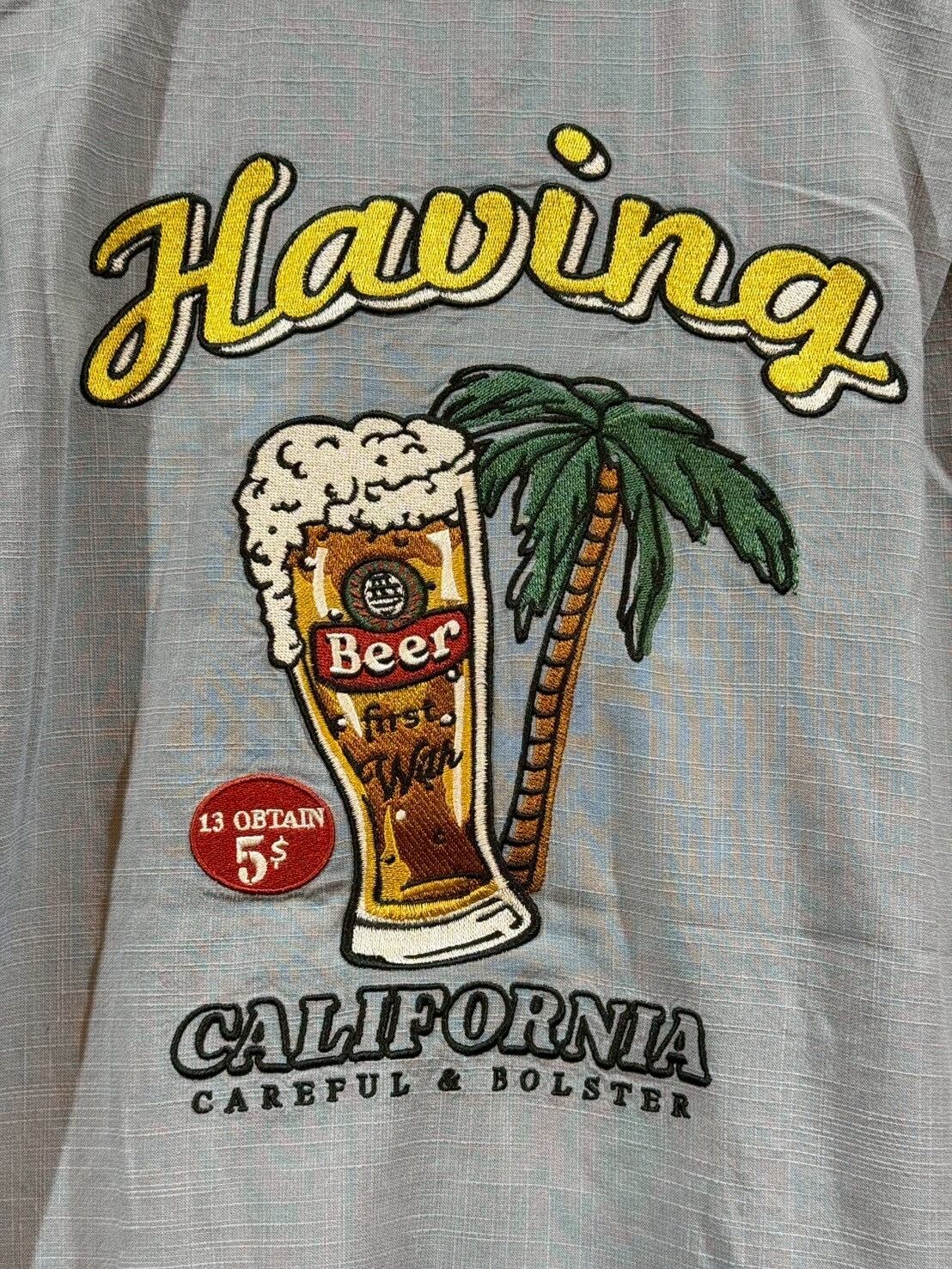 ビールを刺繍で施した麻ライク(のような)シャツ。フロントもワンポイント刺繡が施されています。