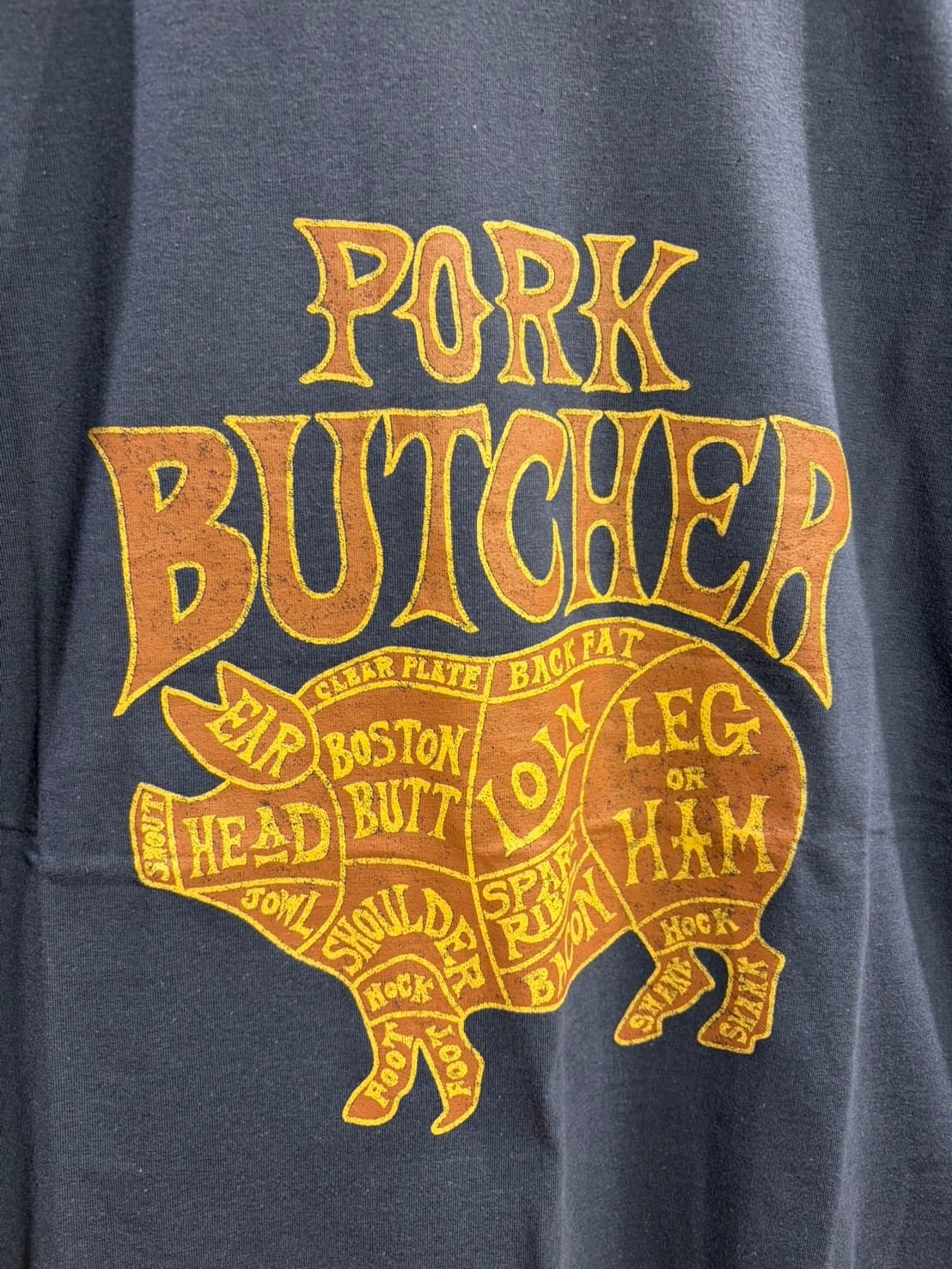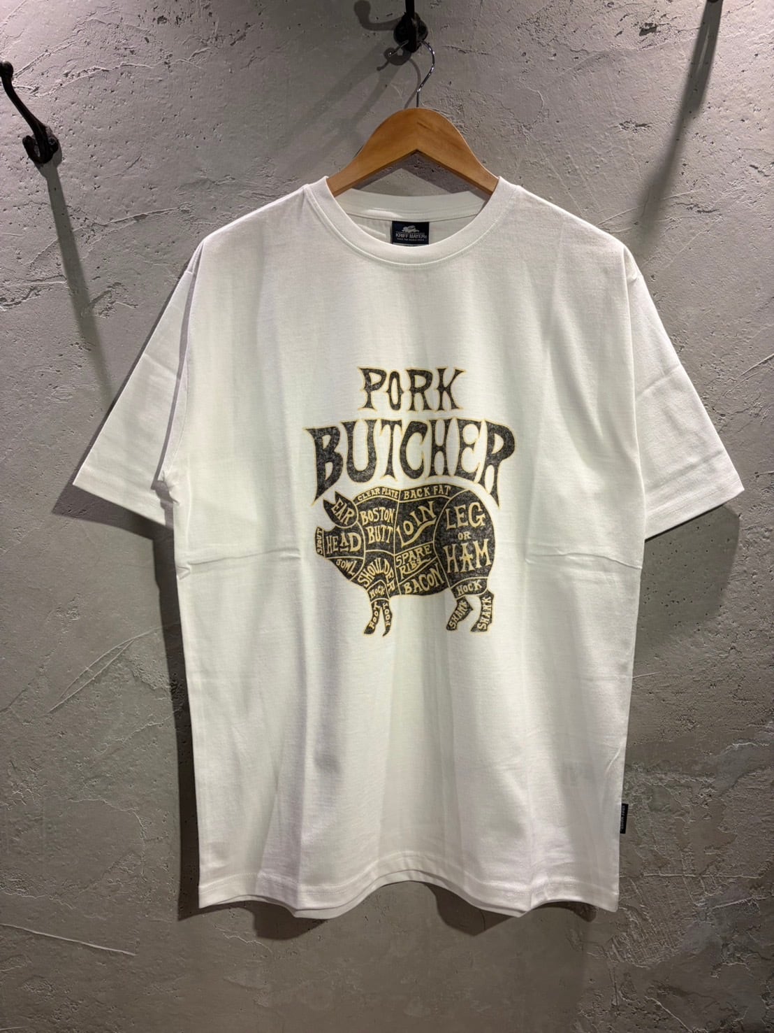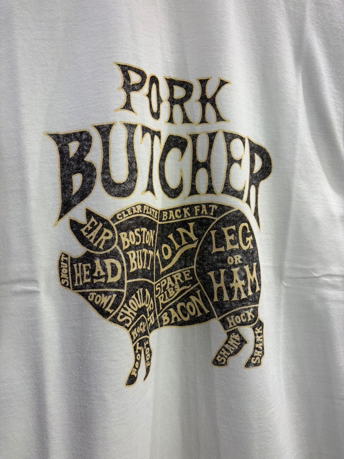 架空の豚肉店の店員のユニフォームをイメージベースにしたグラフィックTシャツ。