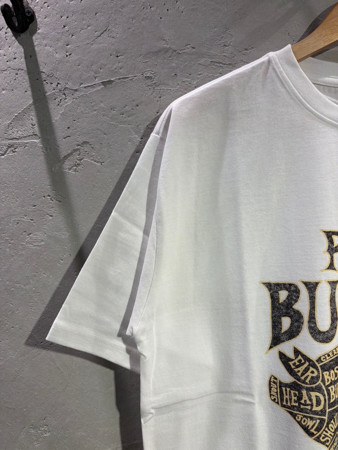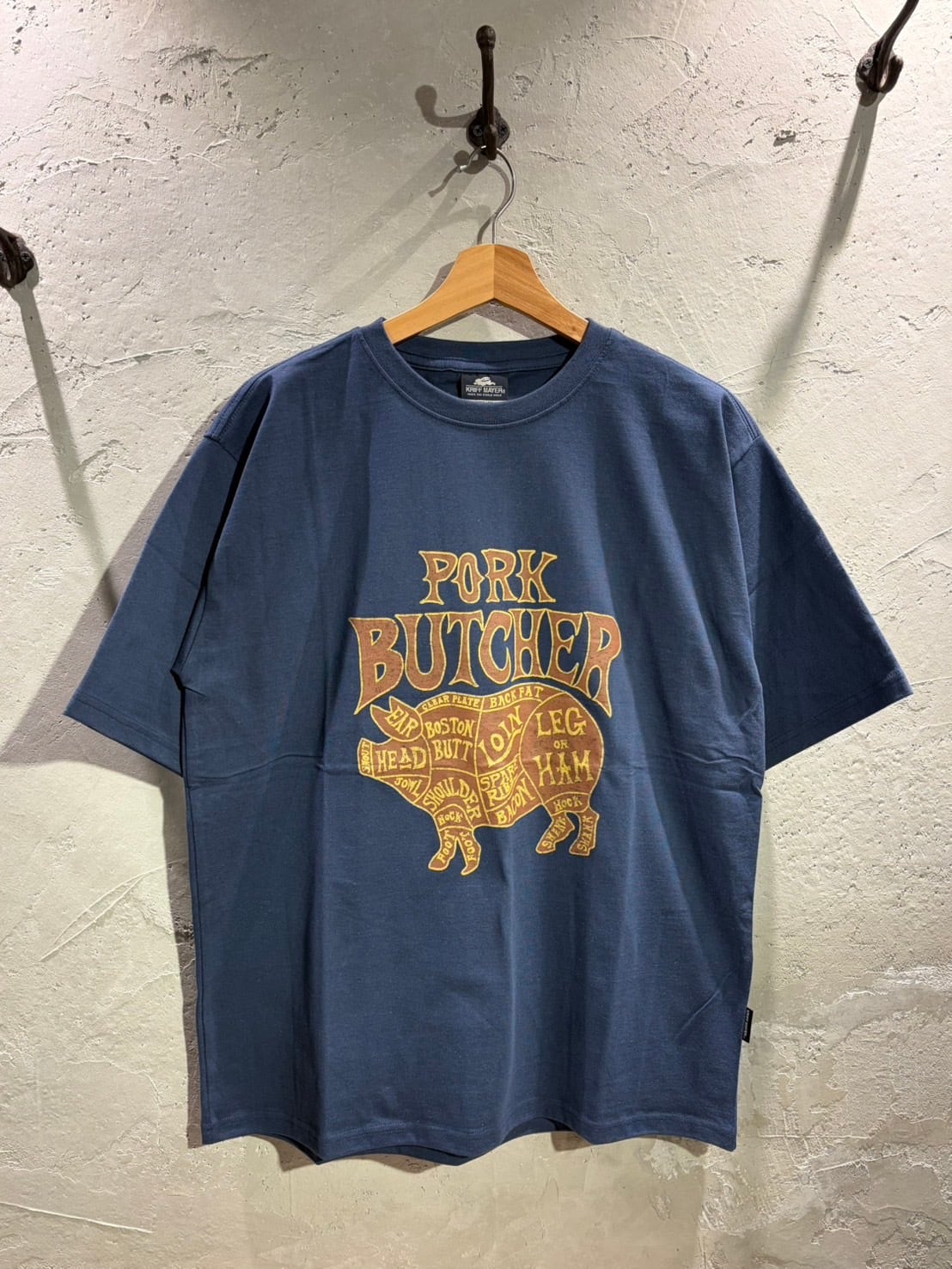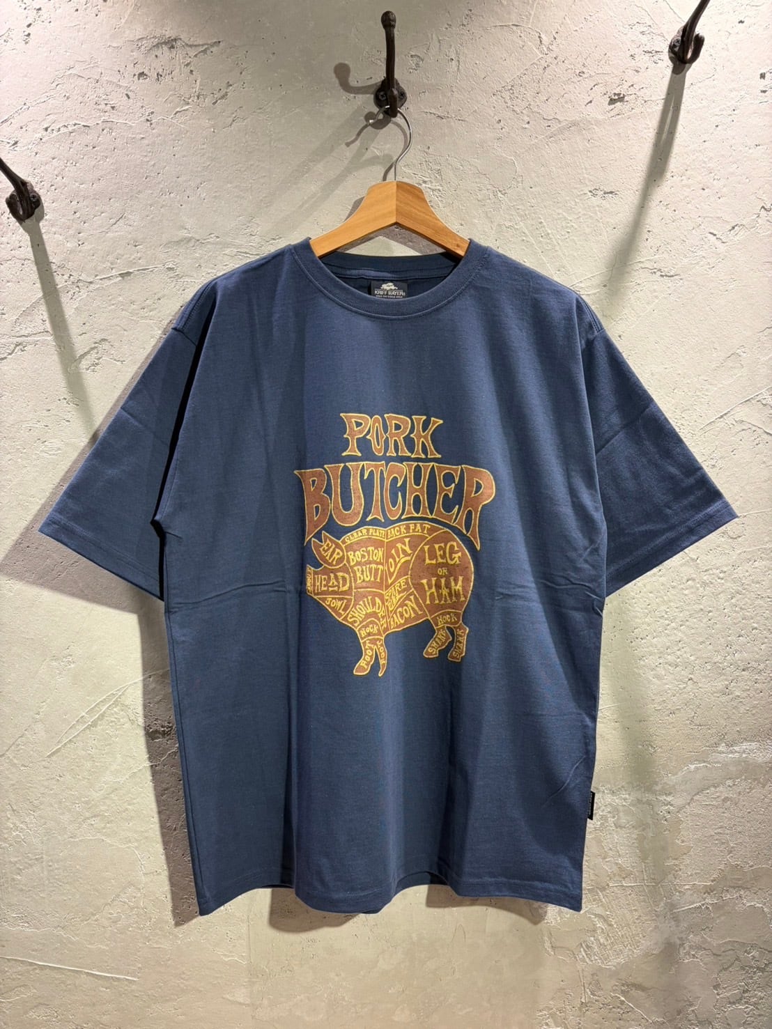 架空の豚肉店の店員のユニフォームをイメージベースにしたグラフィックTシャツ。
