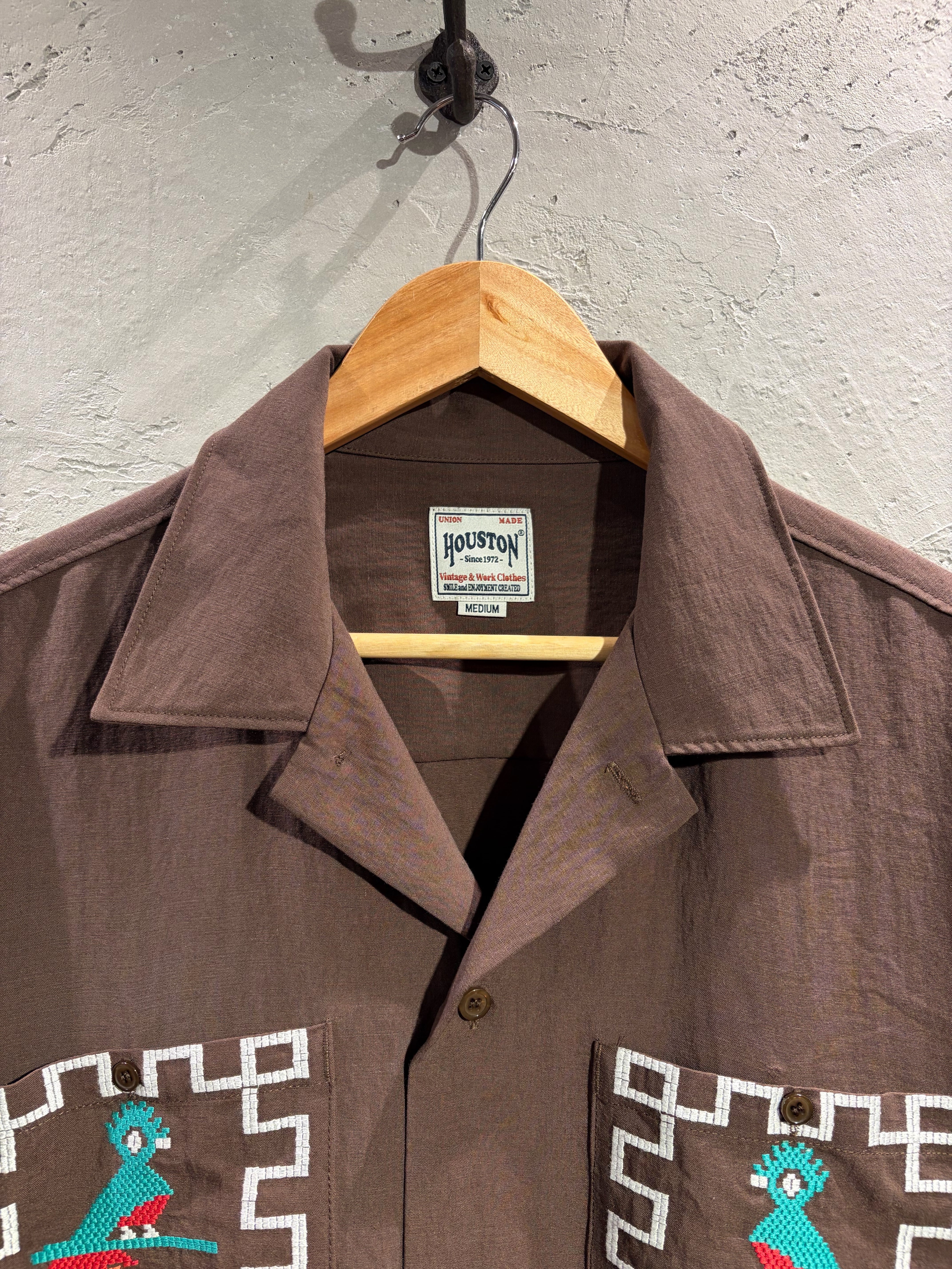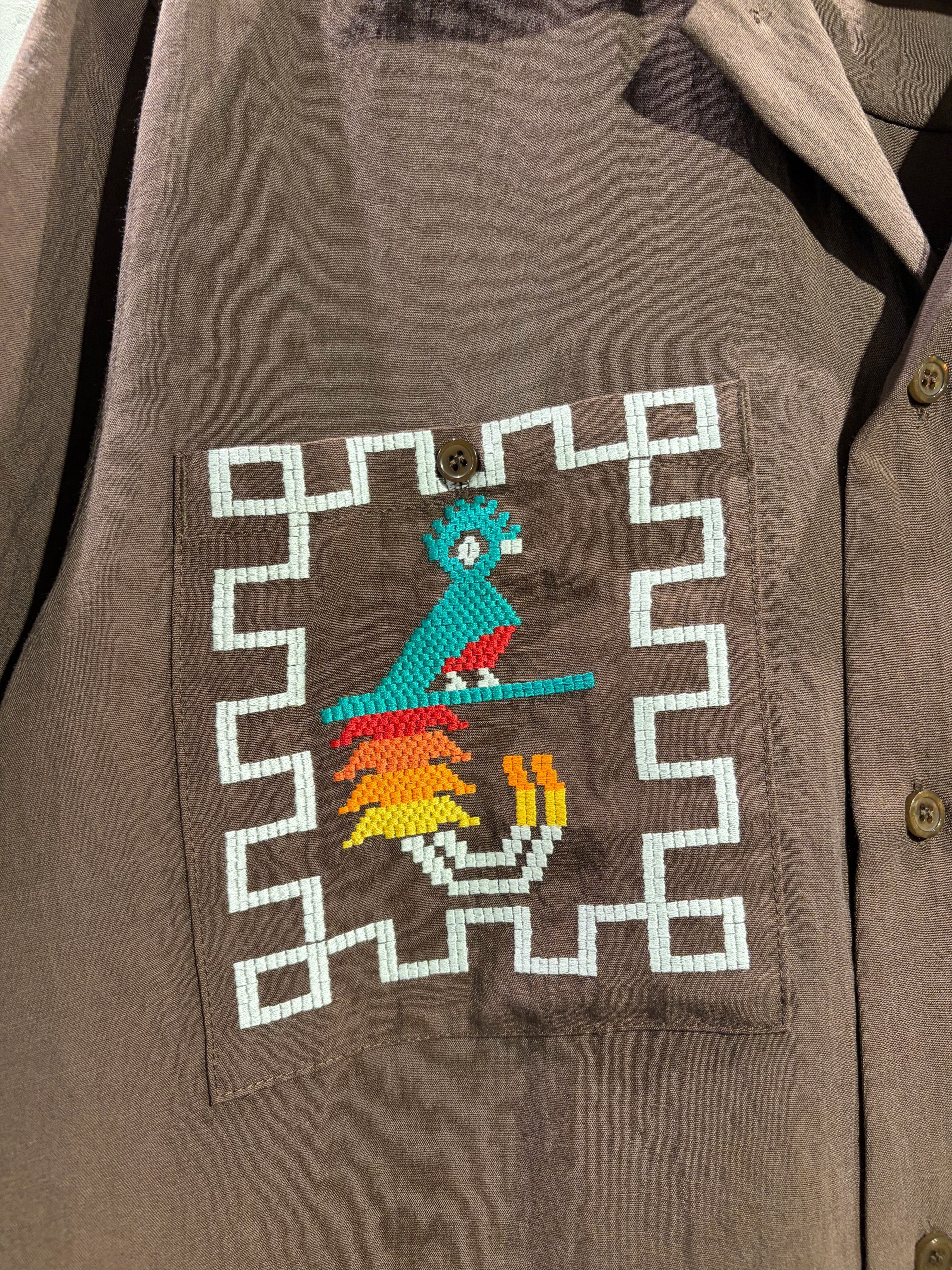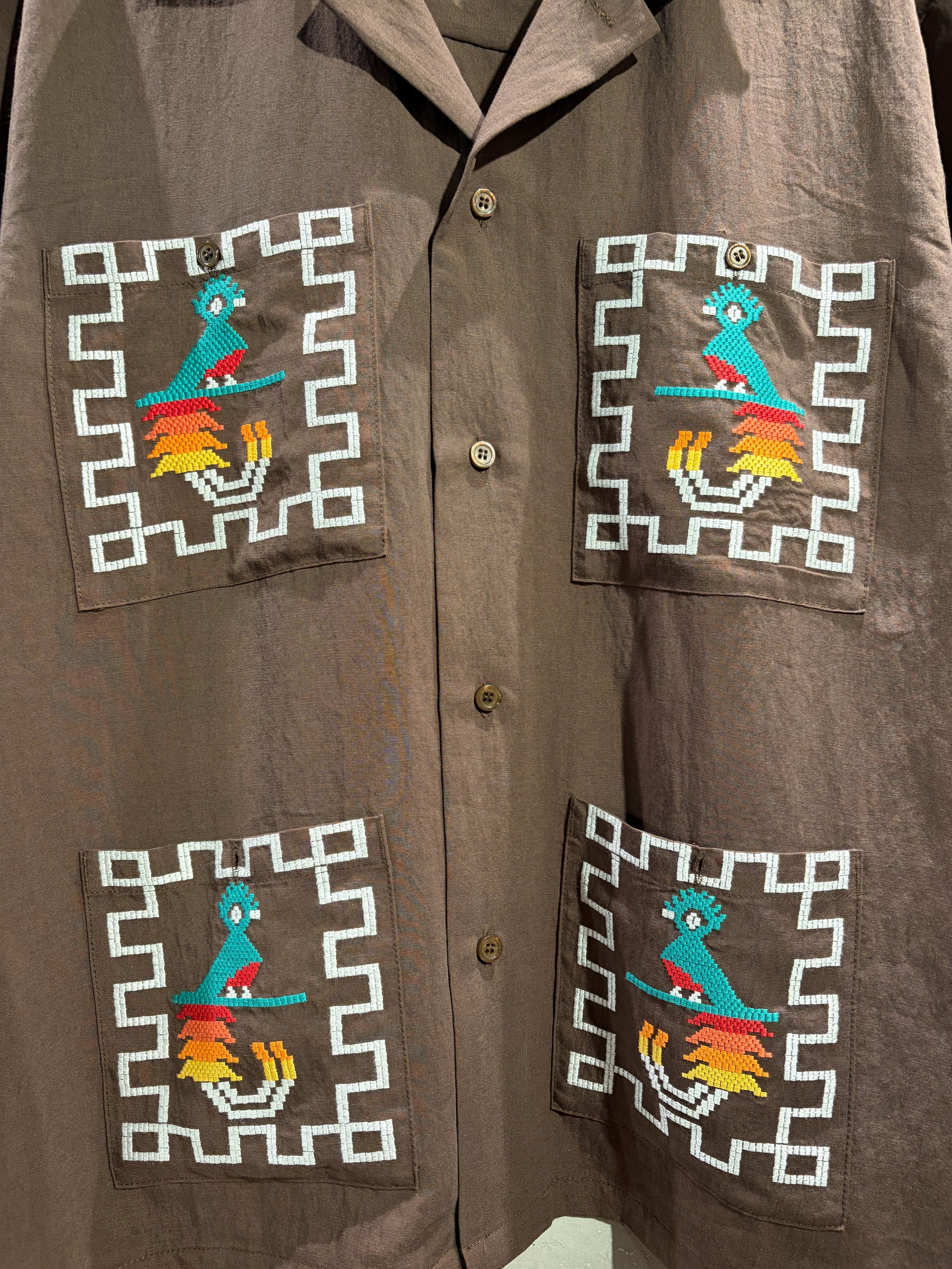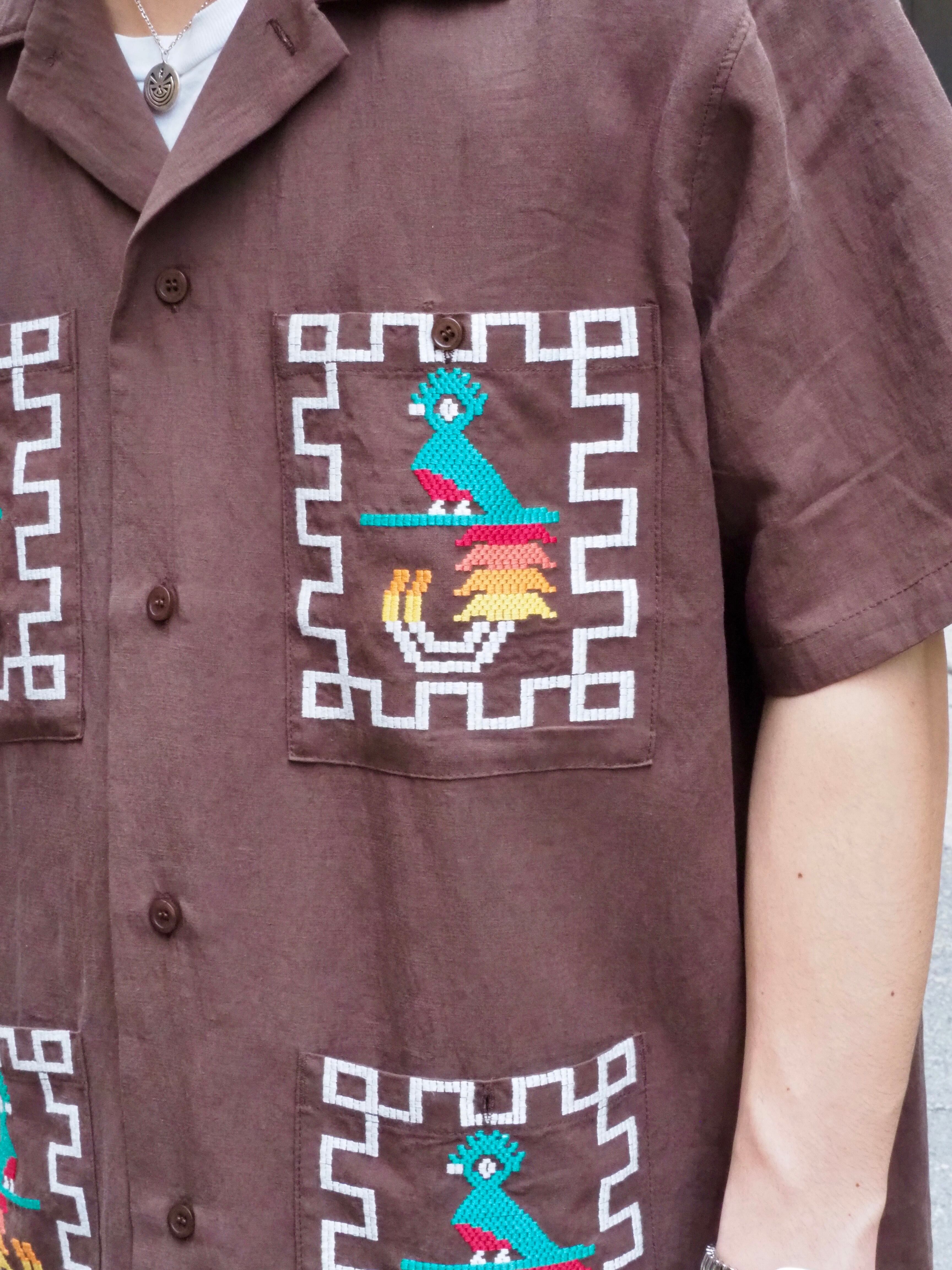 グアテマラの国鳥"ケツァール"のカラフルな刺繍を施したシャツ。ハリのあるリネンレーヨン素材を使用し、ゆとりあるサイズ感に仕上げた清涼感のある一着。身頃のポケットは大きめに配置し、アメカジはもちろん、コーディネートの主役になるアイテム。