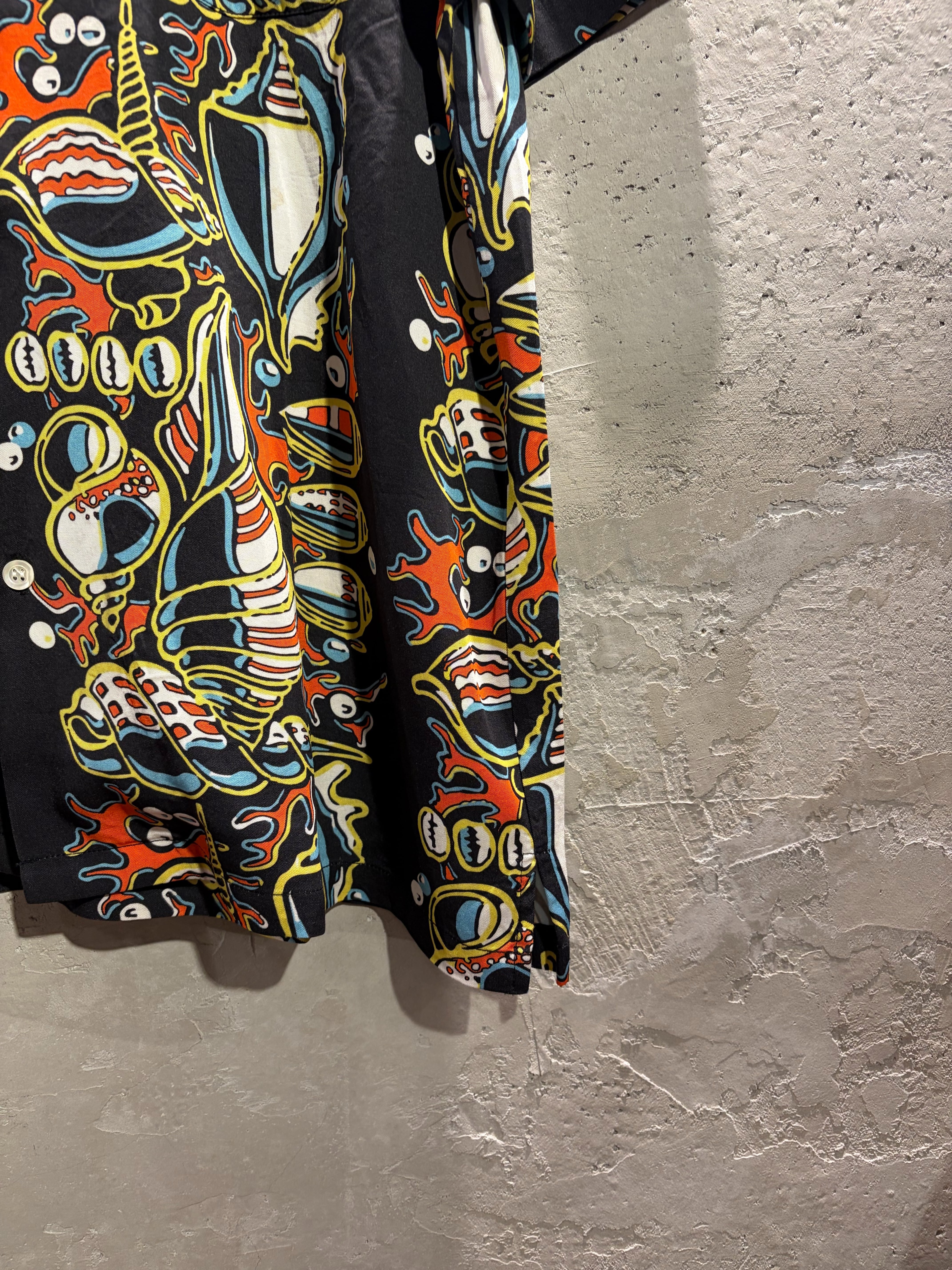 レーヨンよりも光沢と発色性が良く、ヴィンテージのスカジャンなどにも使用され、軽撥水性もあるアセテートを使用したアロハシャツシリーズ。海中柄というジャンルがあり、その中でも珍しい巻貝とサンゴのボーダーパターンをチョイス。ボタンはナチュラルな模様と光沢が美しい、貝ボタンを贅沢に採用。