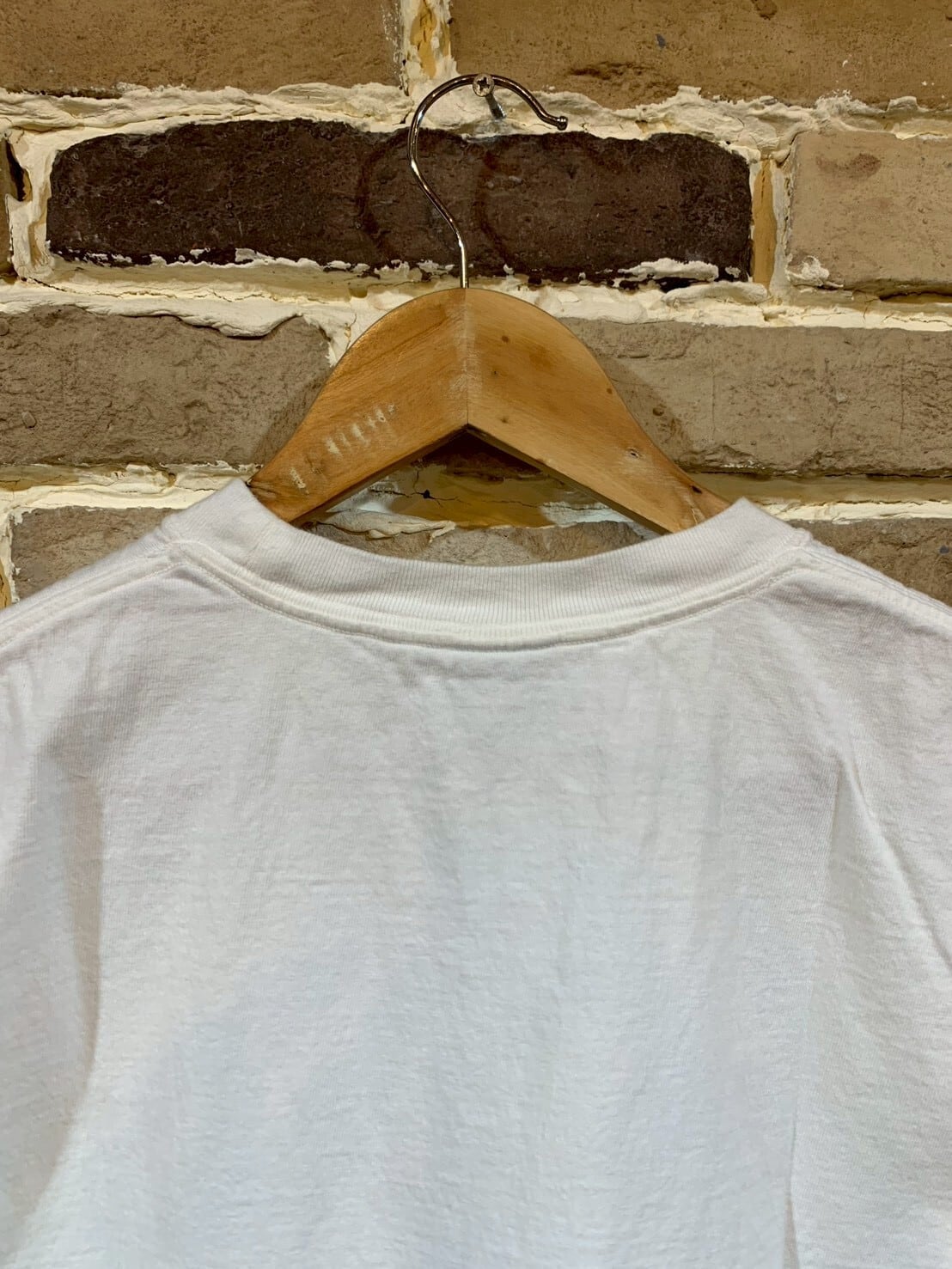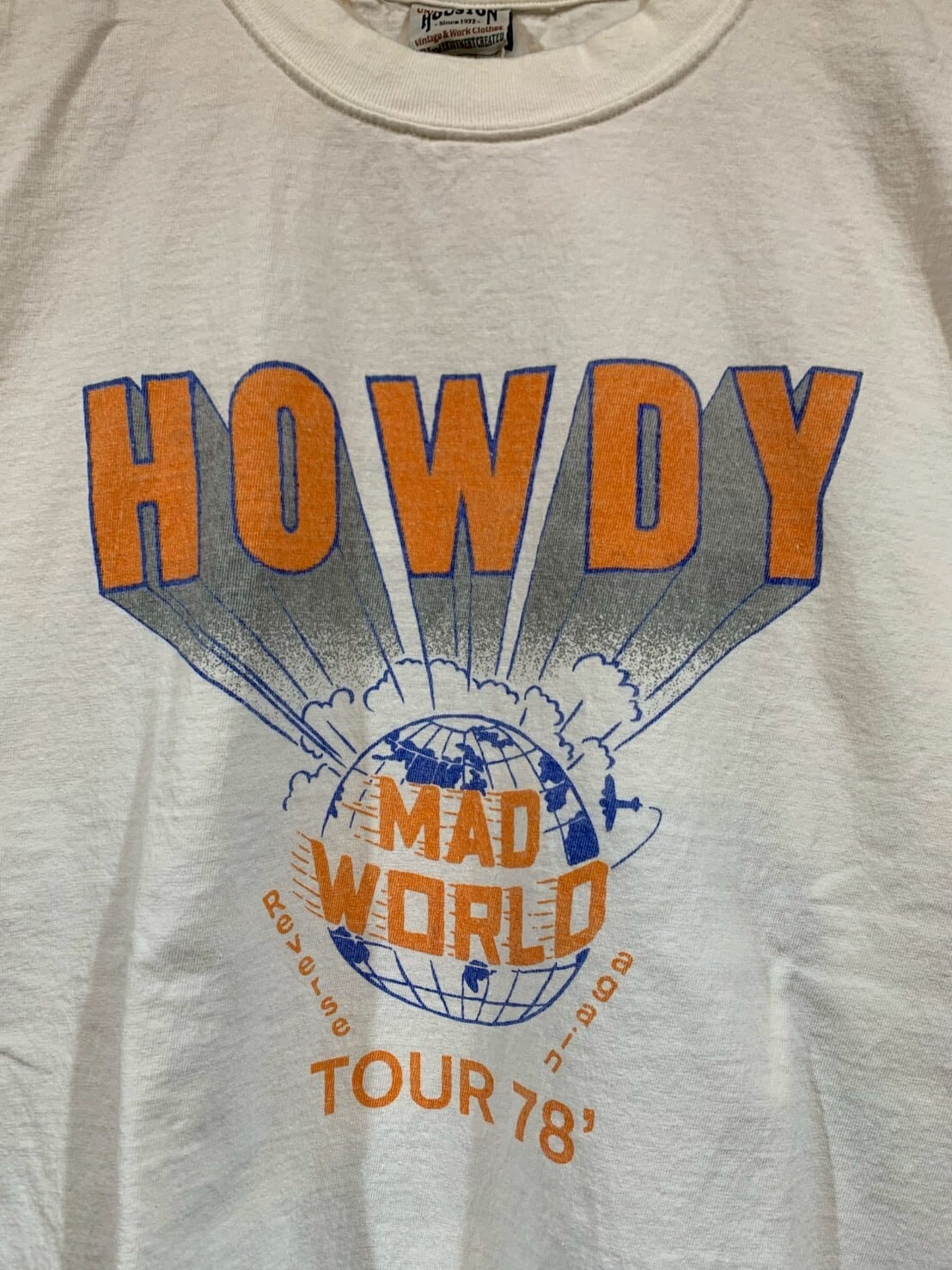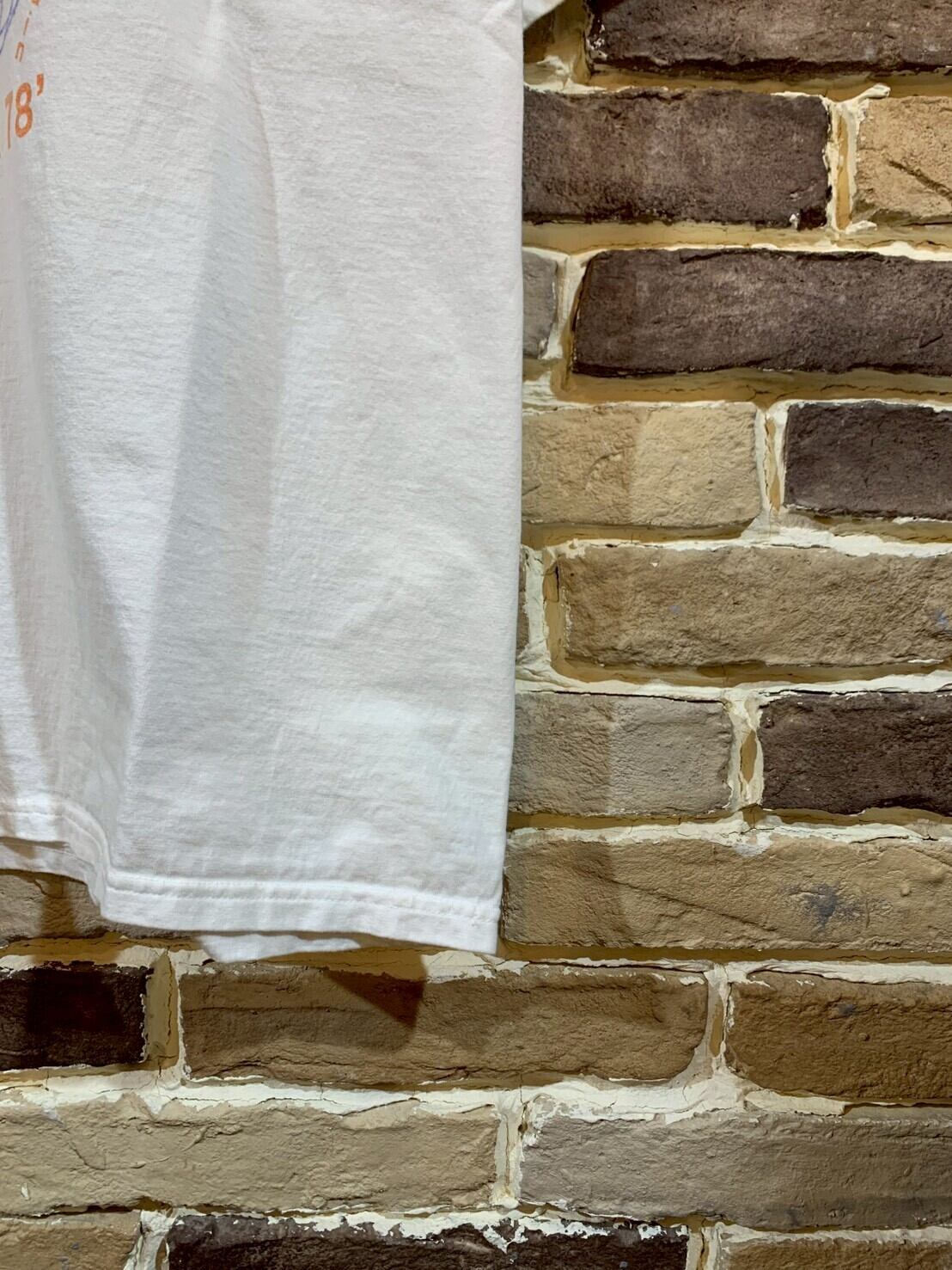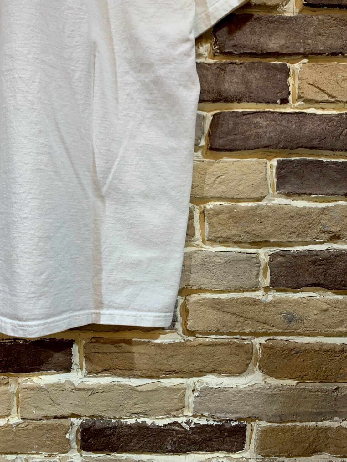 織りに編み立てた17番単糸の完全オリジナル生地を使用。ピグメントバイオ加工と相まってUSED感のあるTEEに仕上がっています。プリントは70'sバンドツアーTEEをイメージした、ラフな挨拶言葉を交えたユーモアあふれるメッセージが面白いデザイン。昔ながらの丸胴ボディで縫い目が肌に当たらず快適な着心地。(XXLは編み機の構造上ハギ有になります)