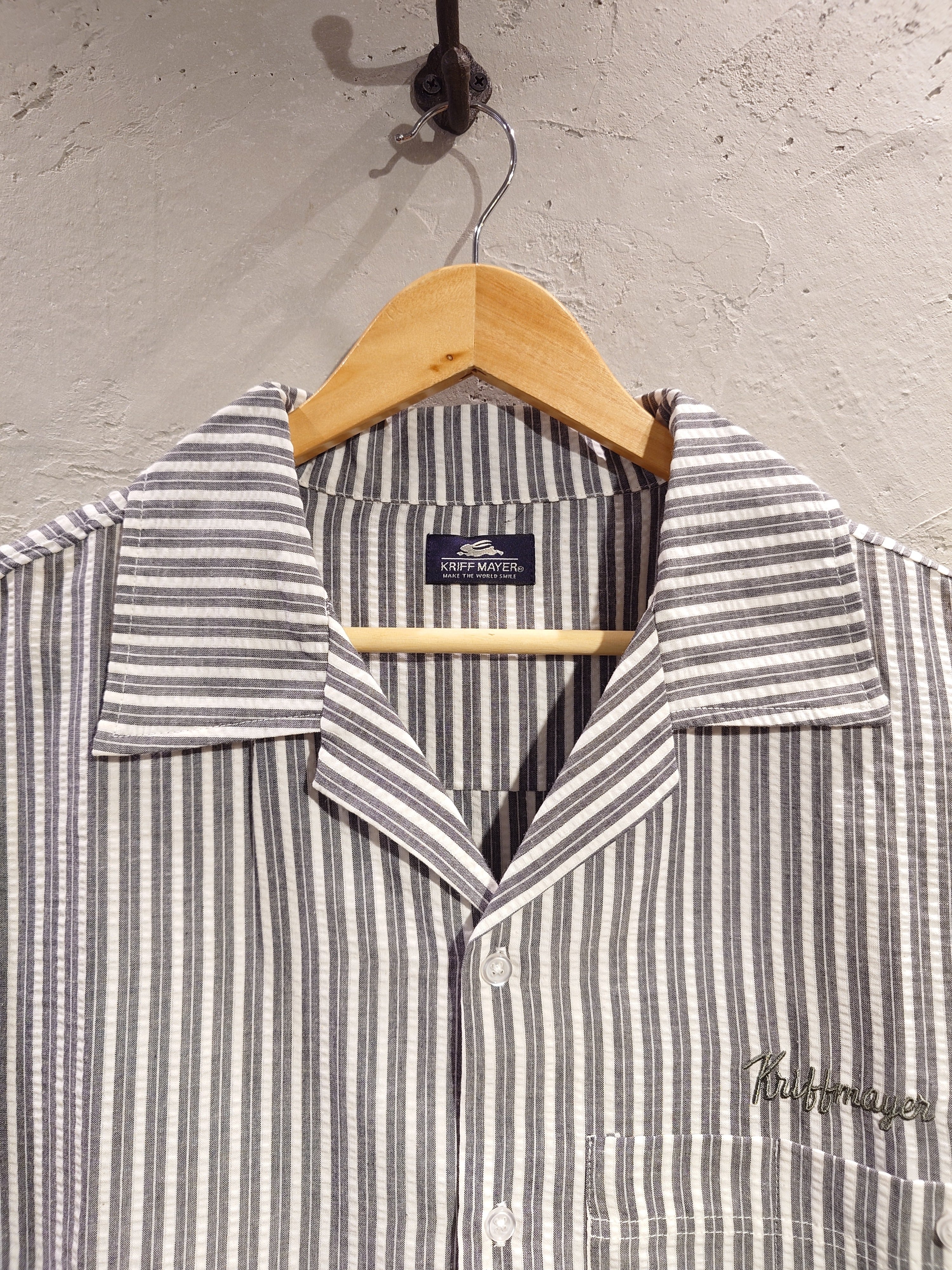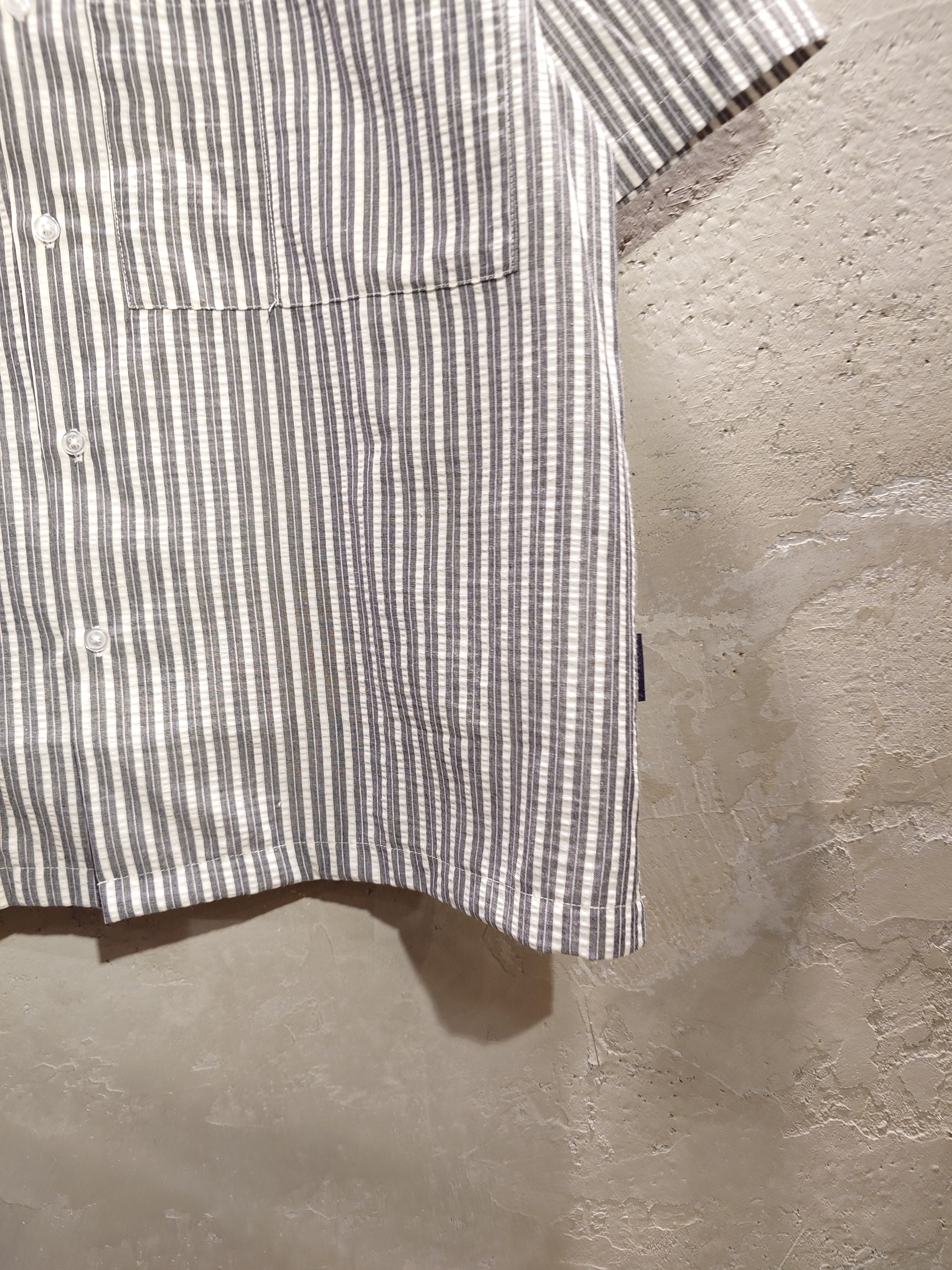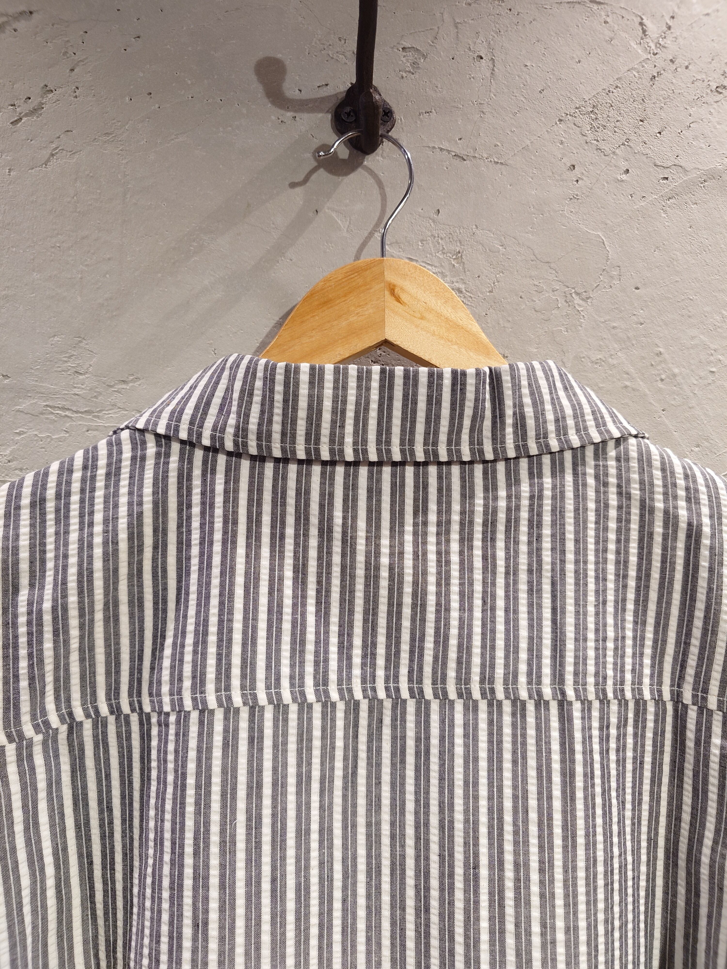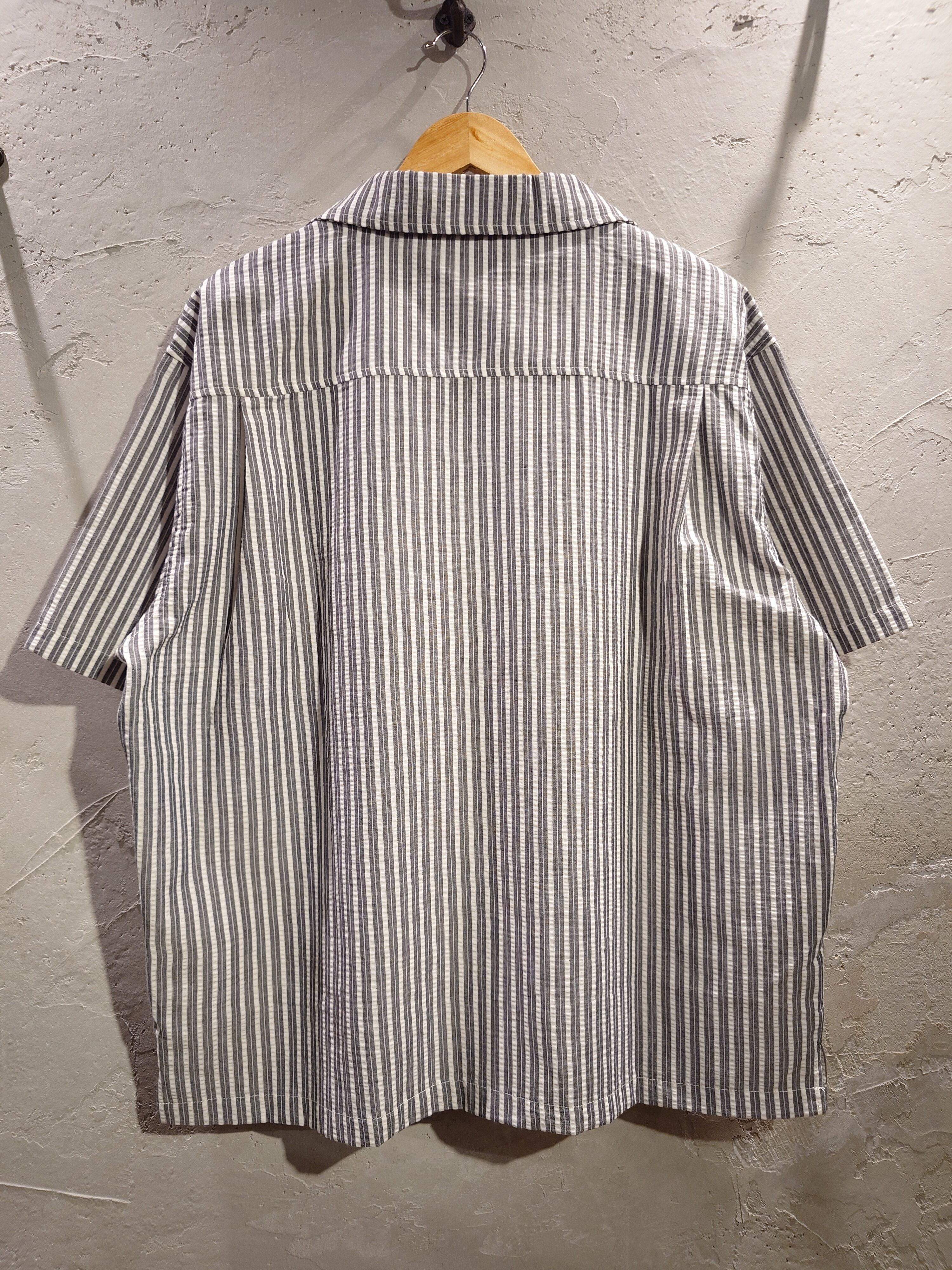 シアサッカーストライプの開襟シャツ。軽やかな生地感に清涼感のある爽やかなカラーで、着心地だけでなく見た目にも涼しいアイテムです。タンクトップや無地Tの上に羽織るのにおすすめなアイテムです。