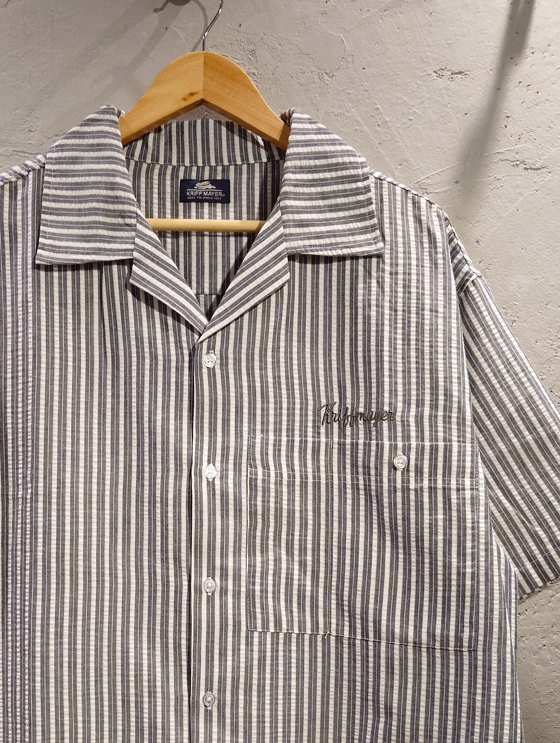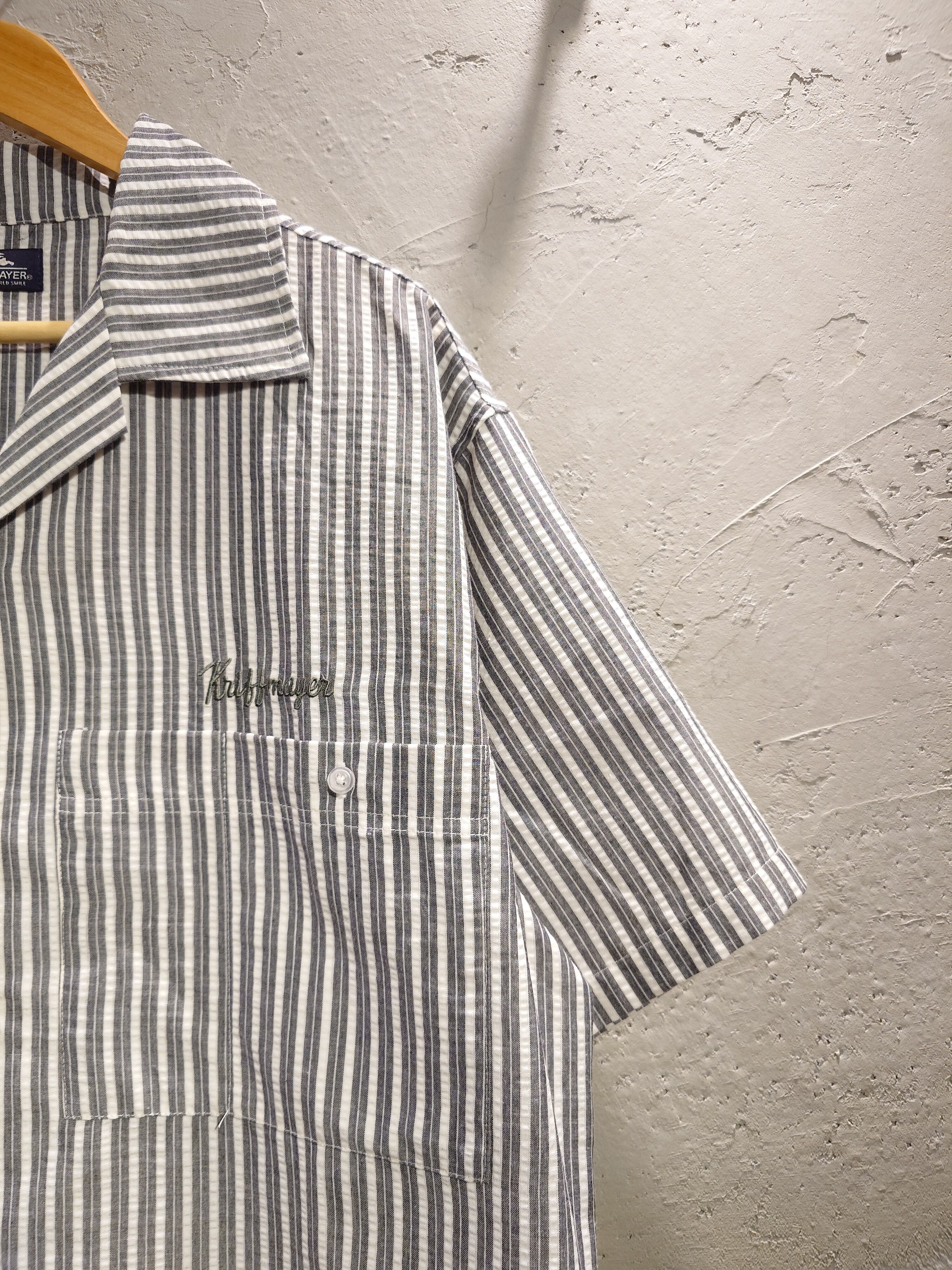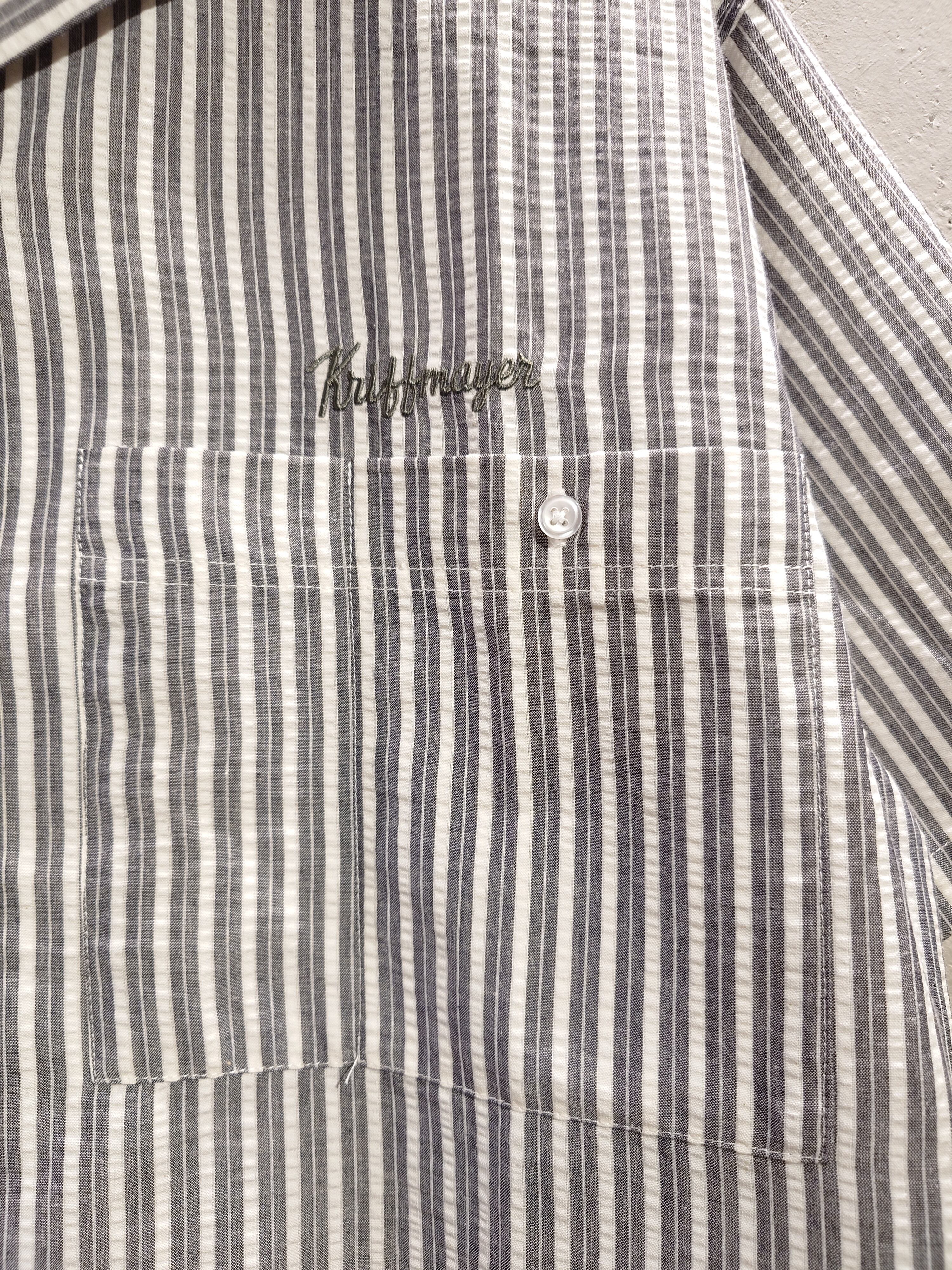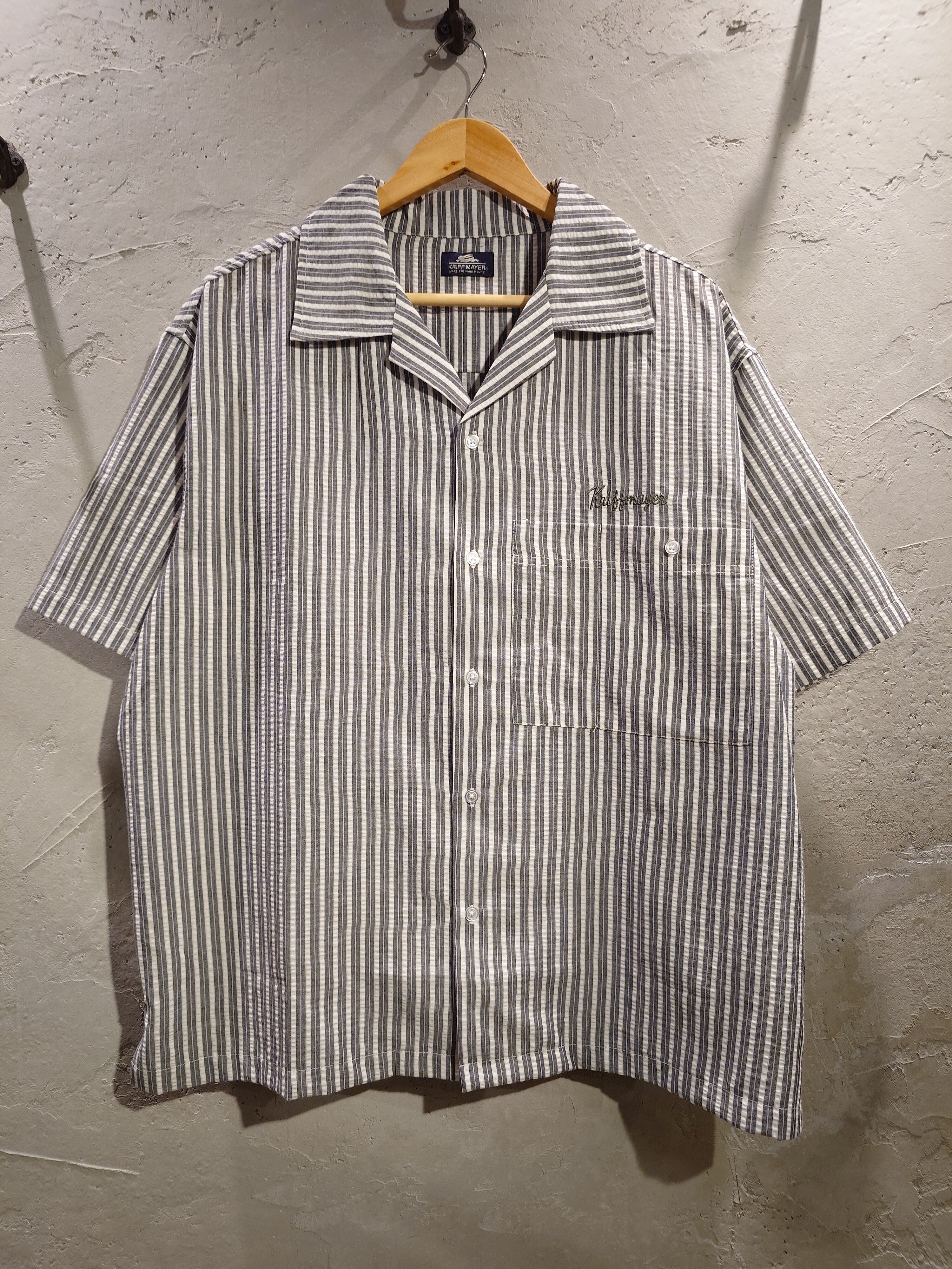 シアサッカーストライプの開襟シャツ。軽やかな生地感に清涼感のある爽やかなカラーで、着心地だけでなく見た目にも涼しいアイテムです。タンクトップや無地Tの上に羽織るのにおすすめなアイテムです。