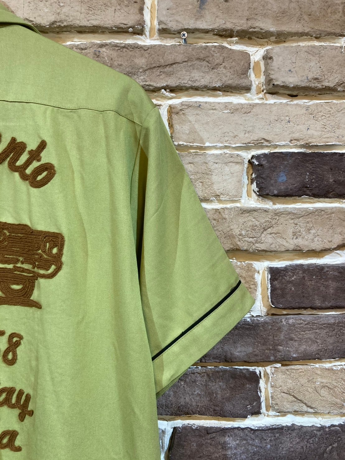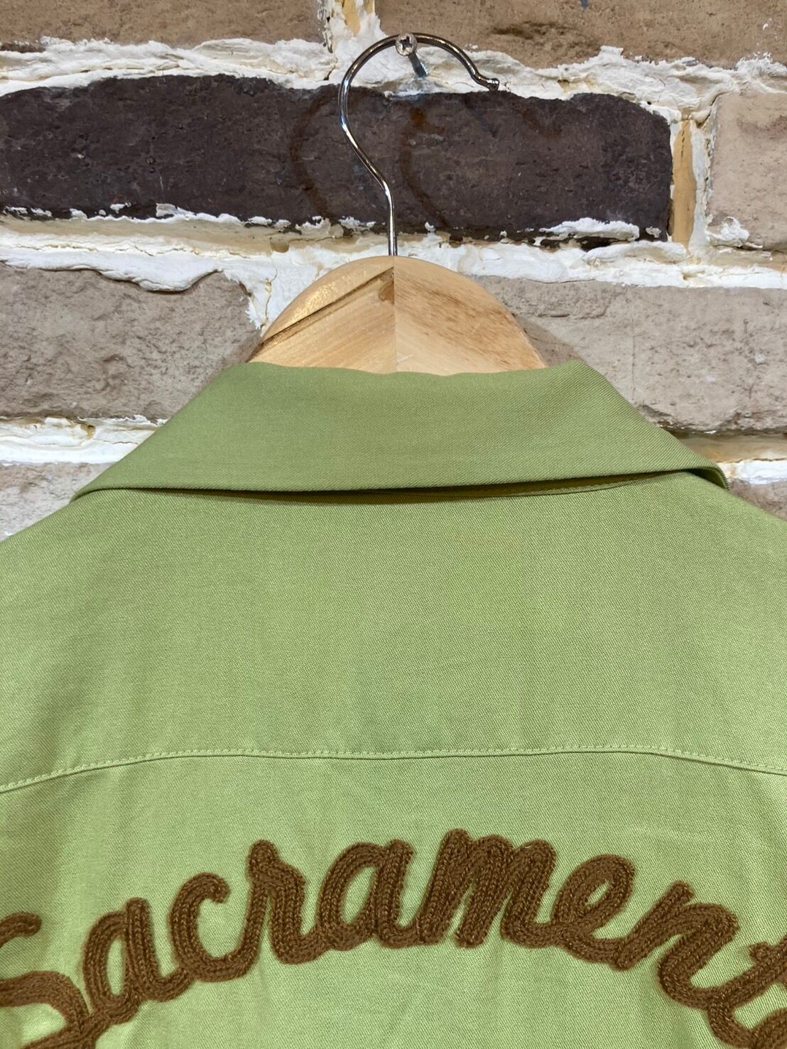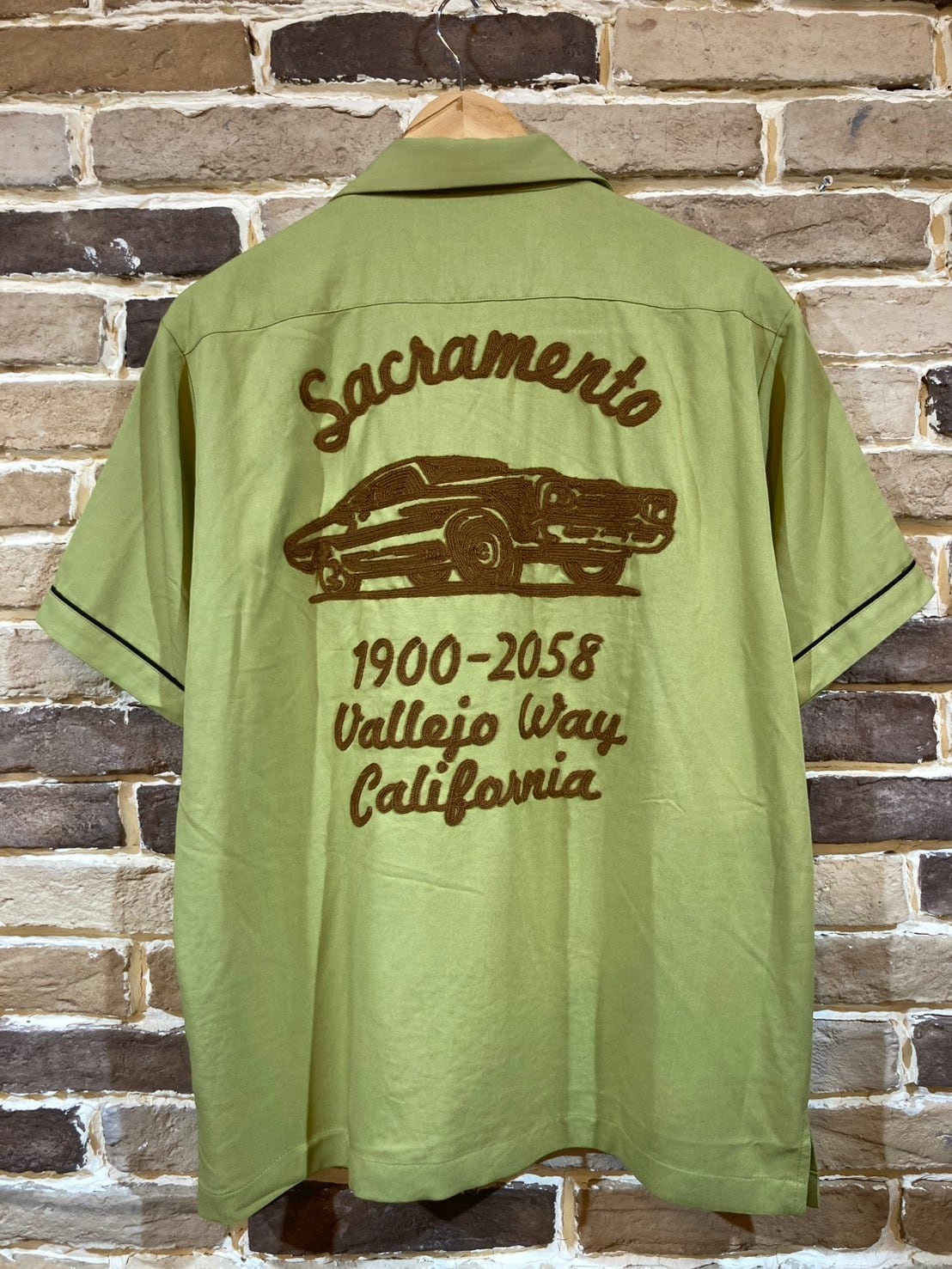 HOUSTONの春夏定番のボウリングシャツ。生地には適度な厚みのレーヨン100%を使用し、暑い季節にぴったりなさらっとした着心地。こだわりのギャラクシーボウリングピンボタンもオリジナルで作製。刺繍にはヴィンテージカークラブジャケットを彷彿とさせる「SACRAMENTO」柄。