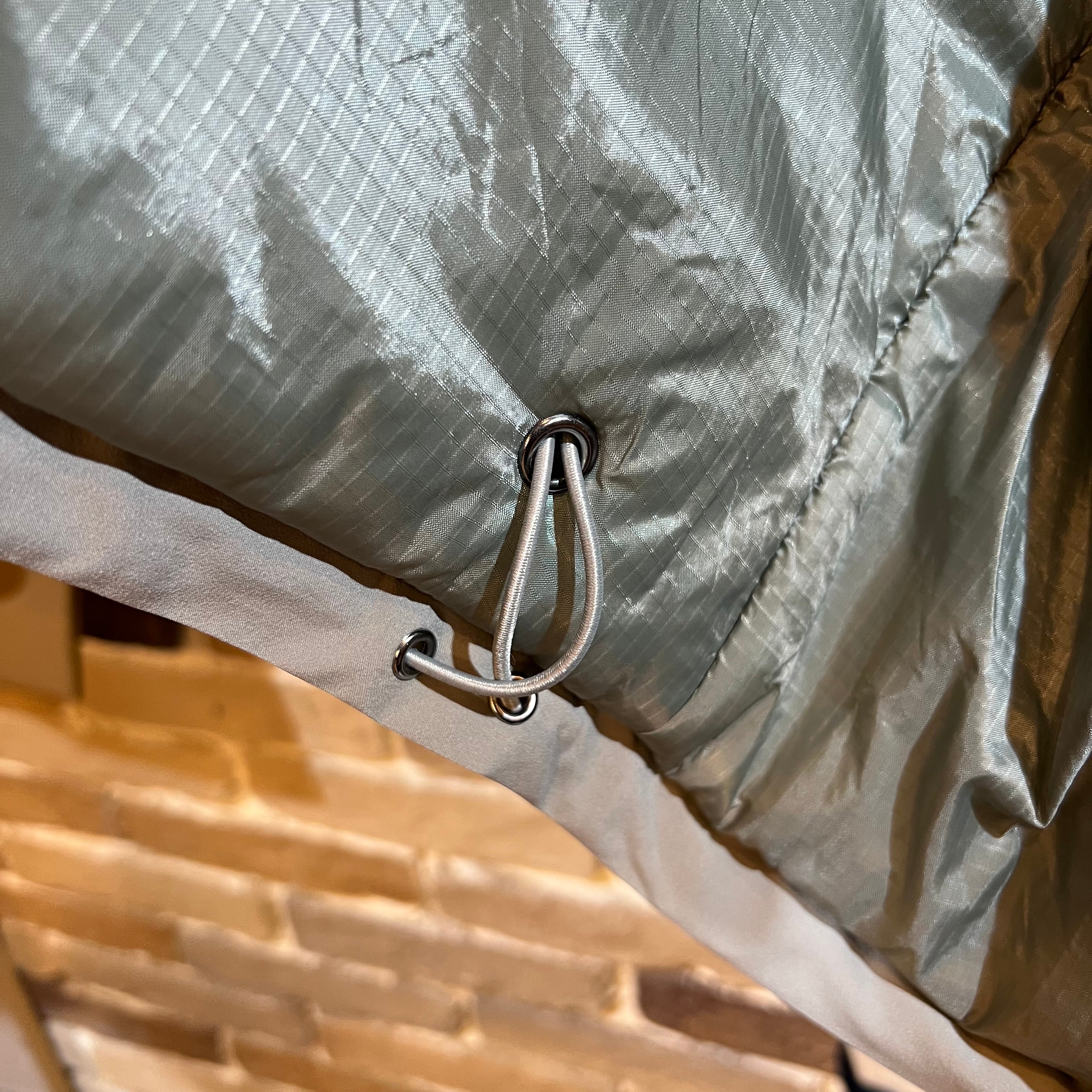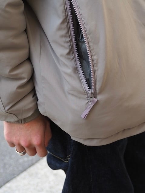 両サイドにはジッパーポケット。ポケット内には裾の絞り具合を調節するゴムスピンドルをデザイン。裏地胸部分にはメッシュポケットを配し、開口部はパイピングのゴム仕様なので収納物が落下しにくくなっている。