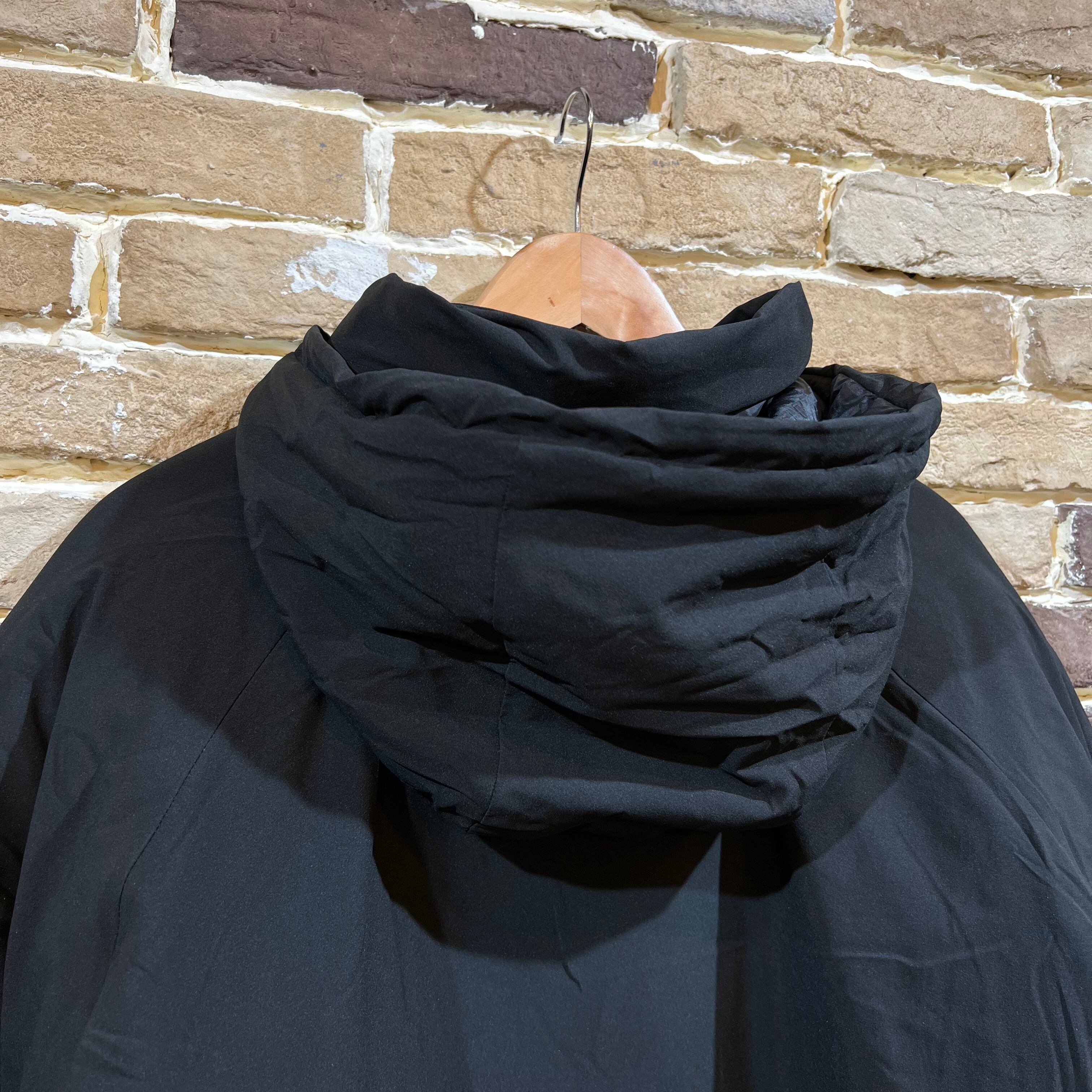 襟は厚みのあるスタンドカラー。襟にはフードが収納されており、フードには絞り具合を調節できるゴムスピンドルコードと開き具合を調節できるベルクロ式のアジャスターがデザインされている。