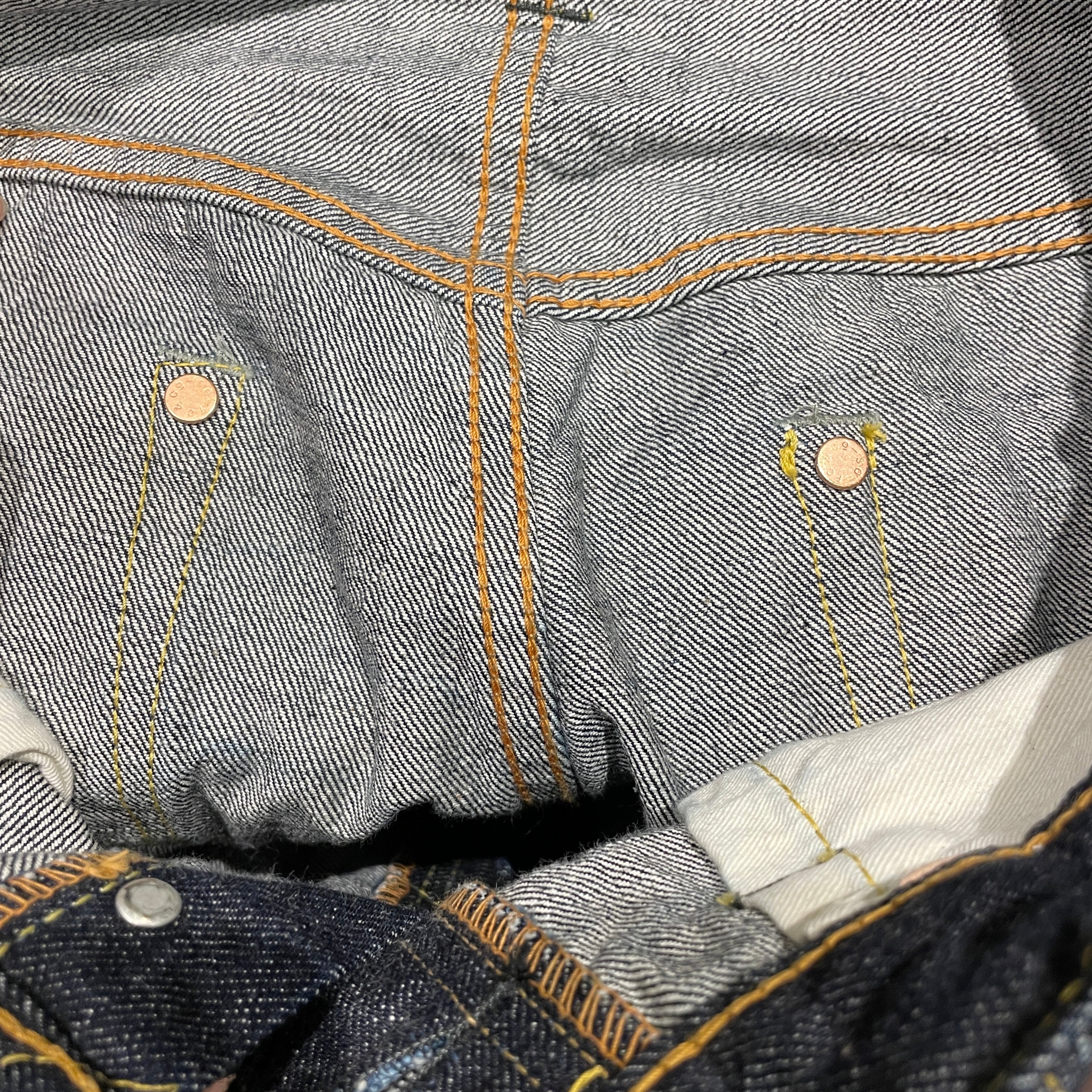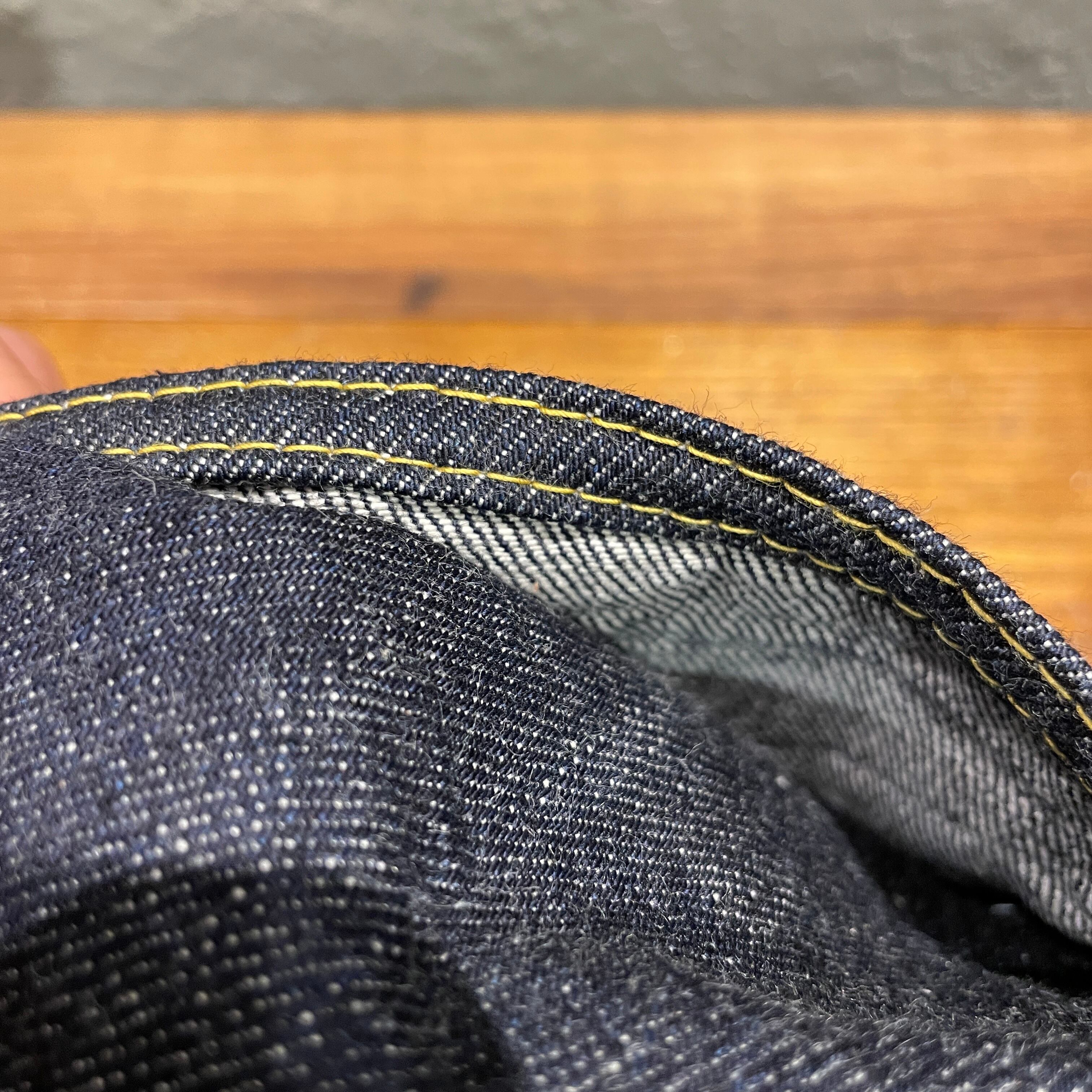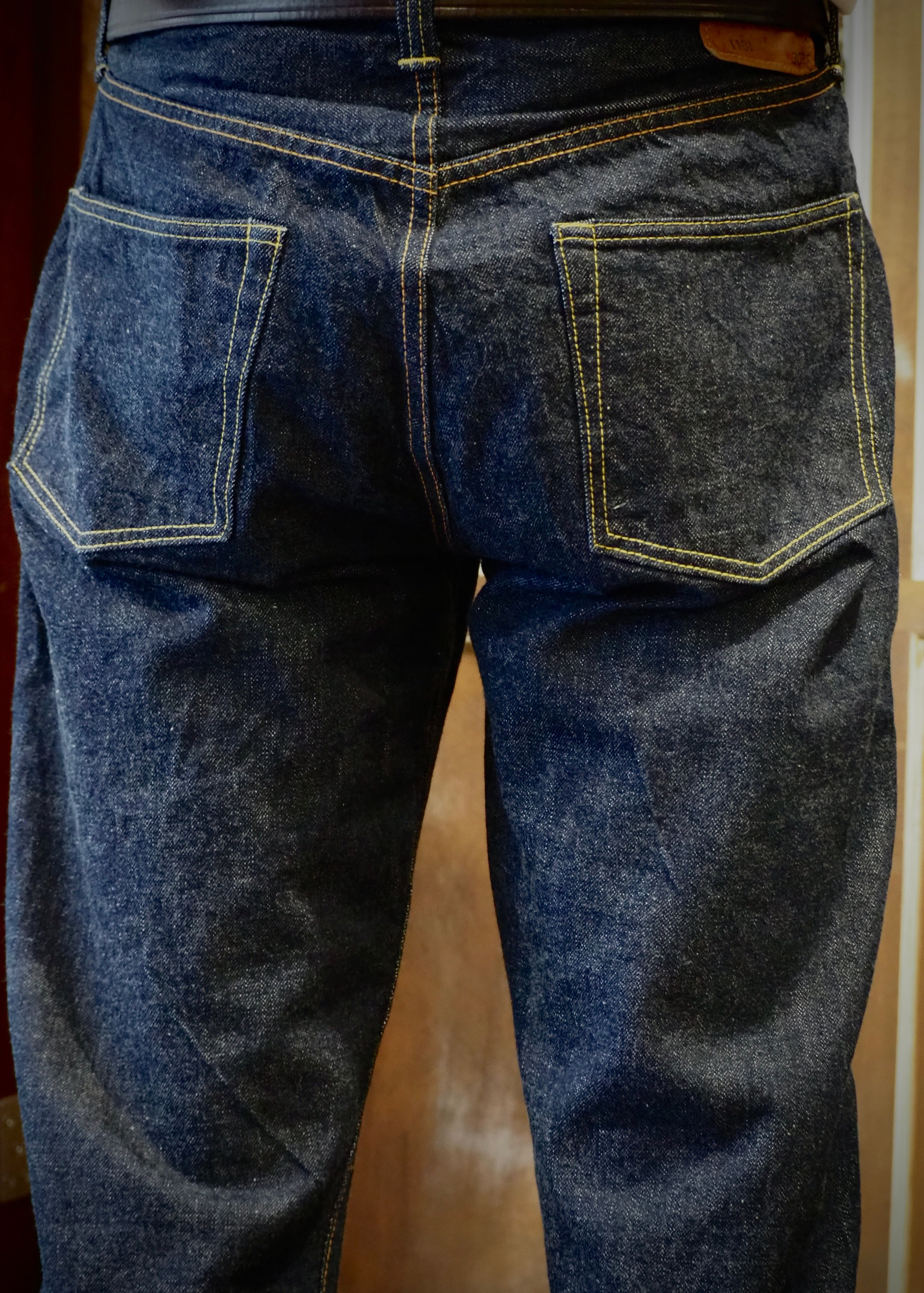 0105よりも細く1108よりも太いプレーンなシルエット。唯一、コア・ヤーン糸をバックヨークに使用しておりましたが、今回のシルエットチェンジにあたりカタン糸に変更。ジャストサイズで穿いてこそ味わえる、バックスタイルの美しさににもこだわった一本となっております。