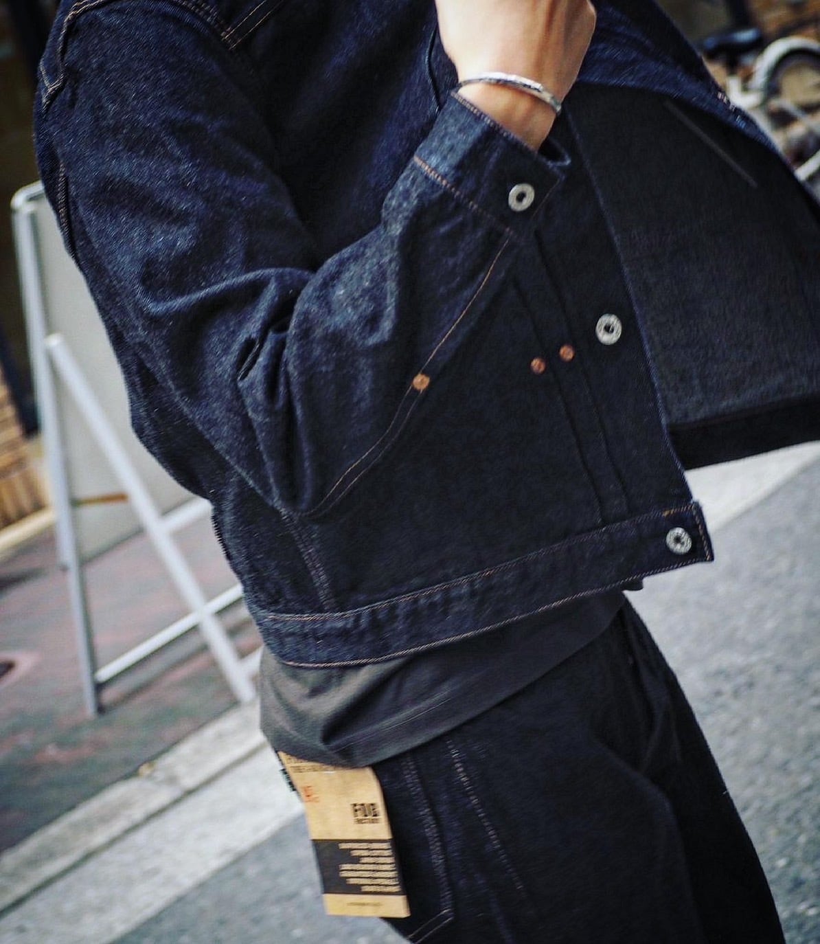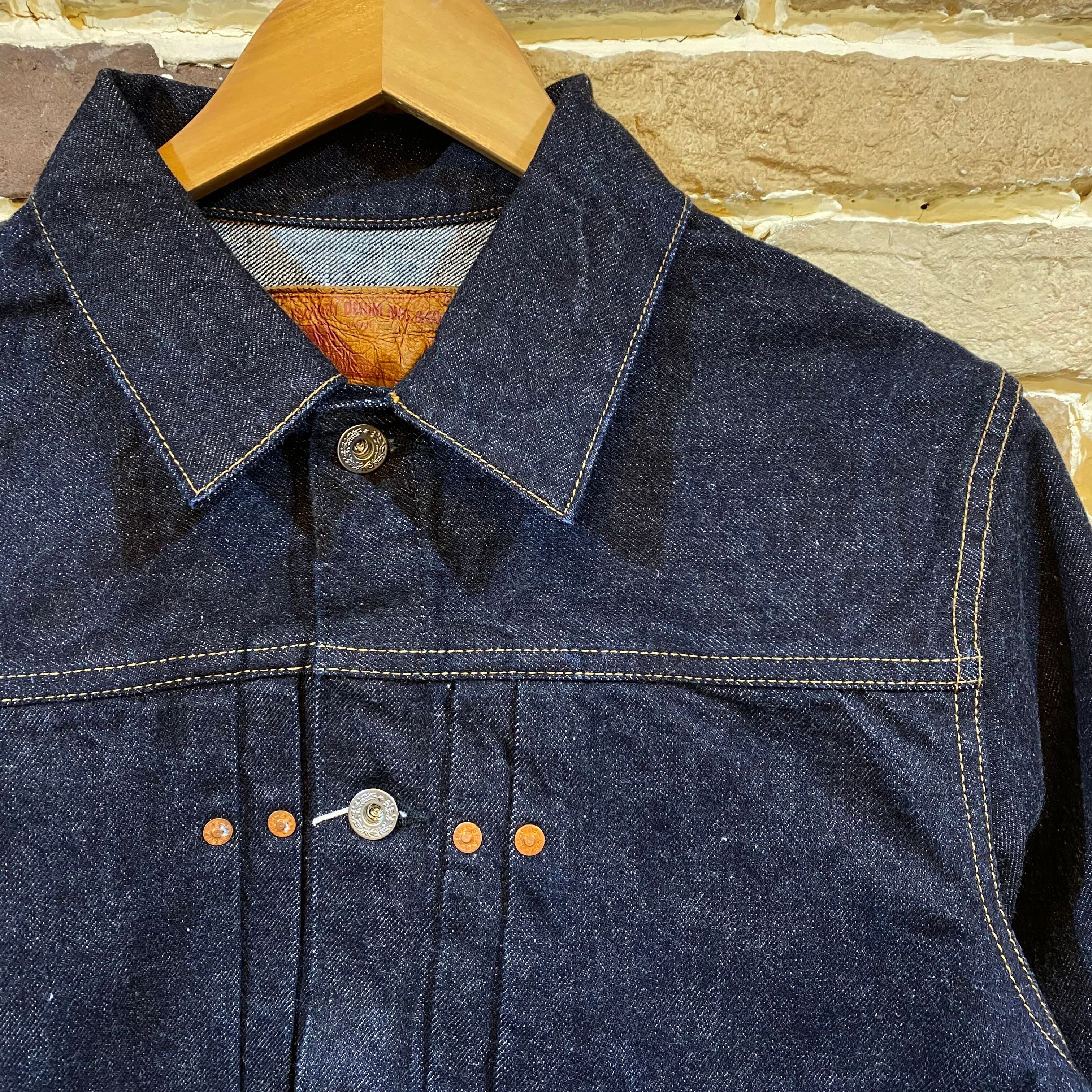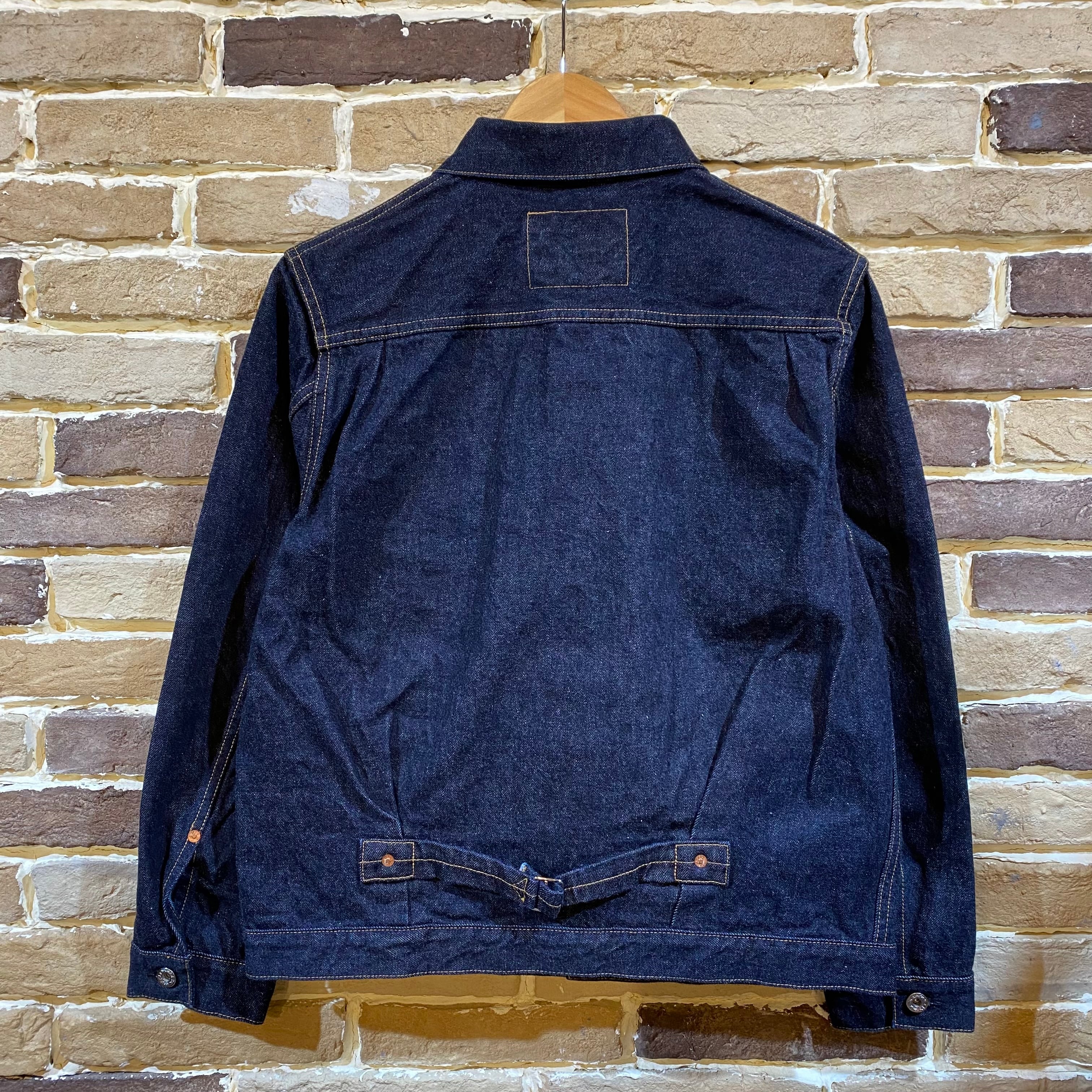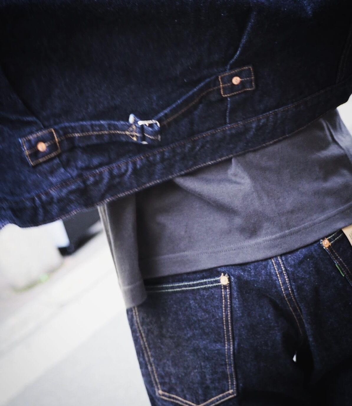 大戦モデルをアレンジしラギッドな雰囲気に仕上がったデニムジャケット14.75ozのオリジナルセルビッチデニムを用いて全て綿糸で縫製している。