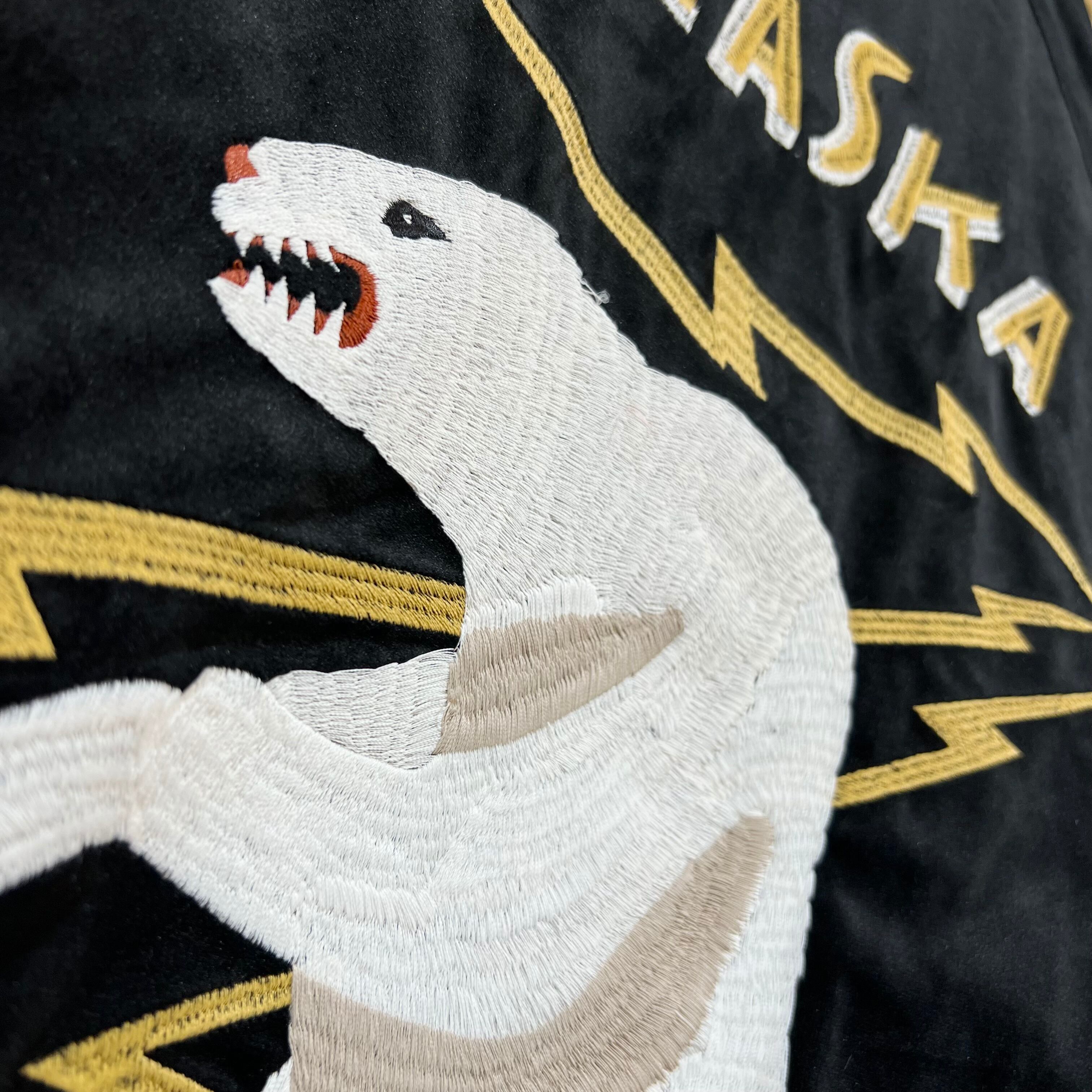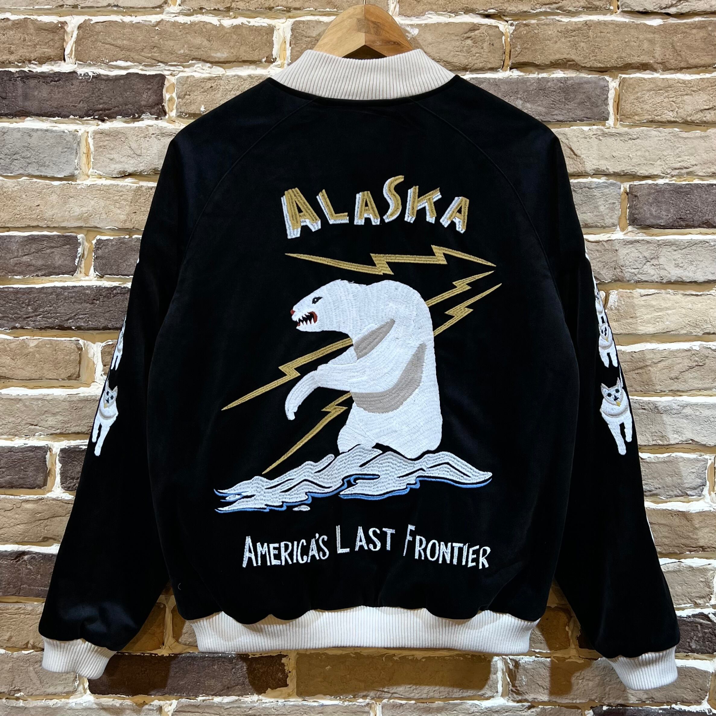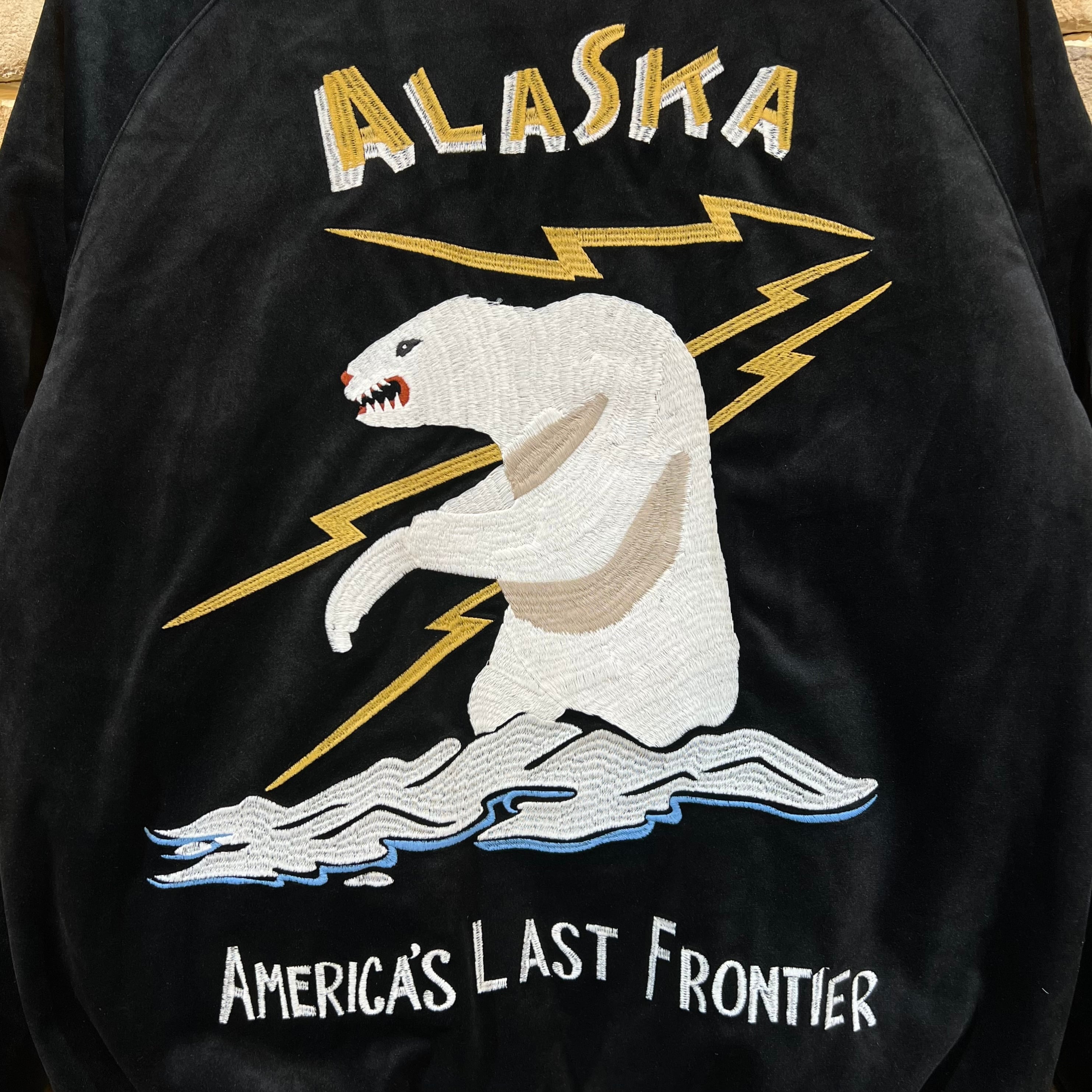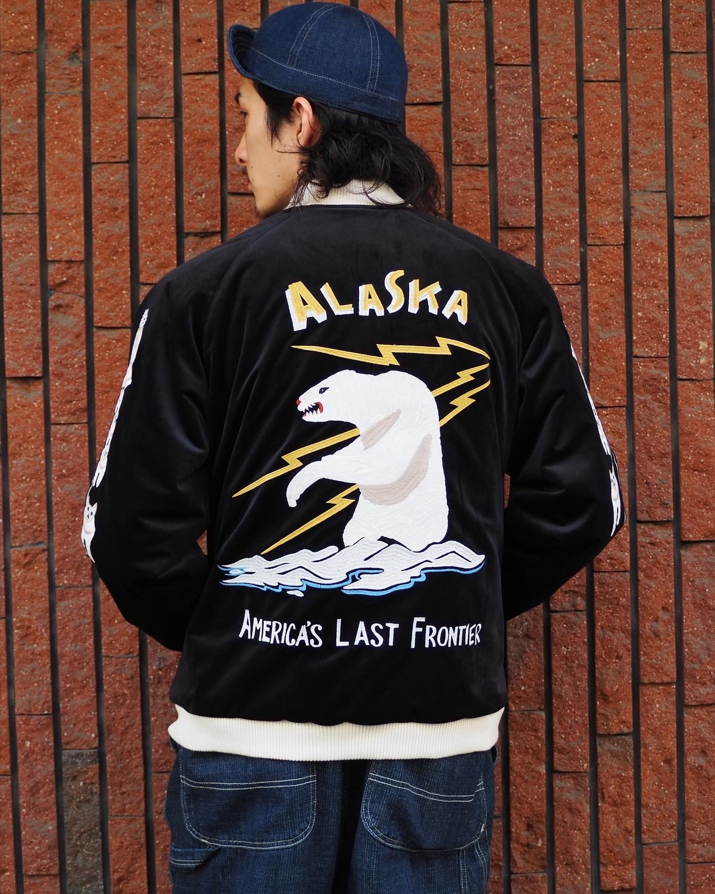 アラスカジャケットは1950年代にアラスカにある米軍基地の依頼で作られたアラスカモチーフのスカジャンで、両胸とバックにはシロクマ、袖部分には犬ゾリの刺繍が施されています。