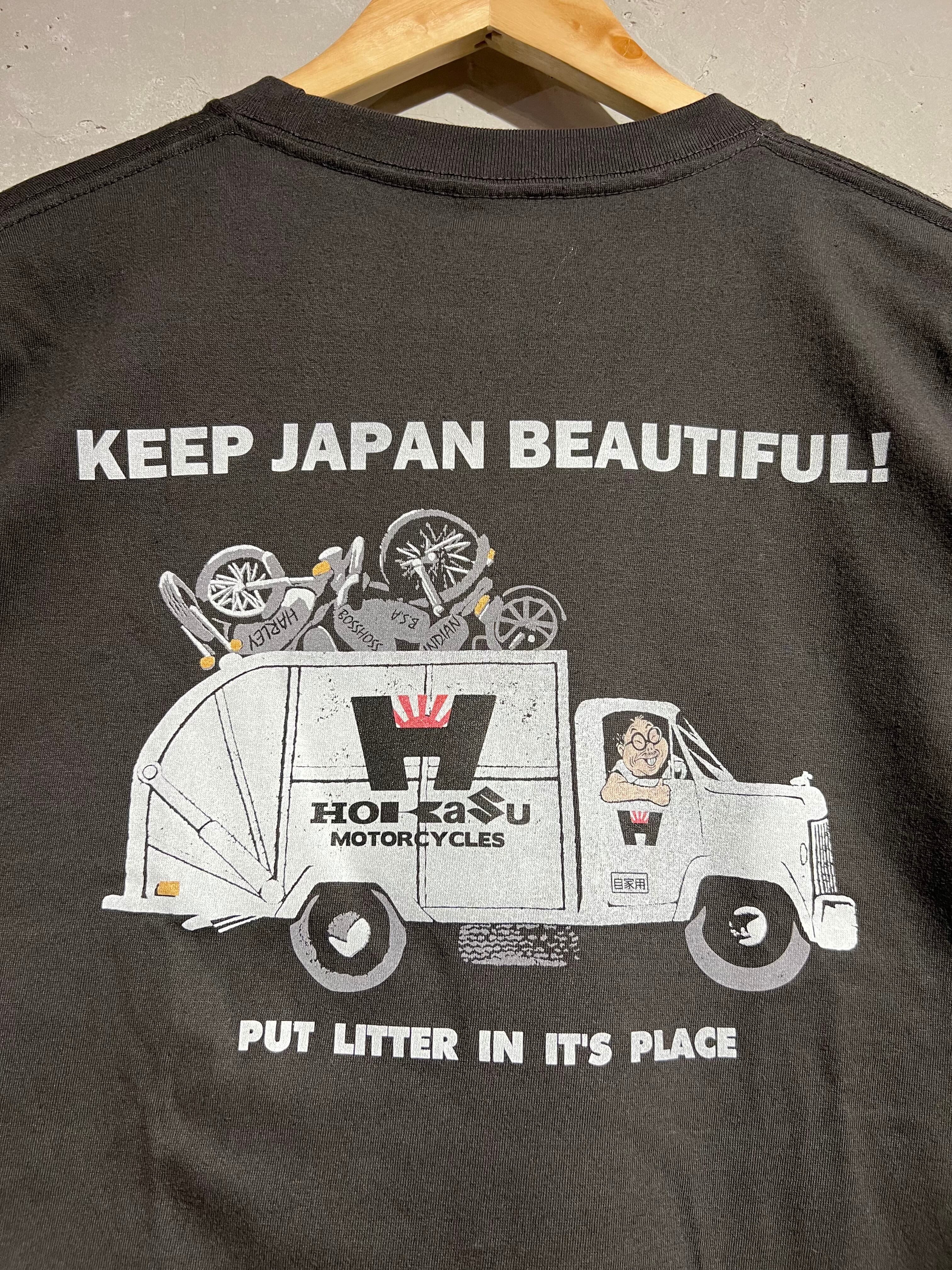 正面には〝Says Buy Japanese Product〟の標識ワンポイント、バックプリントには戦時中よくアメリカのアニメや風刺画で描かれた日本人を表現したおじさんがアメ車を無造作に積んでいるイラストをプリントしています。