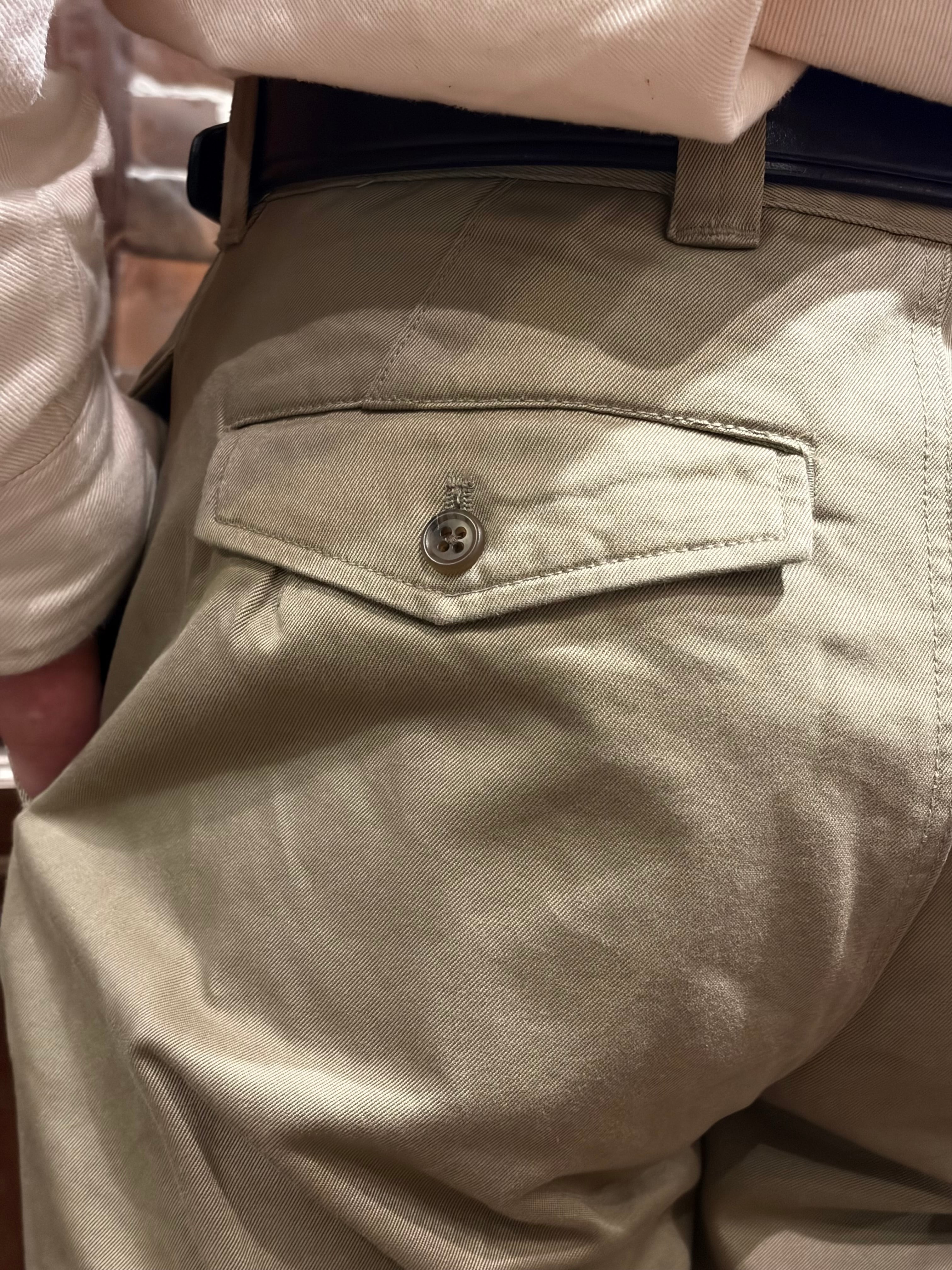 フランスM52パンツの特徴でもあるフロントの2タックが機能的なゆとりとアクセントになり、